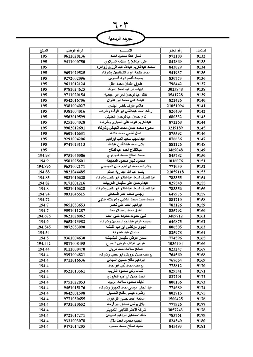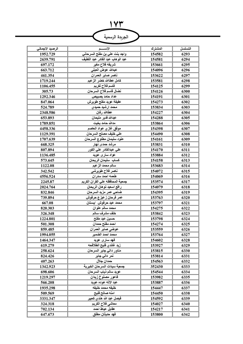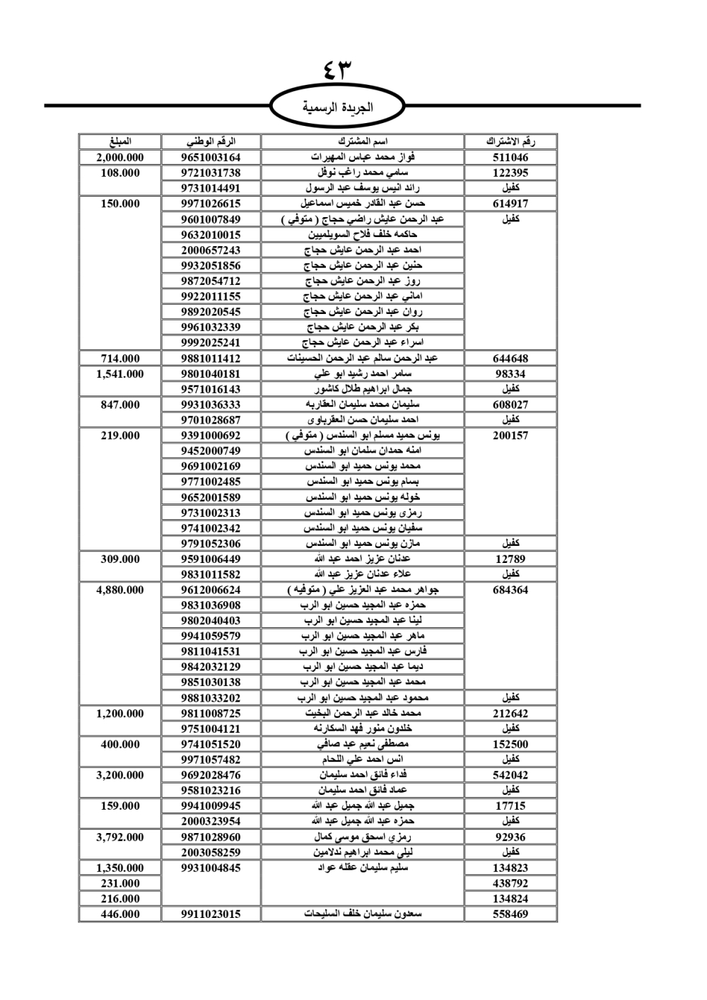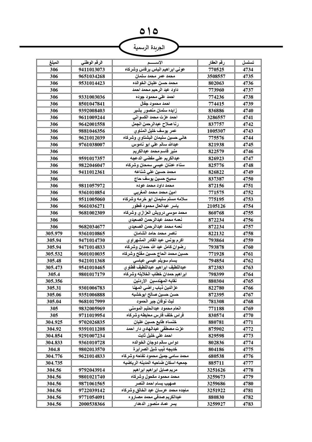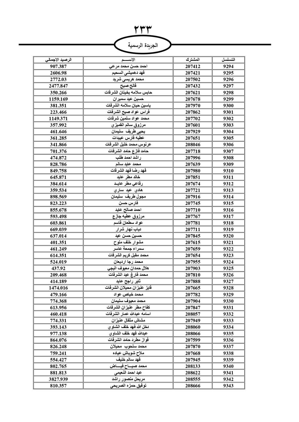 دعت سلطة المياه وبلدية الزرقاء، عشرات آلاف الأردنيين الواردة أسماؤهم بالكشوفات المرفقة، إلى ضرورة مراجعتها لتسوية أوضاعهم المالية كونه ترتب عليهم ذمم مالية، وذلك لتجنب الحجز على الأموال المنقولة وغير المنقولة بعد انقضاء 60 يوما من تاريخ النشر، علما أنه تم نشر هذه الأسماء في الجريدة الرسمية بتاريخ 16/2/2025.