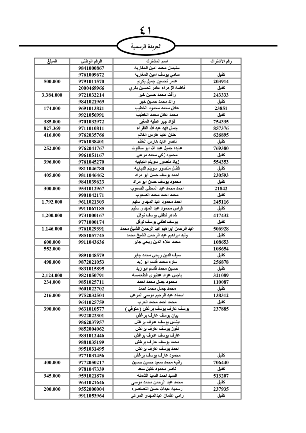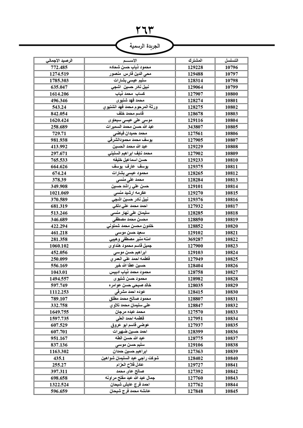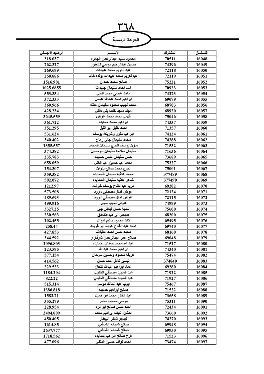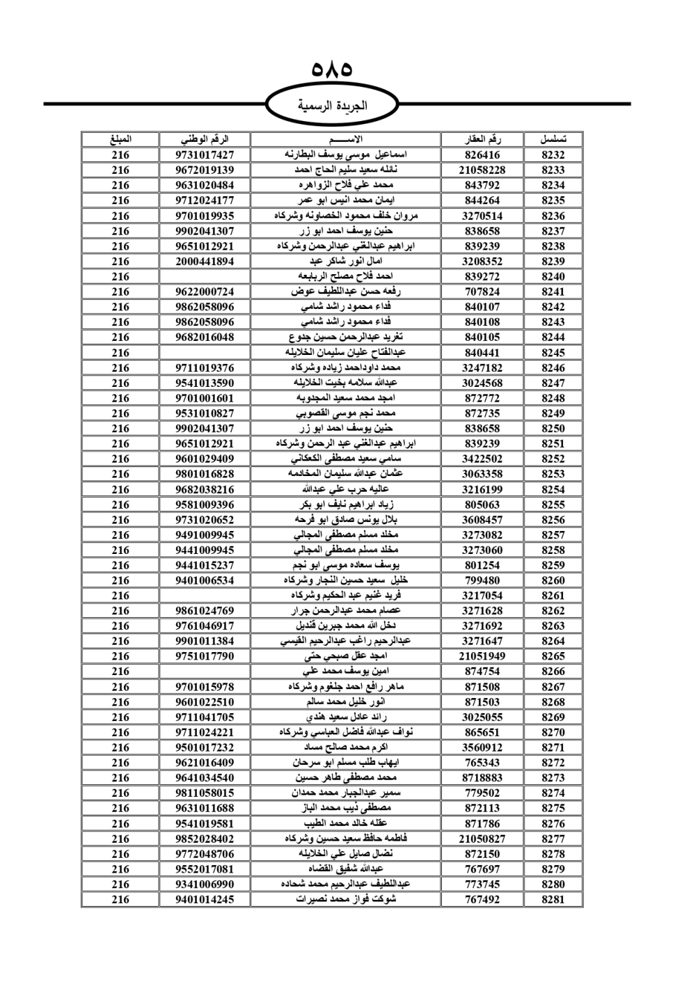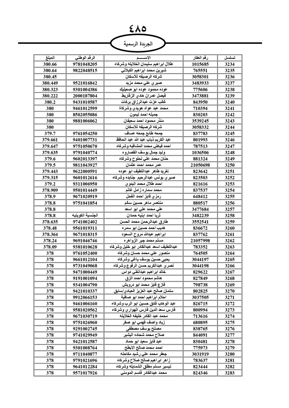 دعت سلطة المياه وبلدية الزرقاء، عشرات آلاف الأردنيين الواردة أسماؤهم بالكشوفات المرفقة، إلى ضرورة مراجعتها لتسوية أوضاعهم المالية كونه ترتب عليهم ذمم مالية، وذلك لتجنب الحجز على الأموال المنقولة وغير المنقولة بعد انقضاء 60 يوما من تاريخ النشر، علما أنه تم نشر هذه الأسماء في الجريدة الرسمية بتاريخ 16/2/2025.