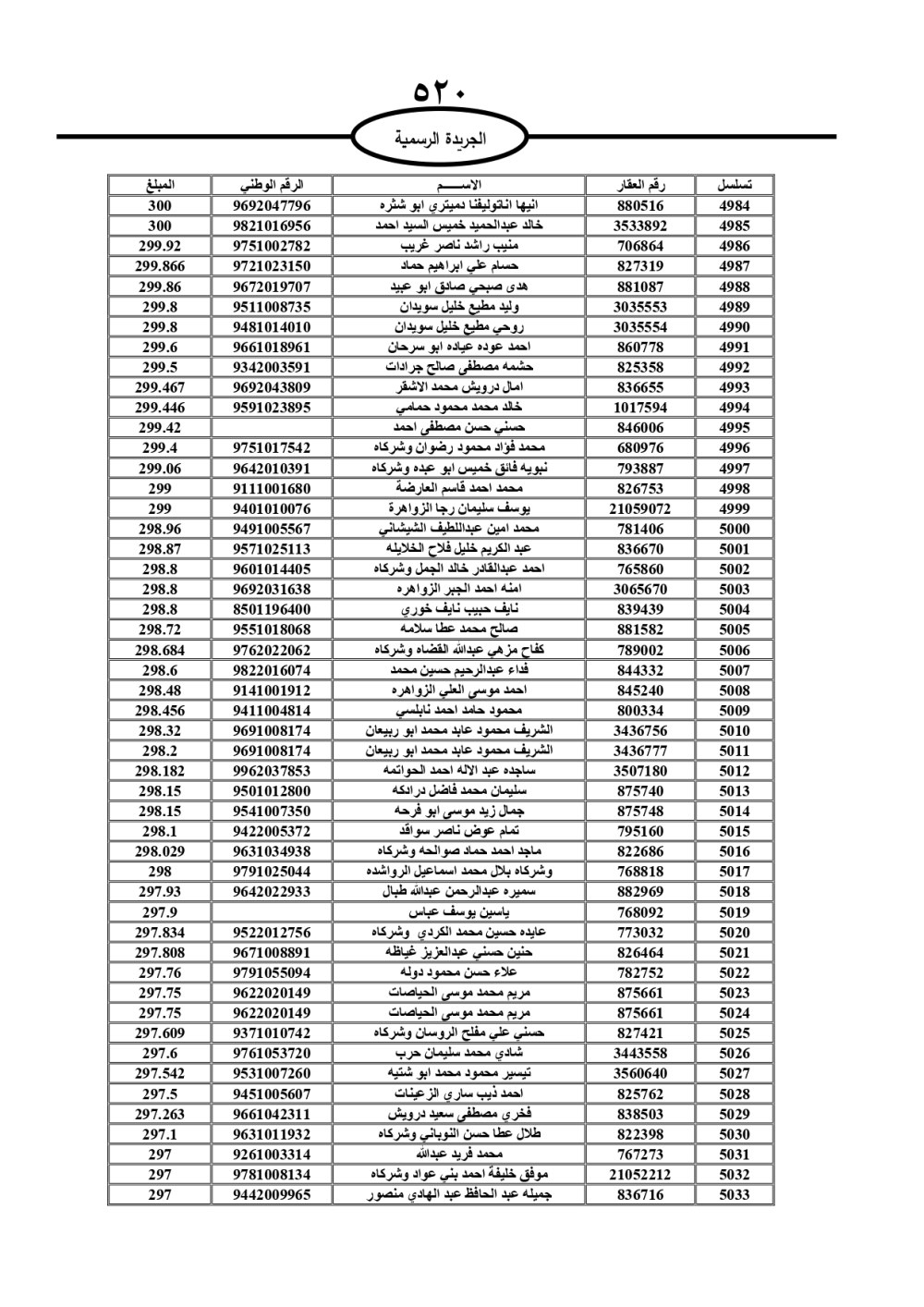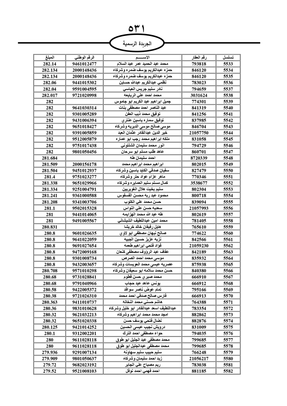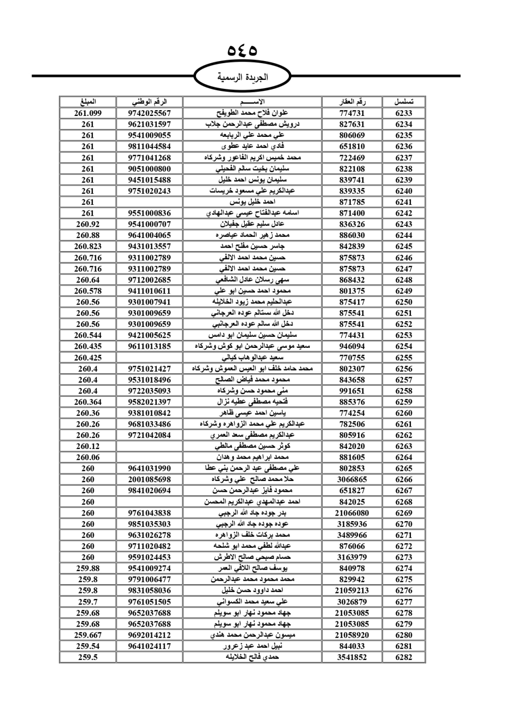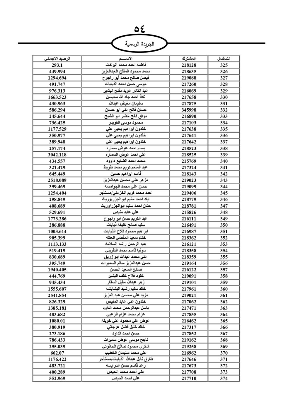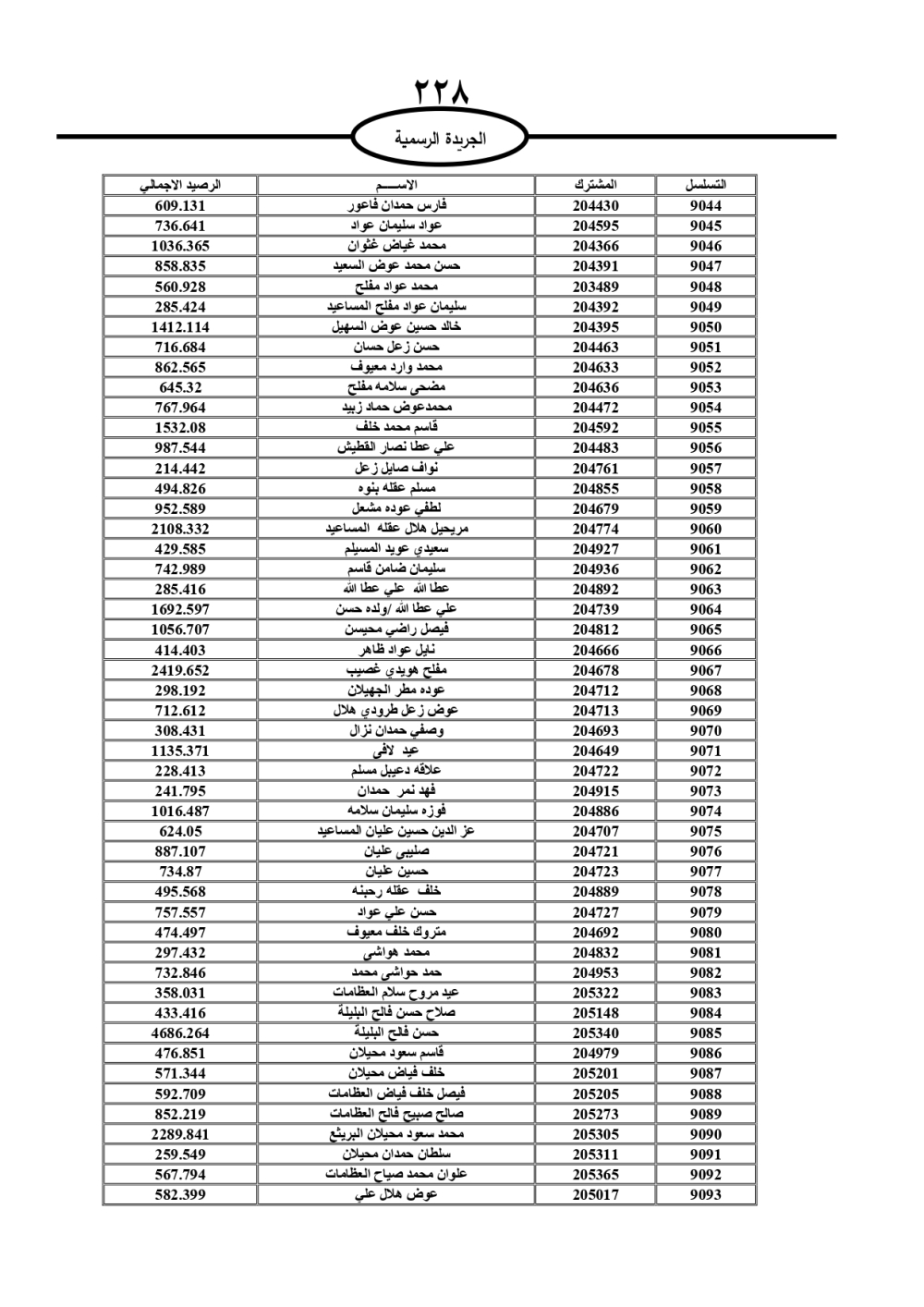 دعت سلطة المياه وبلدية الزرقاء، عشرات آلاف الأردنيين الواردة أسماؤهم بالكشوفات المرفقة، إلى ضرورة مراجعتها لتسوية أوضاعهم المالية كونه ترتب عليهم ذمم مالية، وذلك لتجنب الحجز على الأموال المنقولة وغير المنقولة بعد انقضاء 60 يوما من تاريخ النشر، علما أنه تم نشر هذه الأسماء في الجريدة الرسمية بتاريخ 16/2/2025.