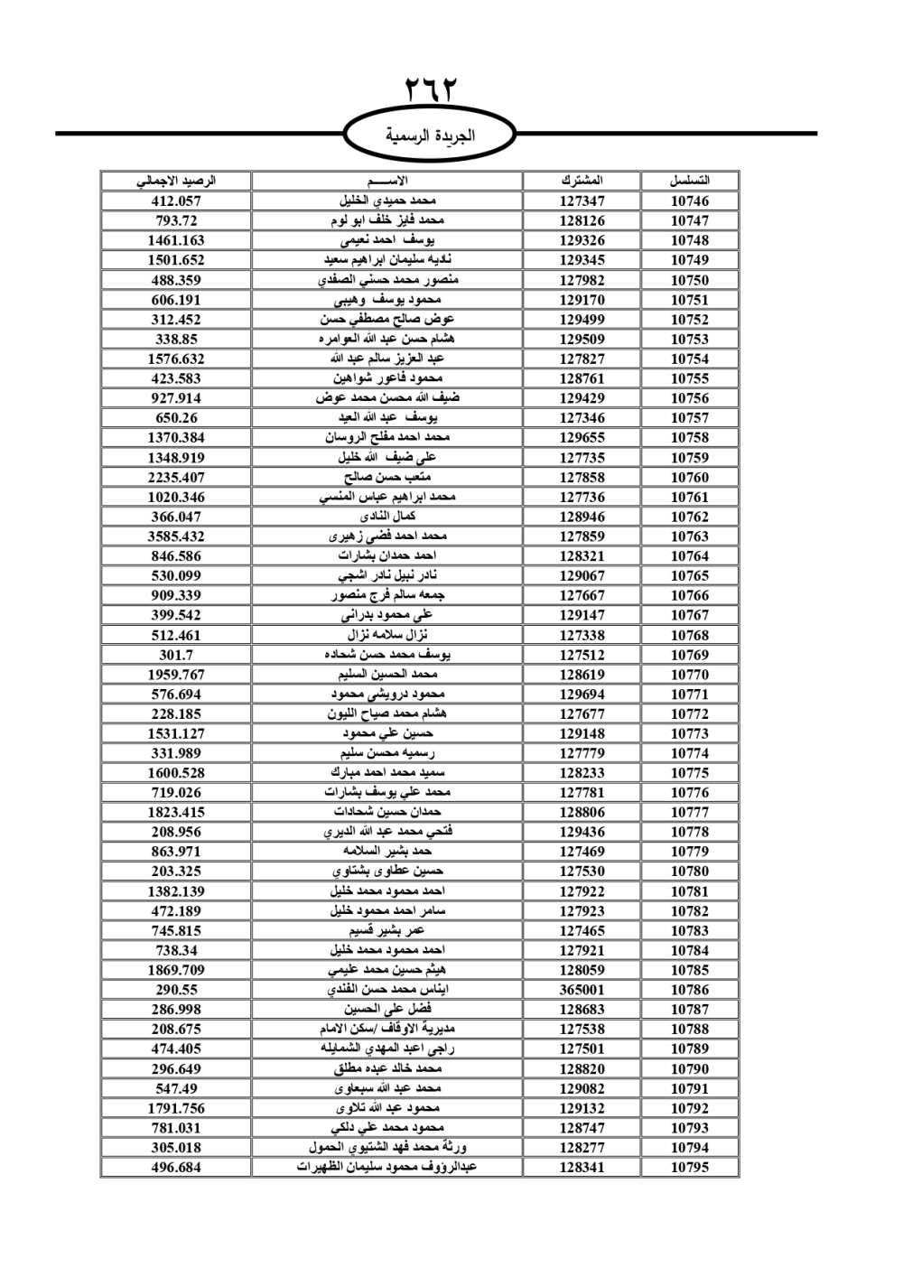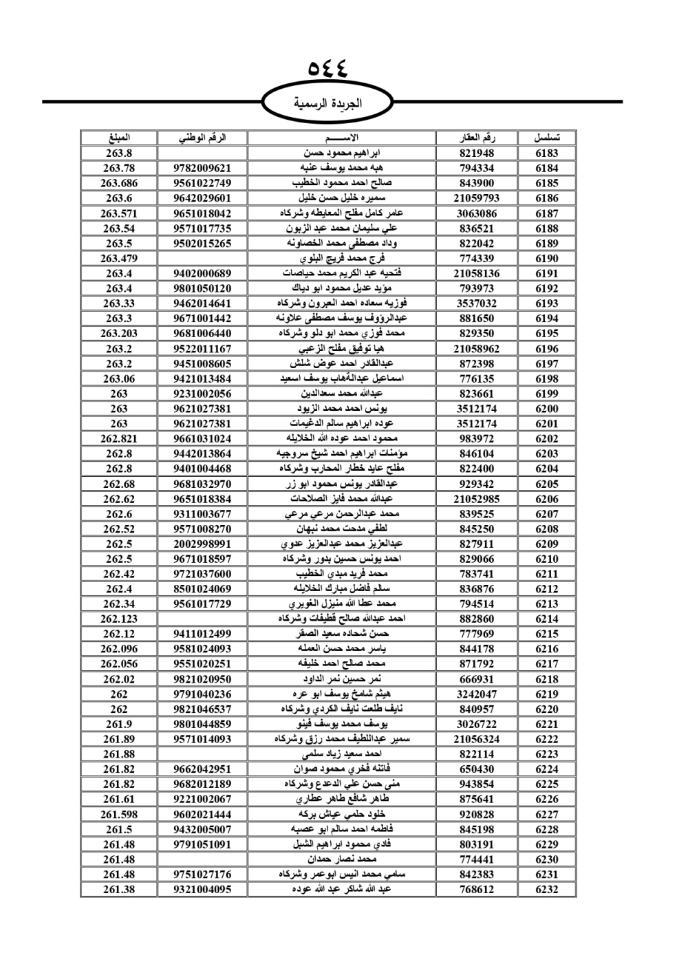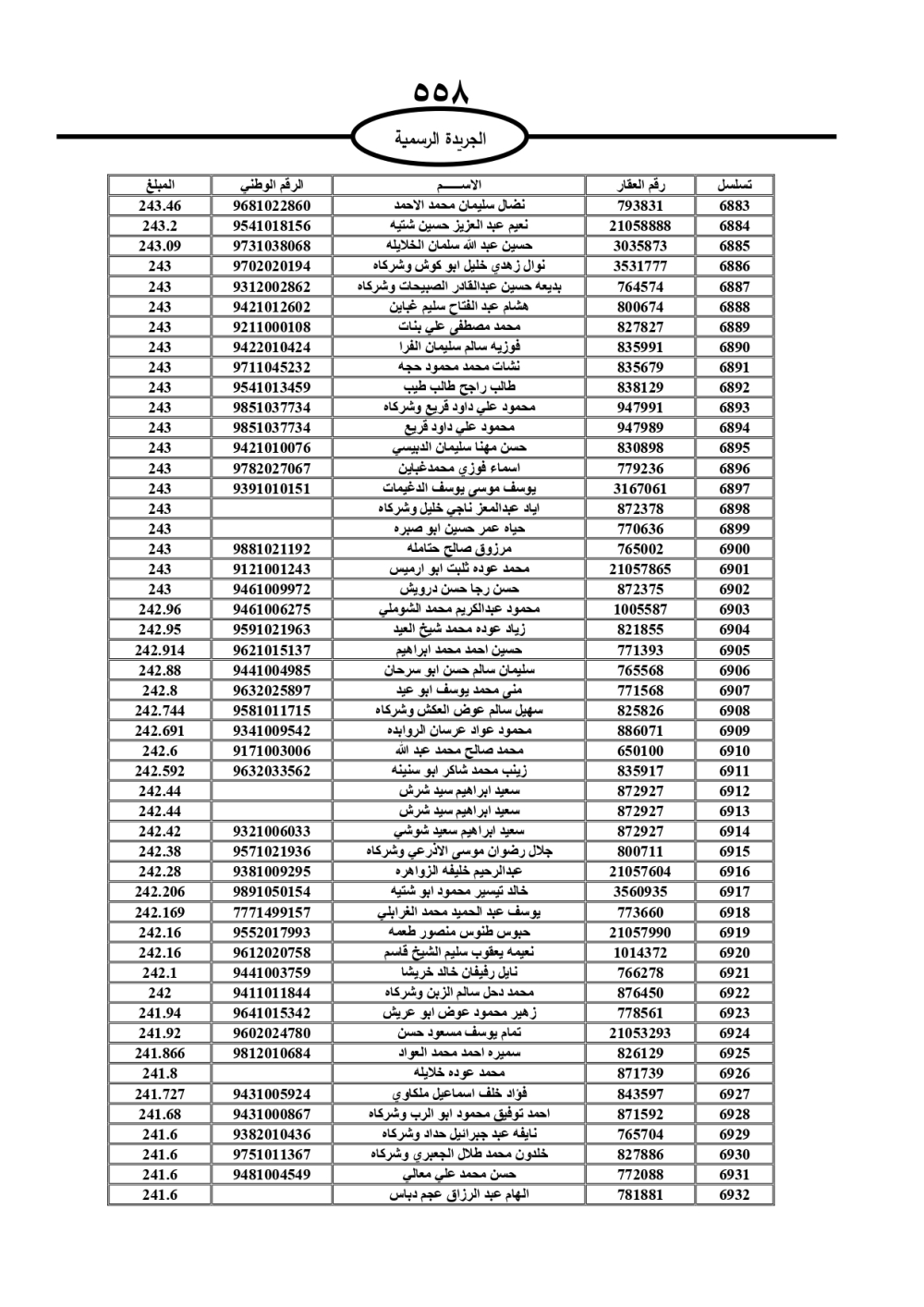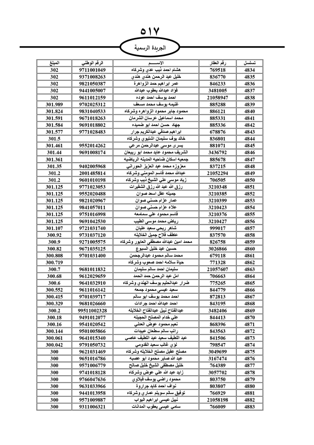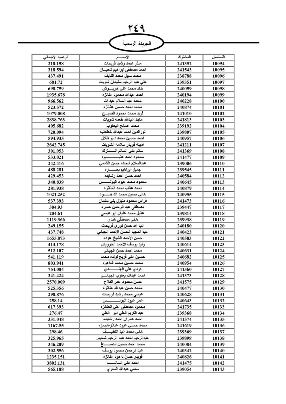 دعت سلطة المياه وبلدية الزرقاء، عشرات آلاف الأردنيين الواردة أسماؤهم بالكشوفات المرفقة، إلى ضرورة مراجعتها لتسوية أوضاعهم المالية كونه ترتب عليهم ذمم مالية، وذلك لتجنب الحجز على الأموال المنقولة وغير المنقولة بعد انقضاء 60 يوما من تاريخ النشر، علما أنه تم نشر هذه الأسماء في الجريدة الرسمية بتاريخ 16/2/2025.