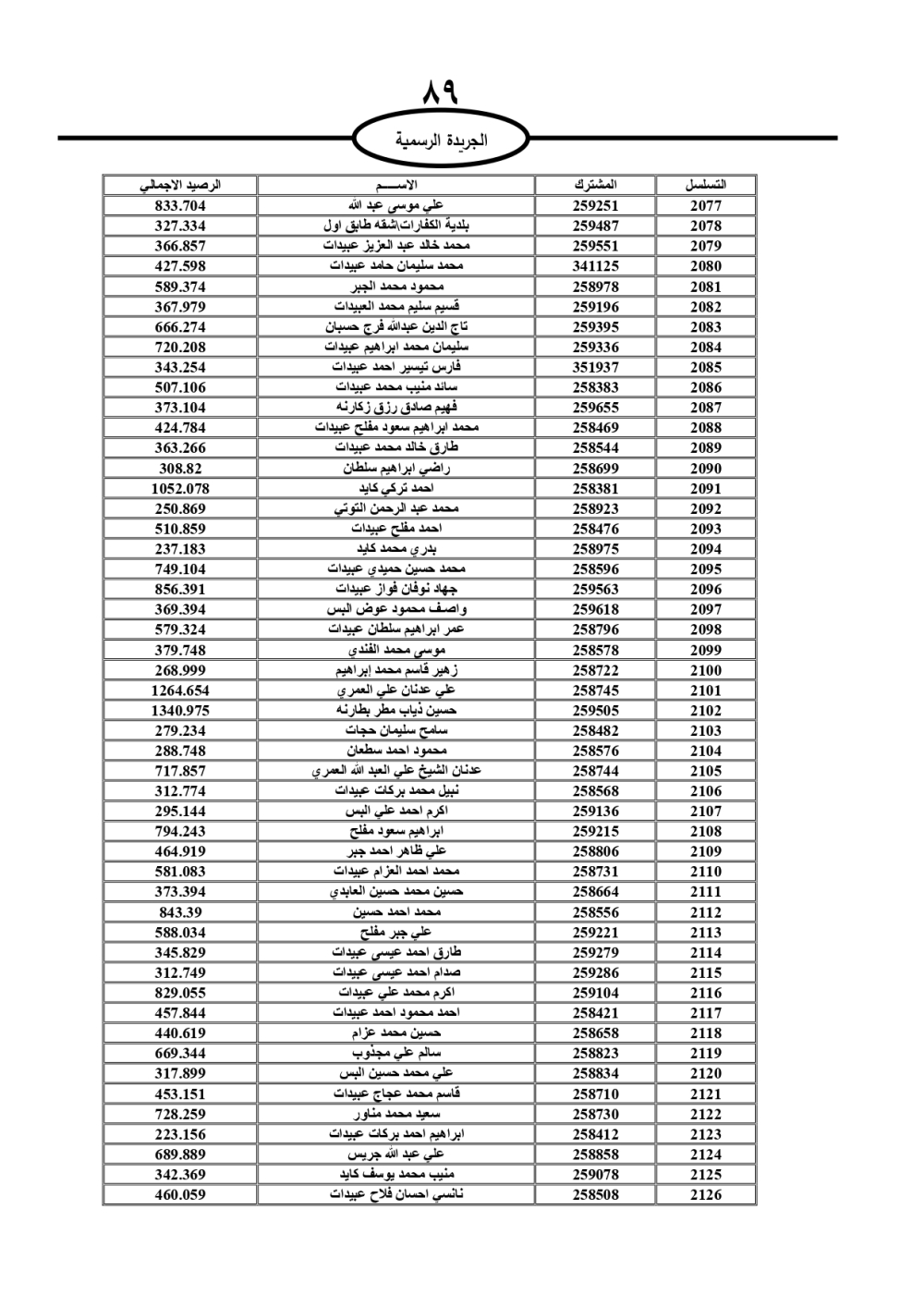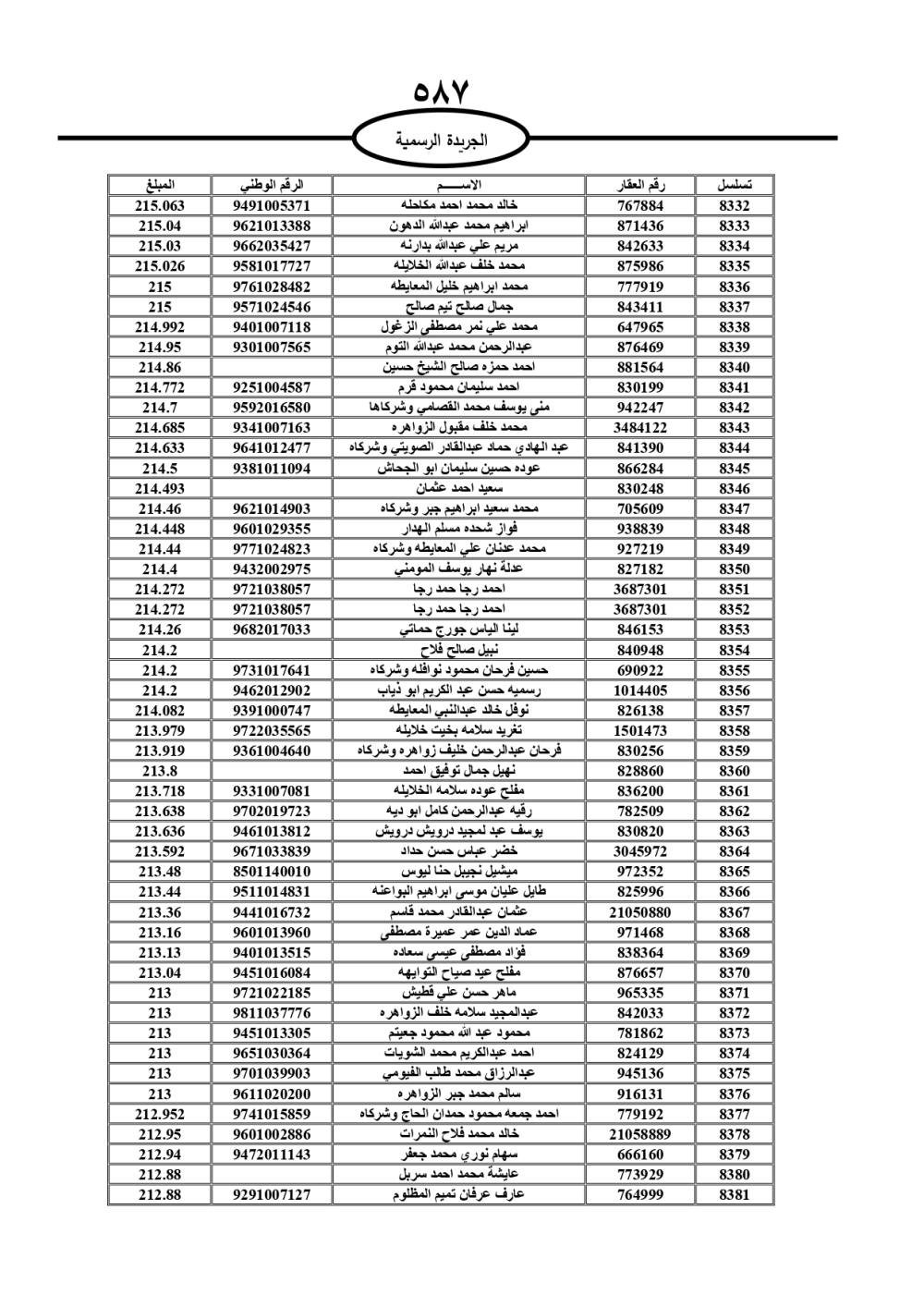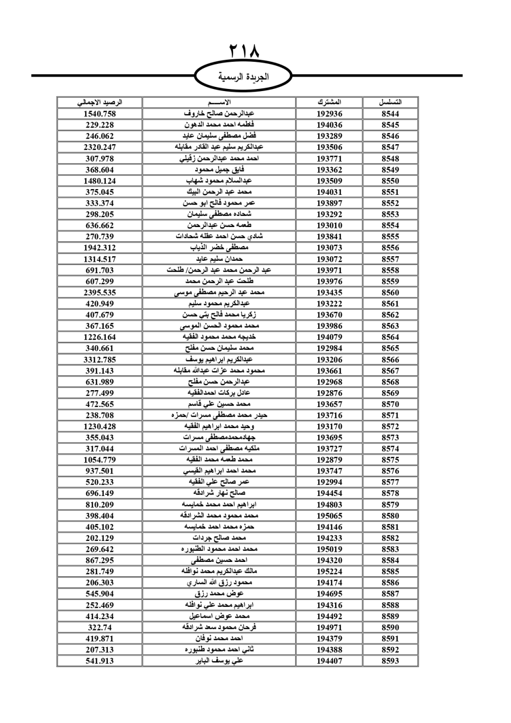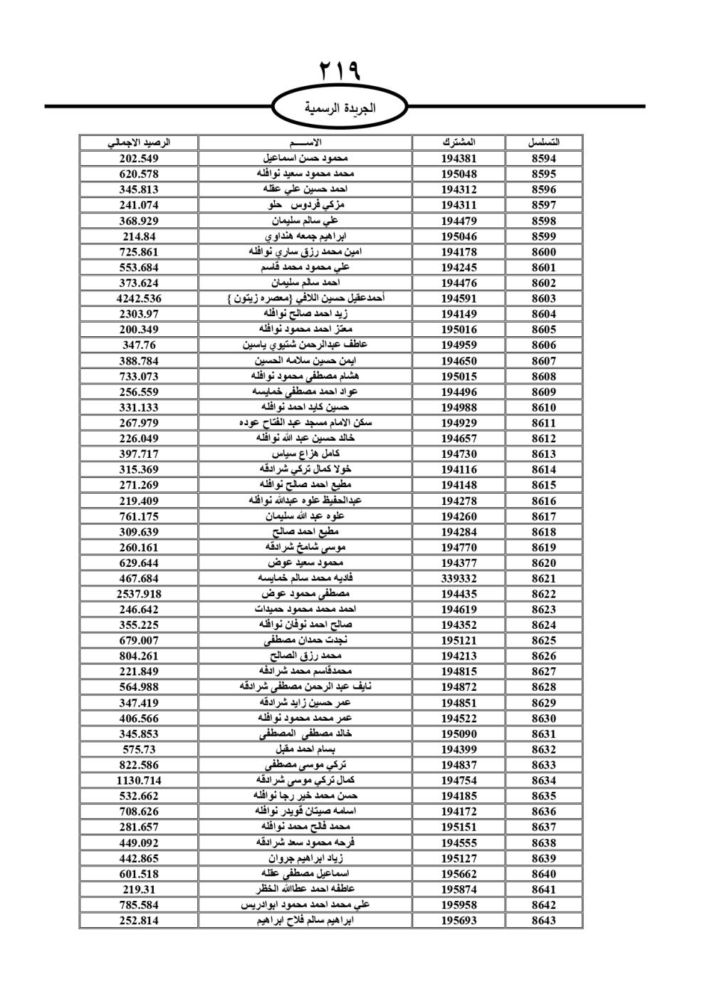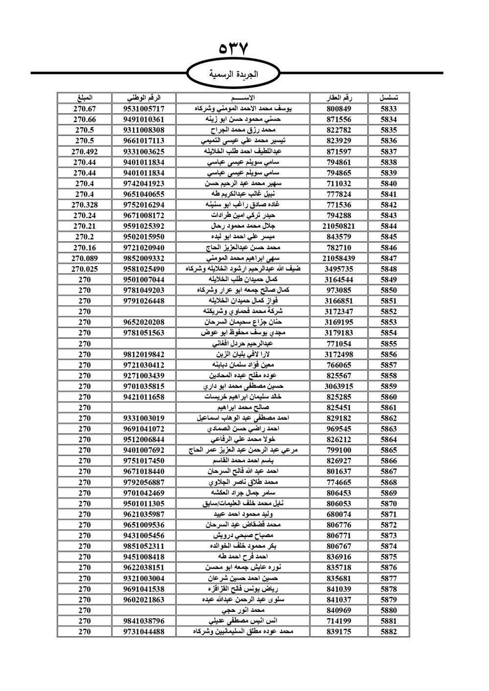 دعت سلطة المياه وبلدية الزرقاء، عشرات آلاف الأردنيين الواردة أسماؤهم بالكشوفات المرفقة، إلى ضرورة مراجعتها لتسوية أوضاعهم المالية كونه ترتب عليهم ذمم مالية، وذلك لتجنب الحجز على الأموال المنقولة وغير المنقولة بعد انقضاء 60 يوما من تاريخ النشر، علما أنه تم نشر هذه الأسماء في الجريدة الرسمية بتاريخ 16/2/2025.
