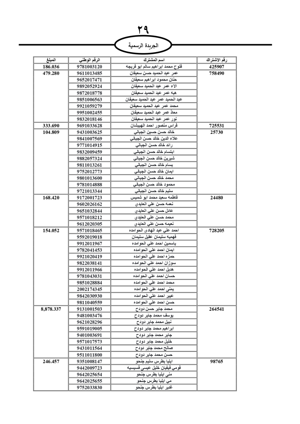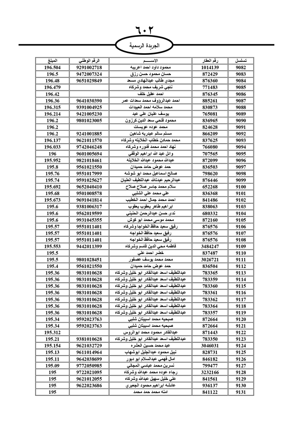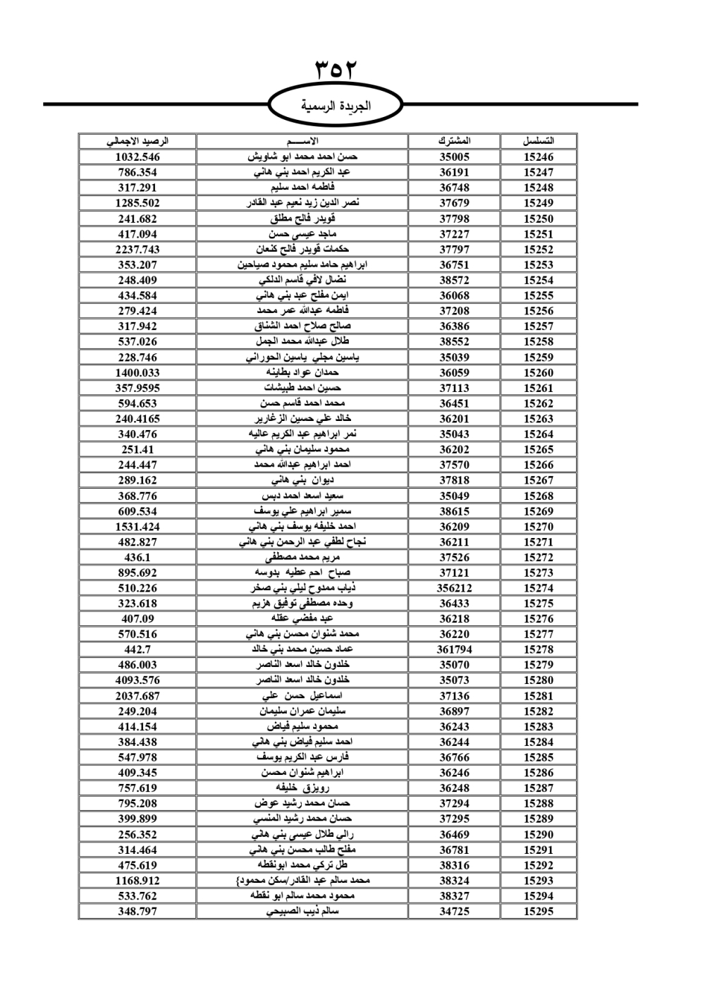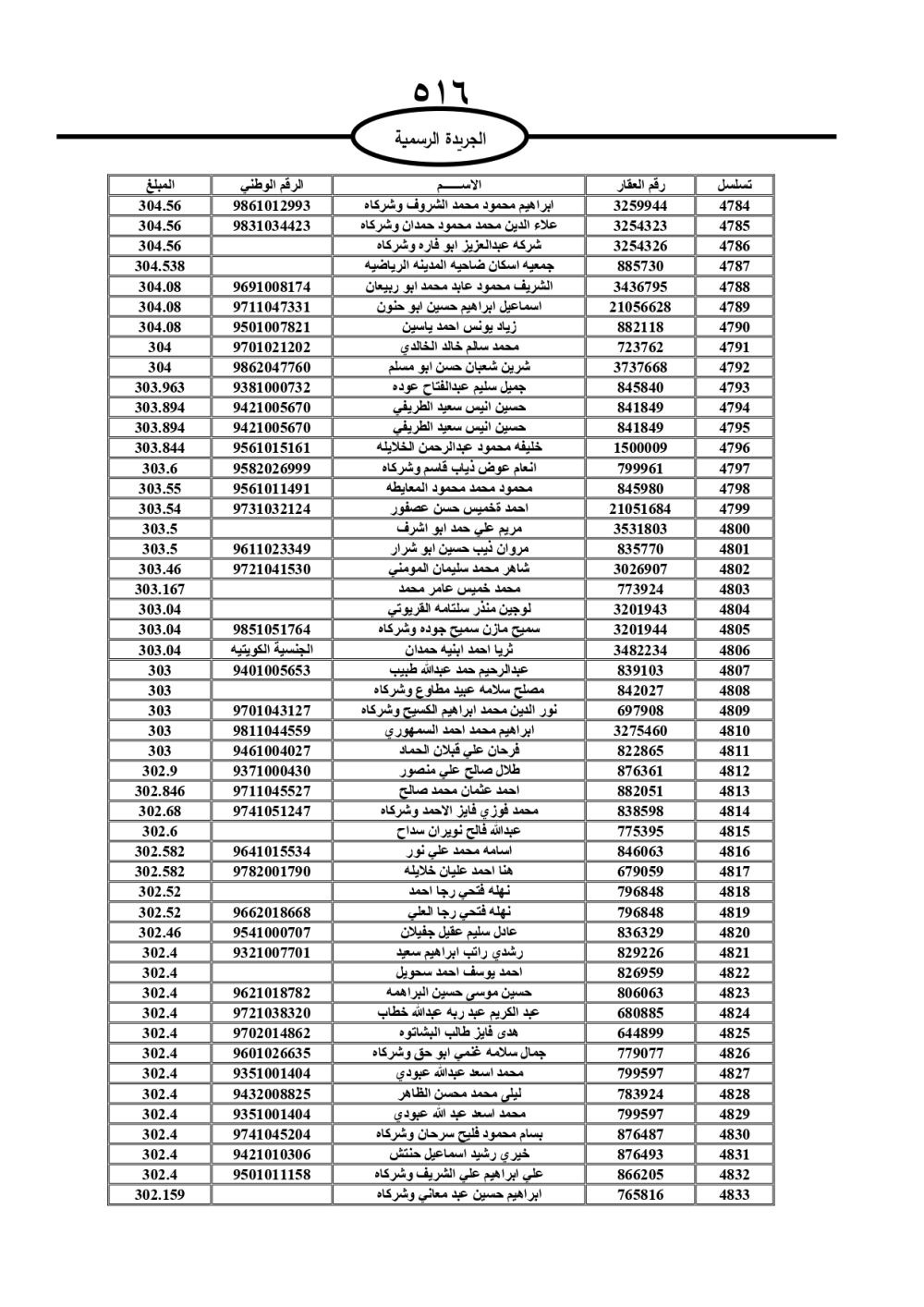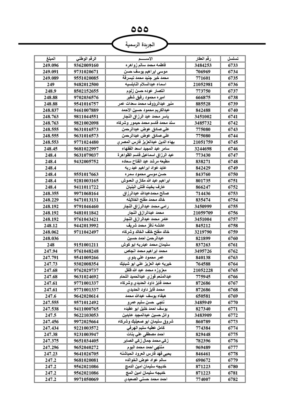 دعت سلطة المياه وبلدية الزرقاء، عشرات آلاف الأردنيين الواردة أسماؤهم بالكشوفات المرفقة، إلى ضرورة مراجعتها لتسوية أوضاعهم المالية كونه ترتب عليهم ذمم مالية، وذلك لتجنب الحجز على الأموال المنقولة وغير المنقولة بعد انقضاء 60 يوما من تاريخ النشر، علما أنه تم نشر هذه الأسماء في الجريدة الرسمية بتاريخ 16/2/2025.