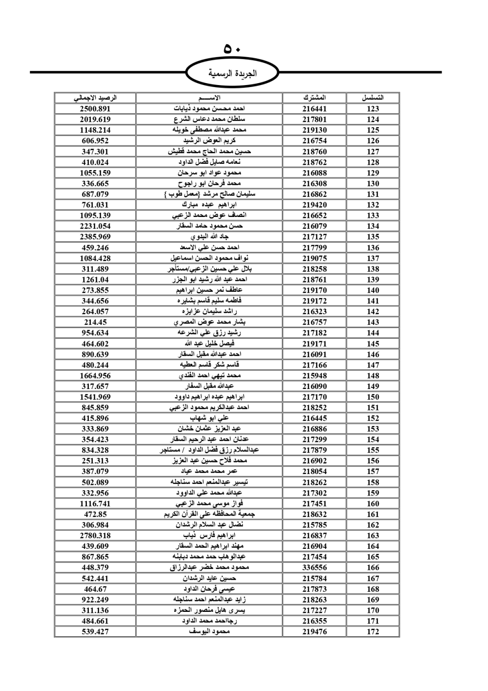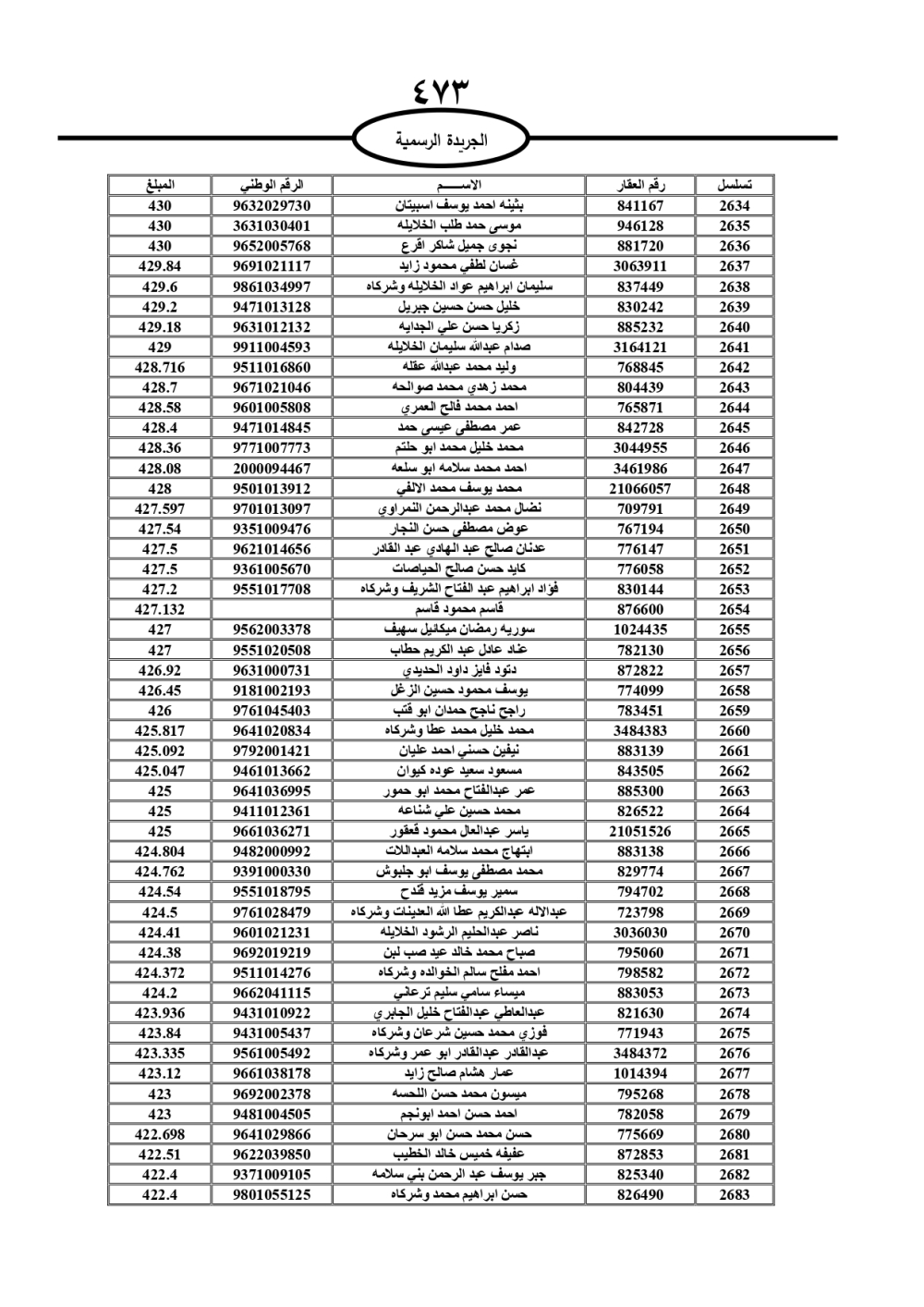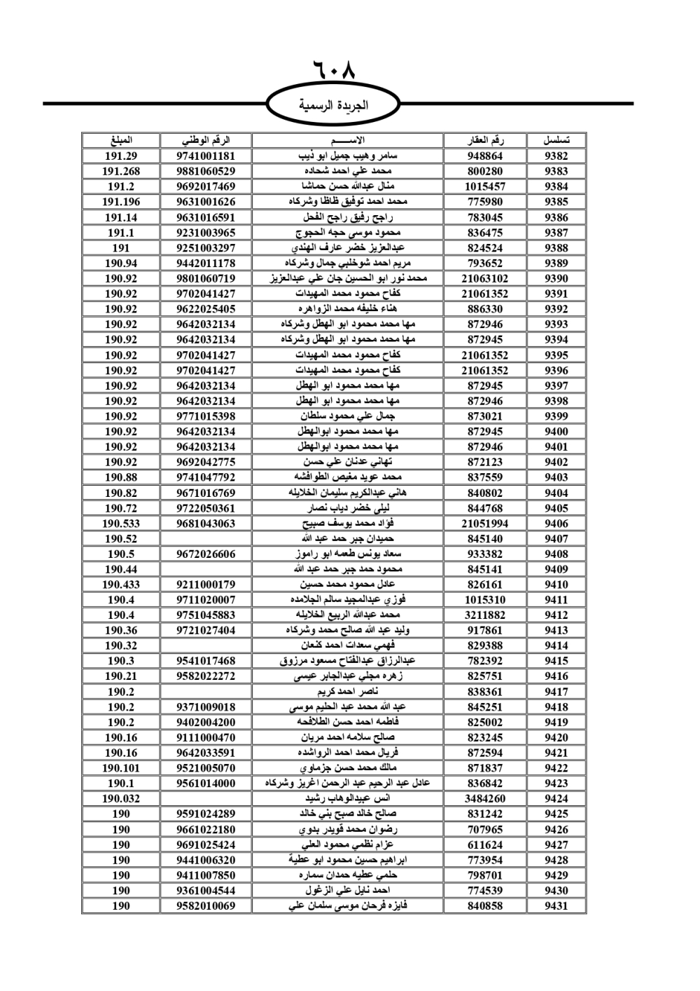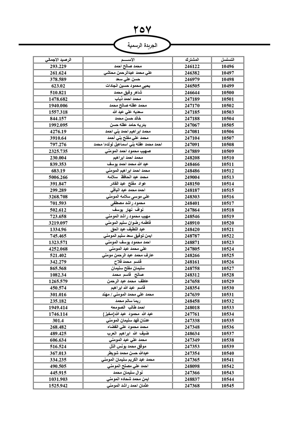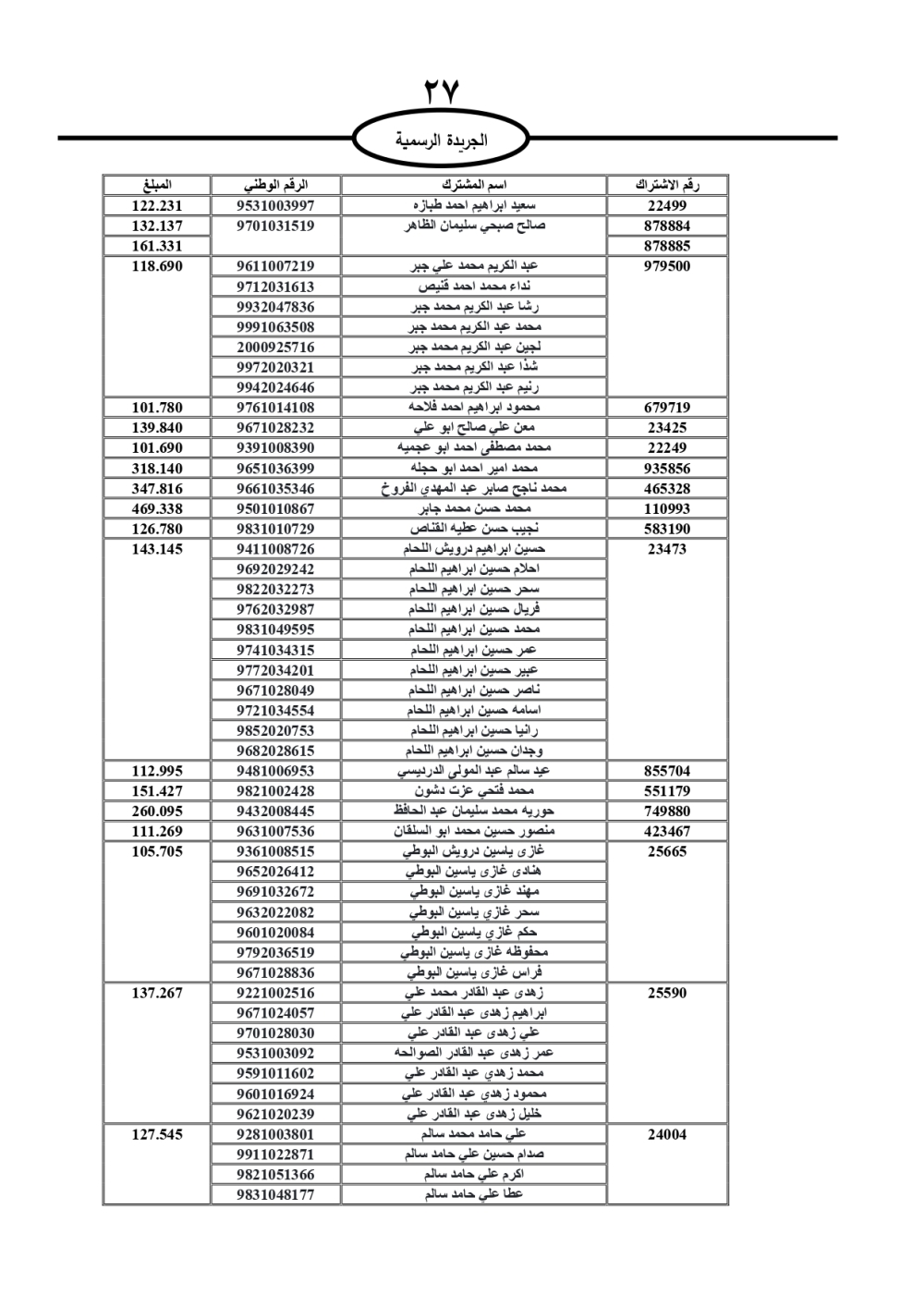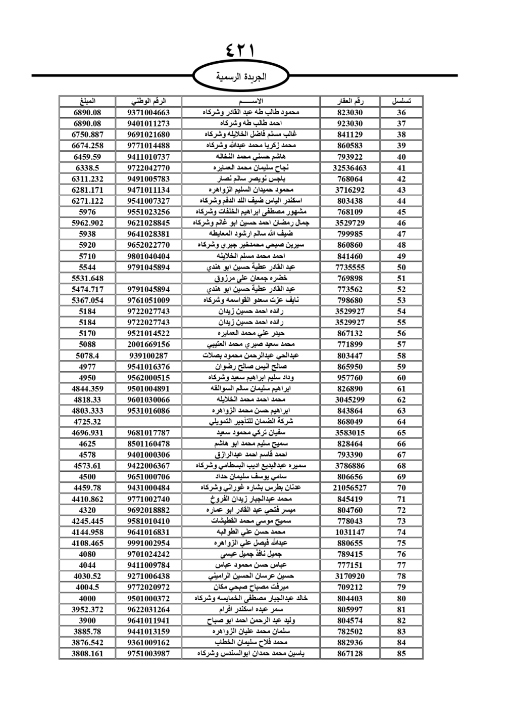 دعت سلطة المياه وبلدية الزرقاء، عشرات آلاف الأردنيين الواردة أسماؤهم بالكشوفات المرفقة، إلى ضرورة مراجعتها لتسوية أوضاعهم المالية كونه ترتب عليهم ذمم مالية، وذلك لتجنب الحجز على الأموال المنقولة وغير المنقولة بعد انقضاء 60 يوما من تاريخ النشر، علما أنه تم نشر هذه الأسماء في الجريدة الرسمية بتاريخ 16/2/2025.