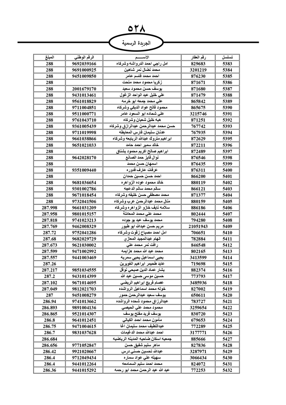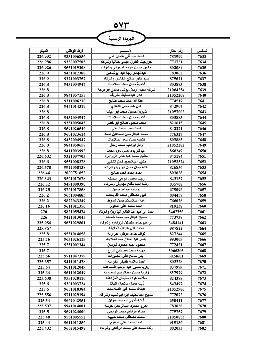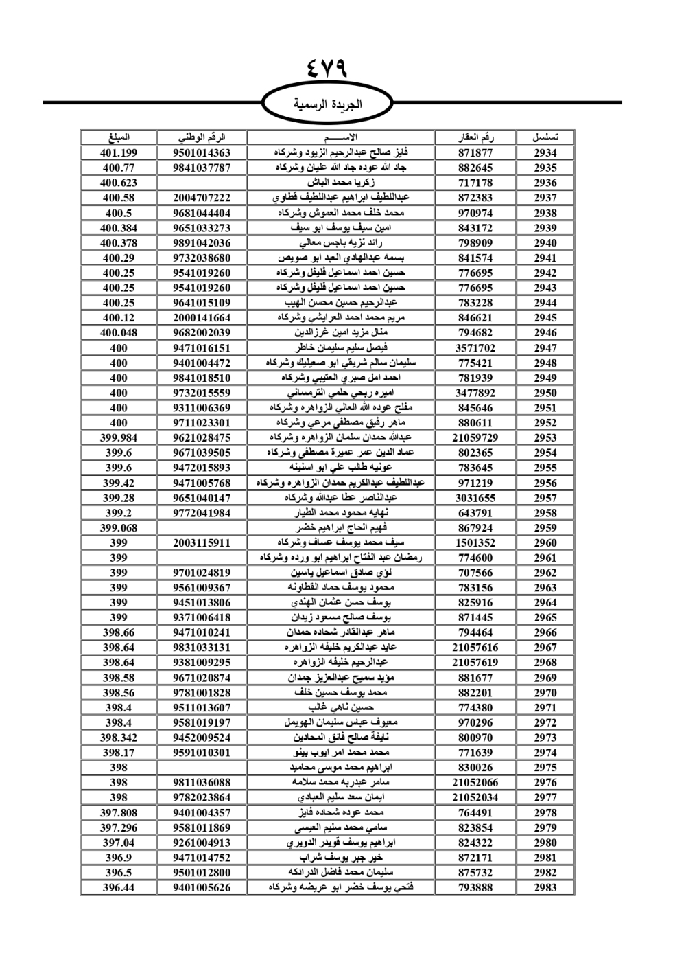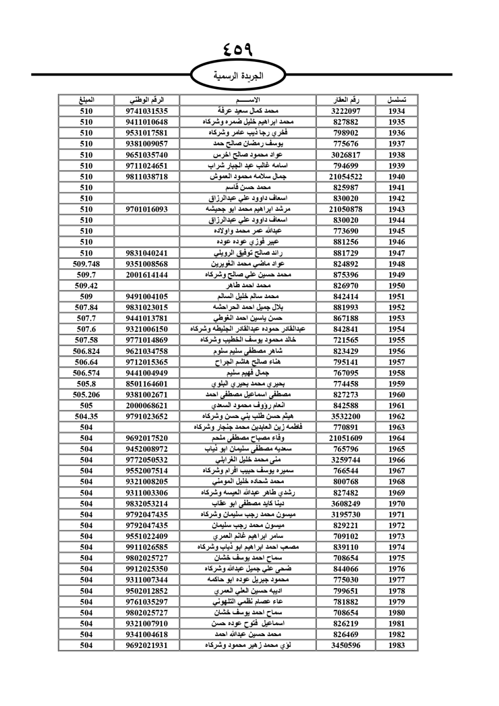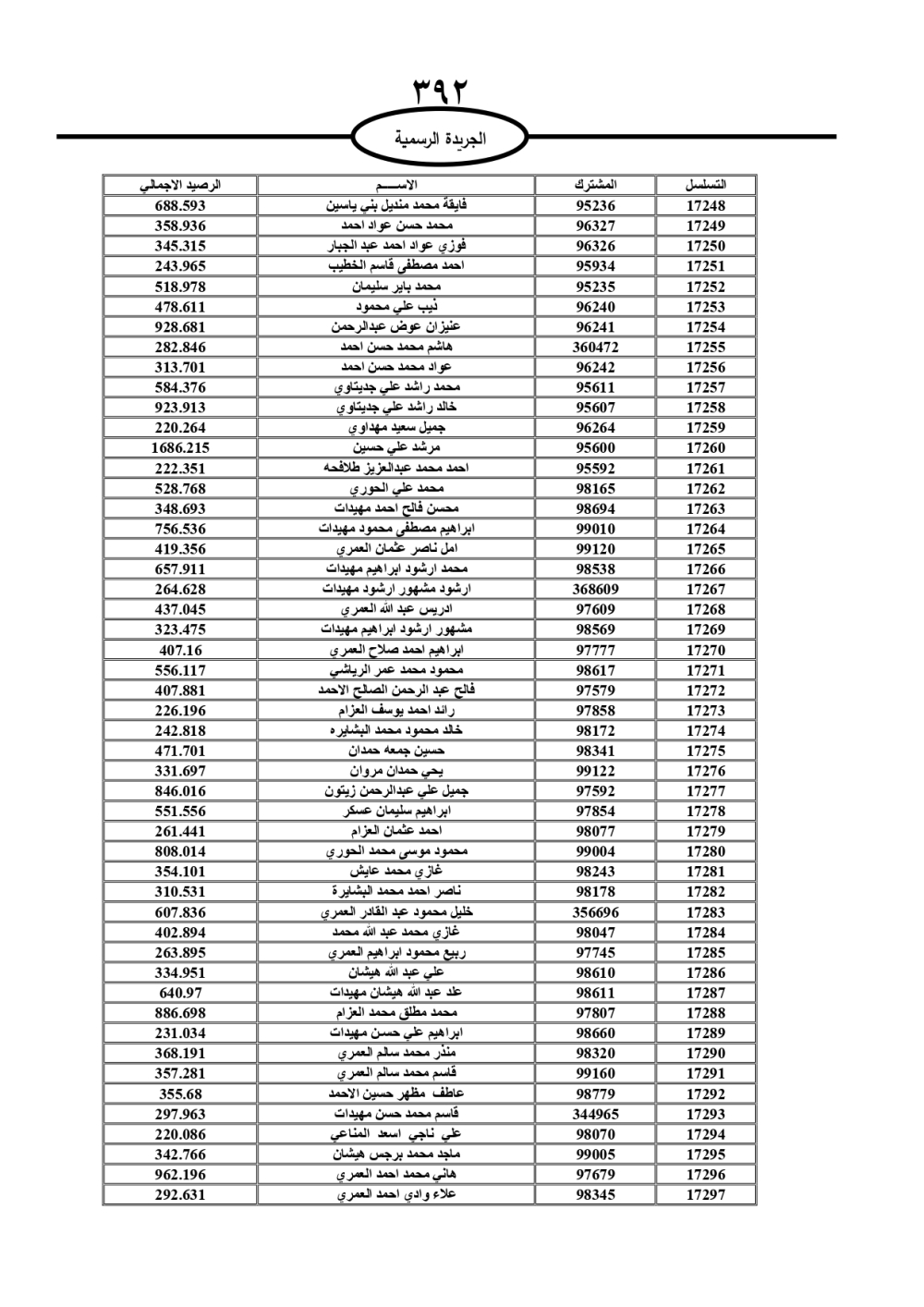 دعت سلطة المياه وبلدية الزرقاء، عشرات آلاف الأردنيين الواردة أسماؤهم بالكشوفات المرفقة، إلى ضرورة مراجعتها لتسوية أوضاعهم المالية كونه ترتب عليهم ذمم مالية، وذلك لتجنب الحجز على الأموال المنقولة وغير المنقولة بعد انقضاء 60 يوما من تاريخ النشر، علما أنه تم نشر هذه الأسماء في الجريدة الرسمية بتاريخ 16/2/2025.