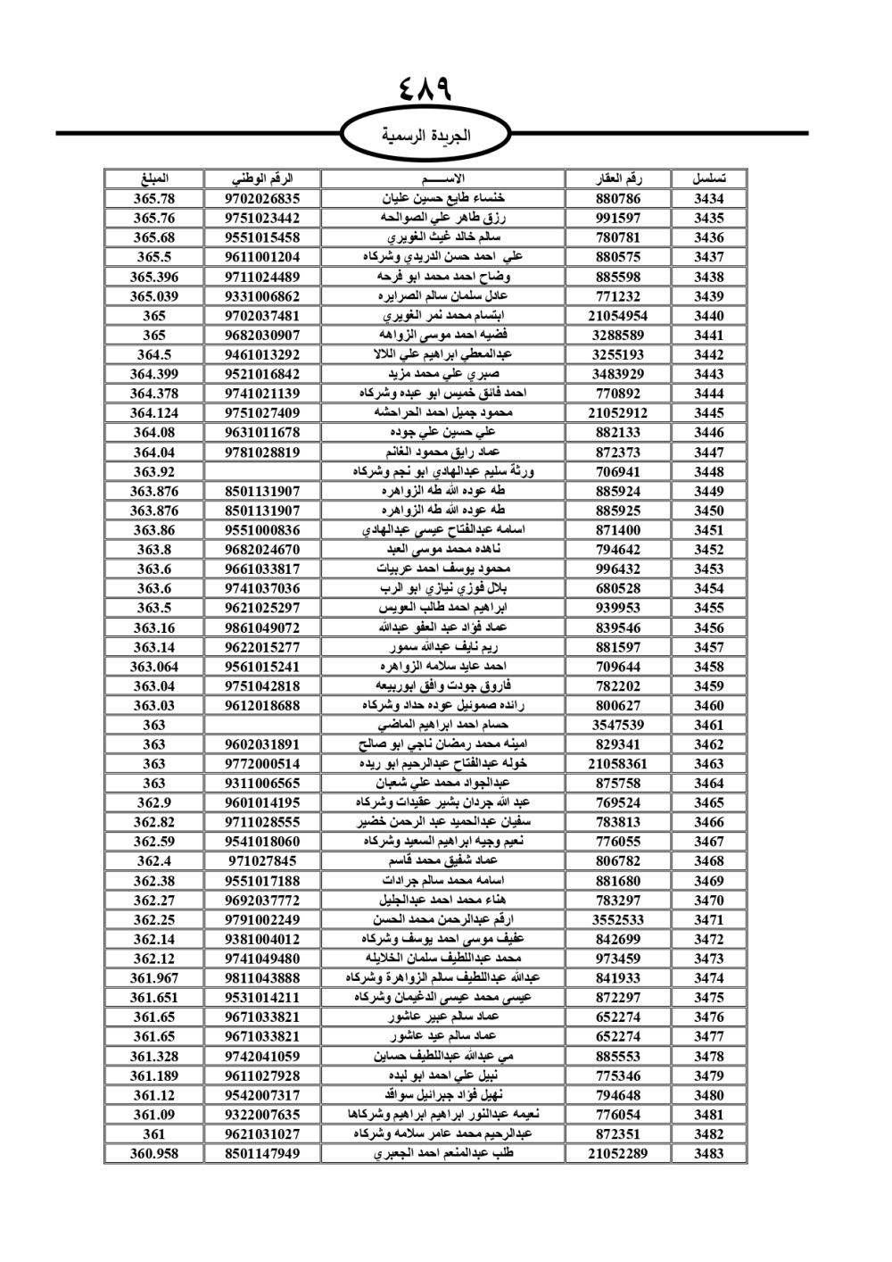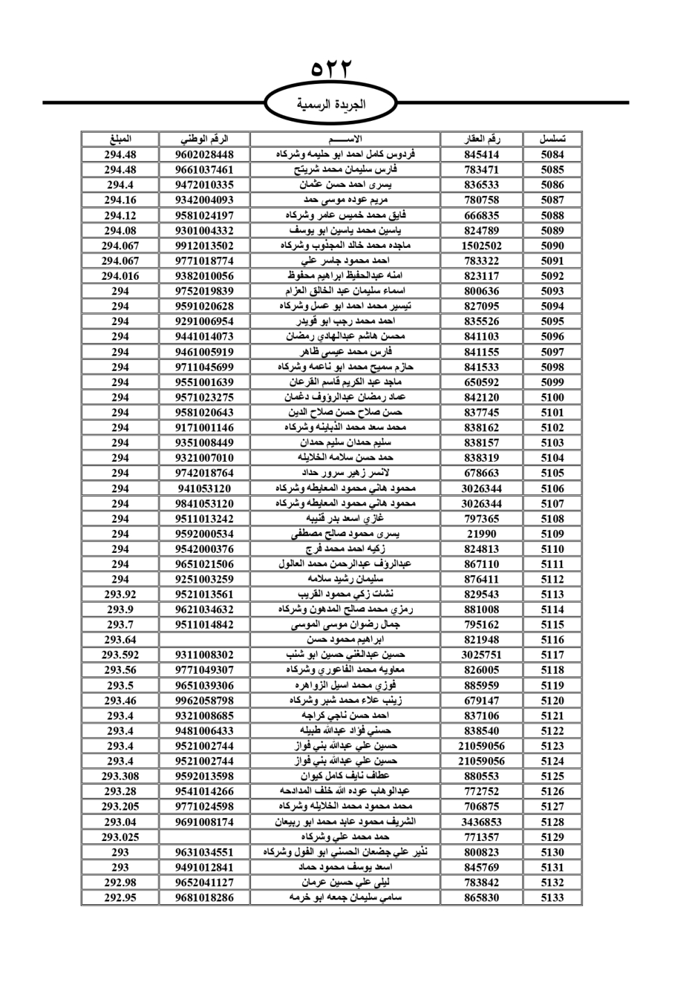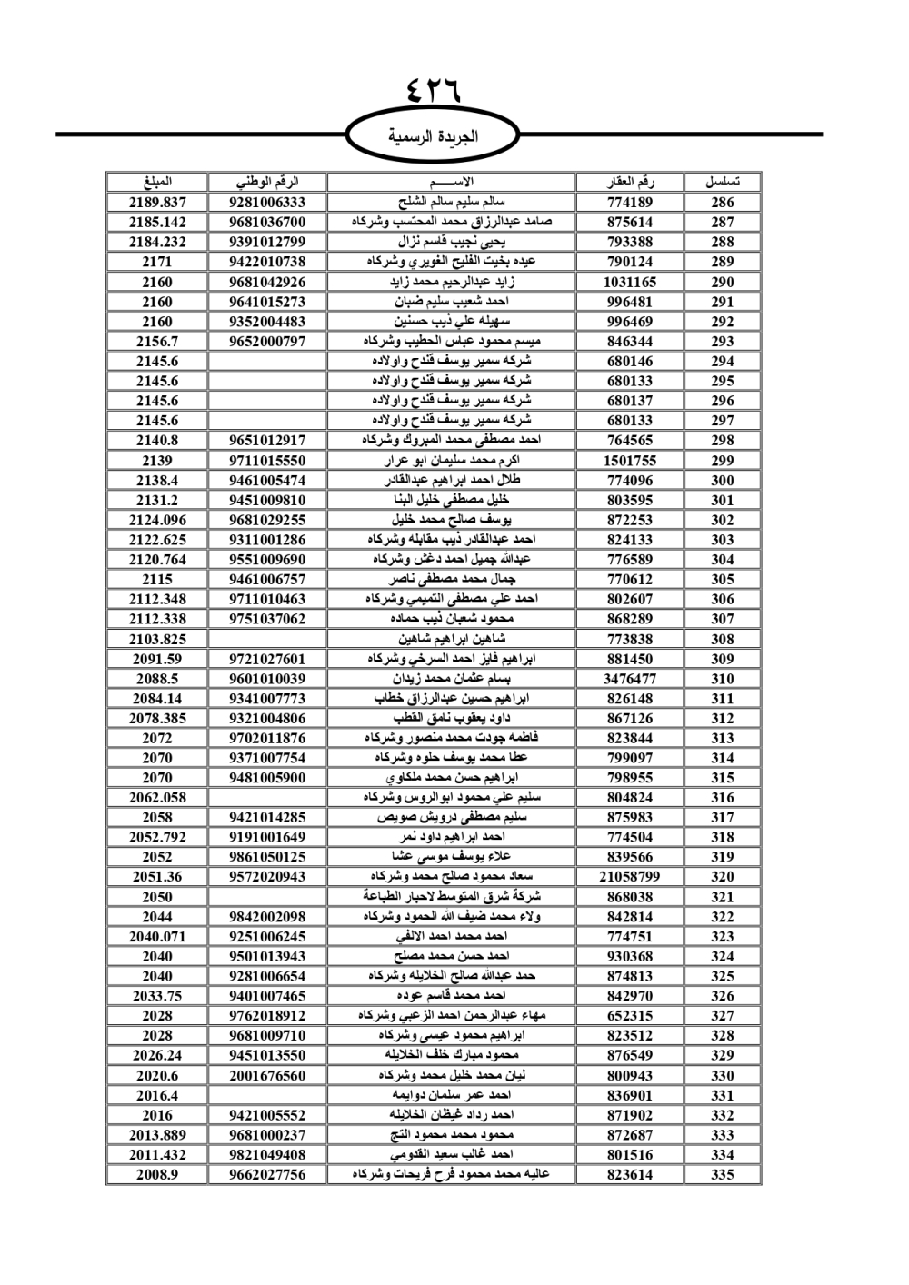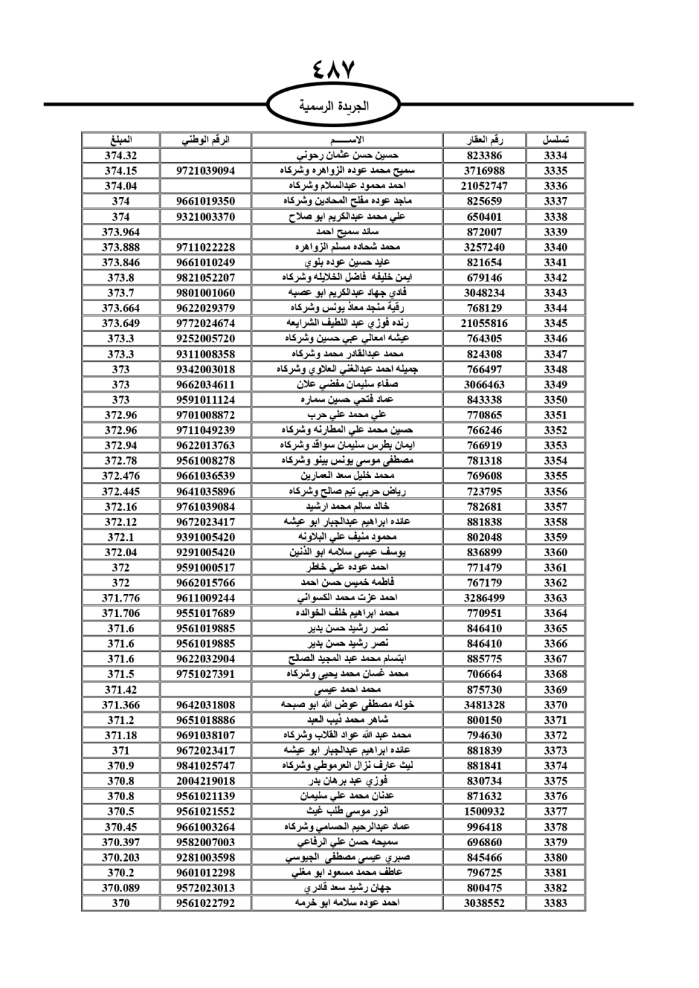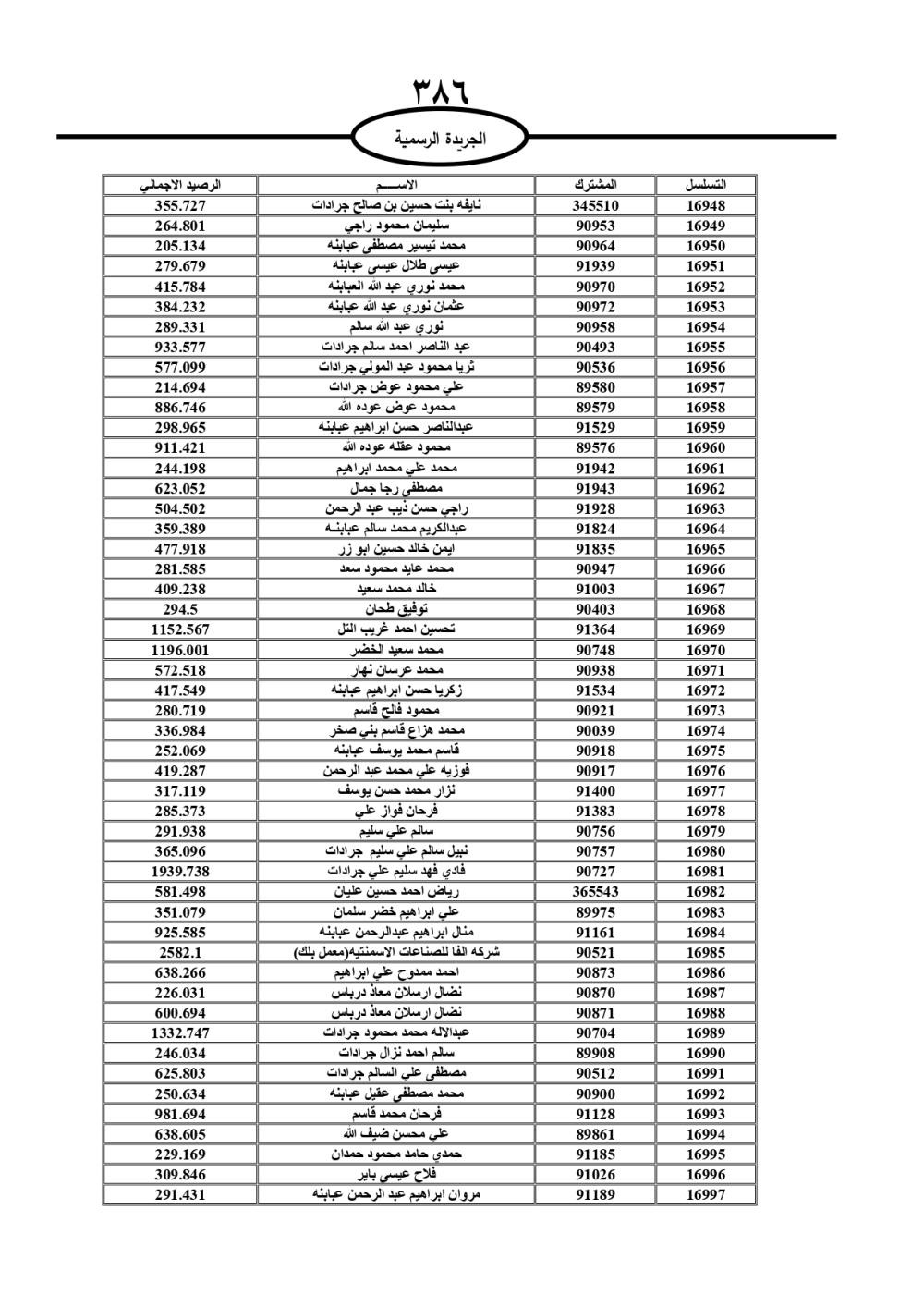 دعت سلطة المياه وبلدية الزرقاء، عشرات آلاف الأردنيين الواردة أسماؤهم بالكشوفات المرفقة، إلى ضرورة مراجعتها لتسوية أوضاعهم المالية كونه ترتب عليهم ذمم مالية، وذلك لتجنب الحجز على الأموال المنقولة وغير المنقولة بعد انقضاء 60 يوما من تاريخ النشر، علما أنه تم نشر هذه الأسماء في الجريدة الرسمية بتاريخ 16/2/2025.