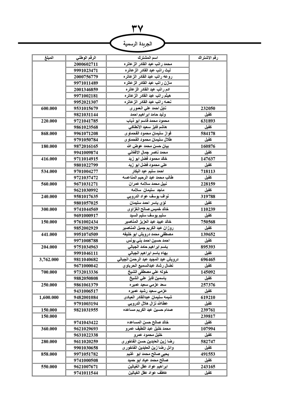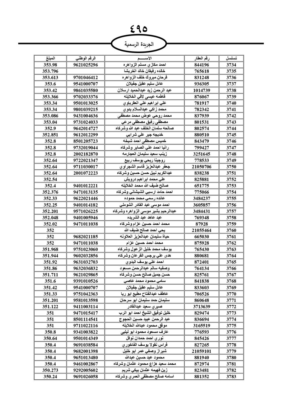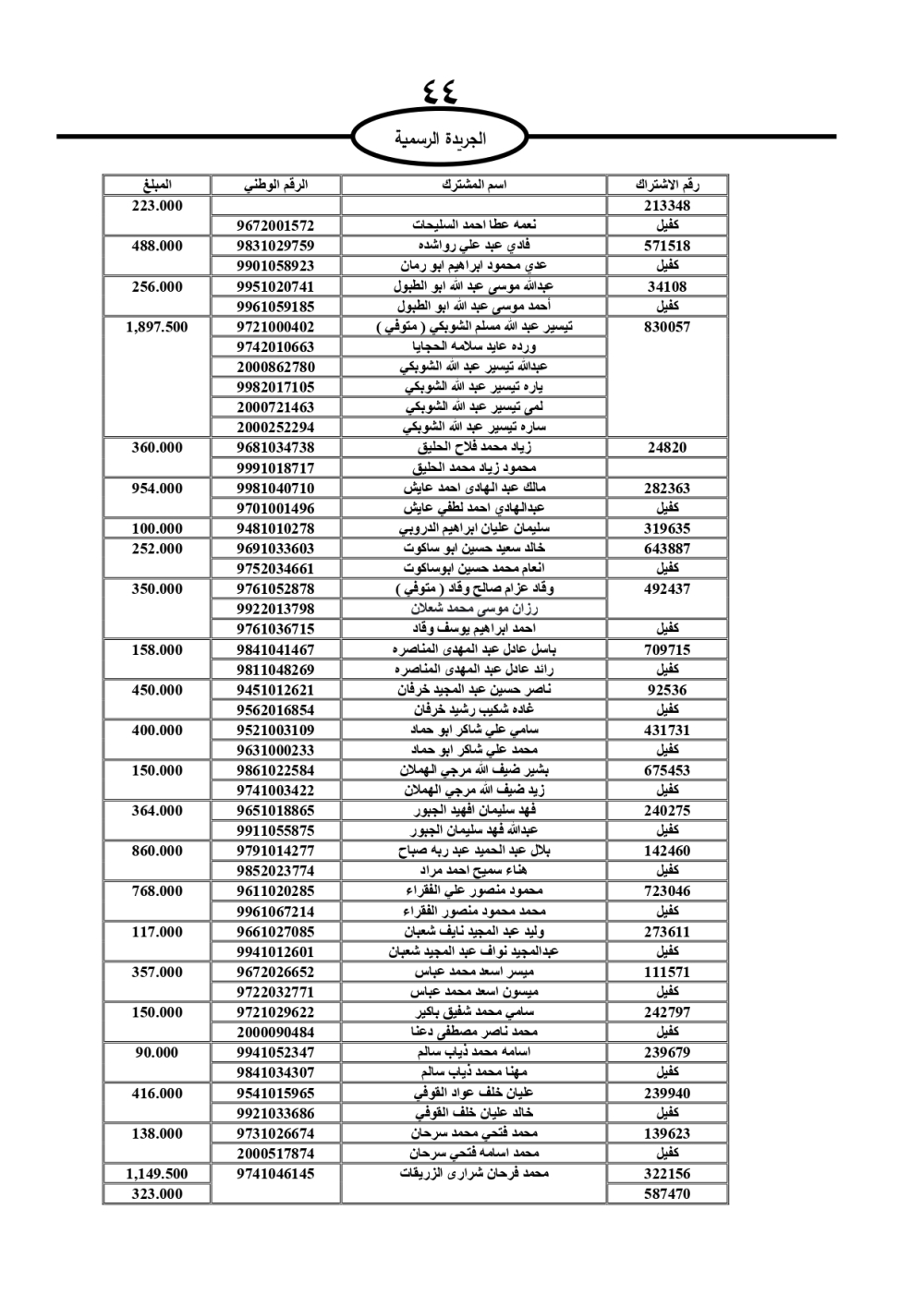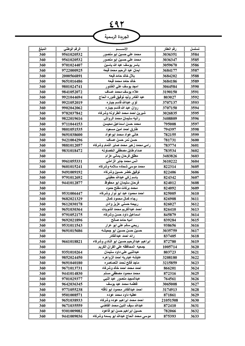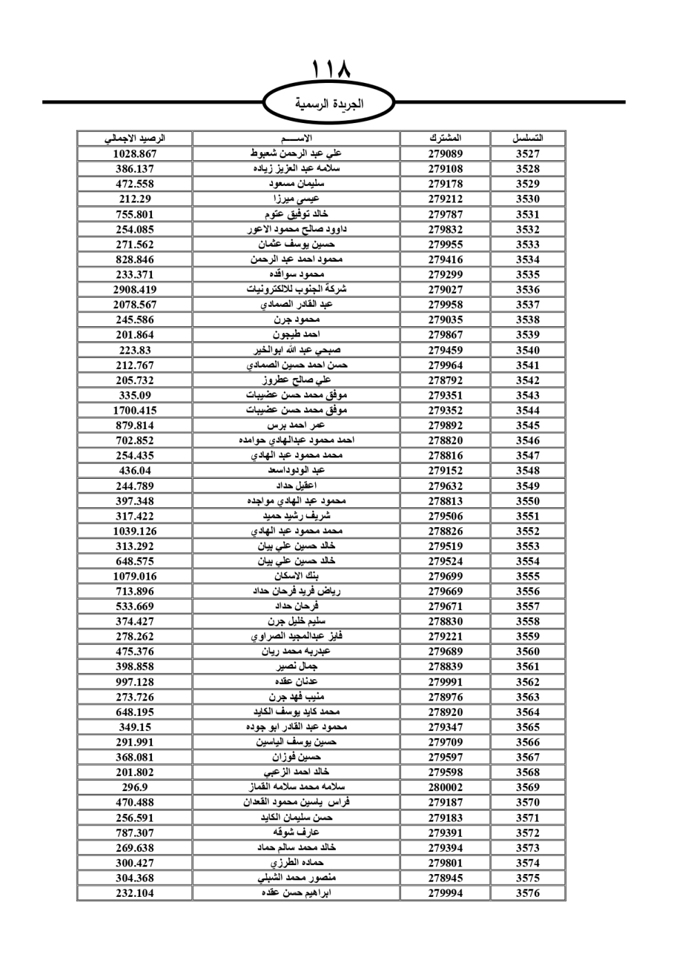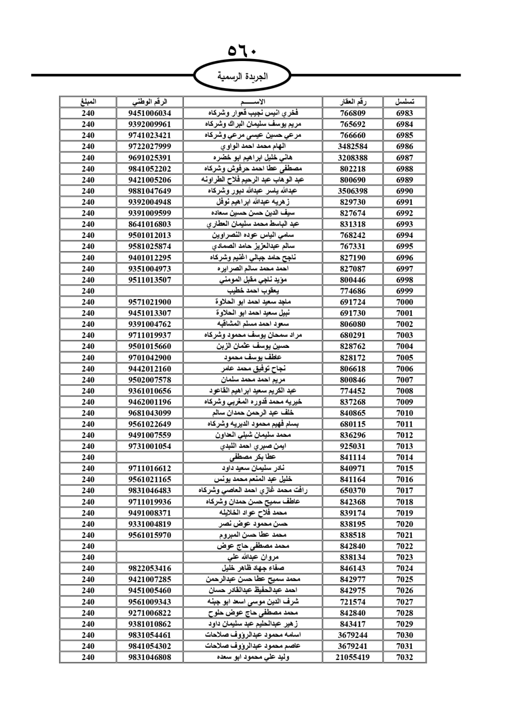 دعت سلطة المياه وبلدية الزرقاء، عشرات آلاف الأردنيين الواردة أسماؤهم بالكشوفات المرفقة، إلى ضرورة مراجعتها لتسوية أوضاعهم المالية كونه ترتب عليهم ذمم مالية، وذلك لتجنب الحجز على الأموال المنقولة وغير المنقولة بعد انقضاء 60 يوما من تاريخ النشر، علما أنه تم نشر هذه الأسماء في الجريدة الرسمية بتاريخ 16/2/2025.