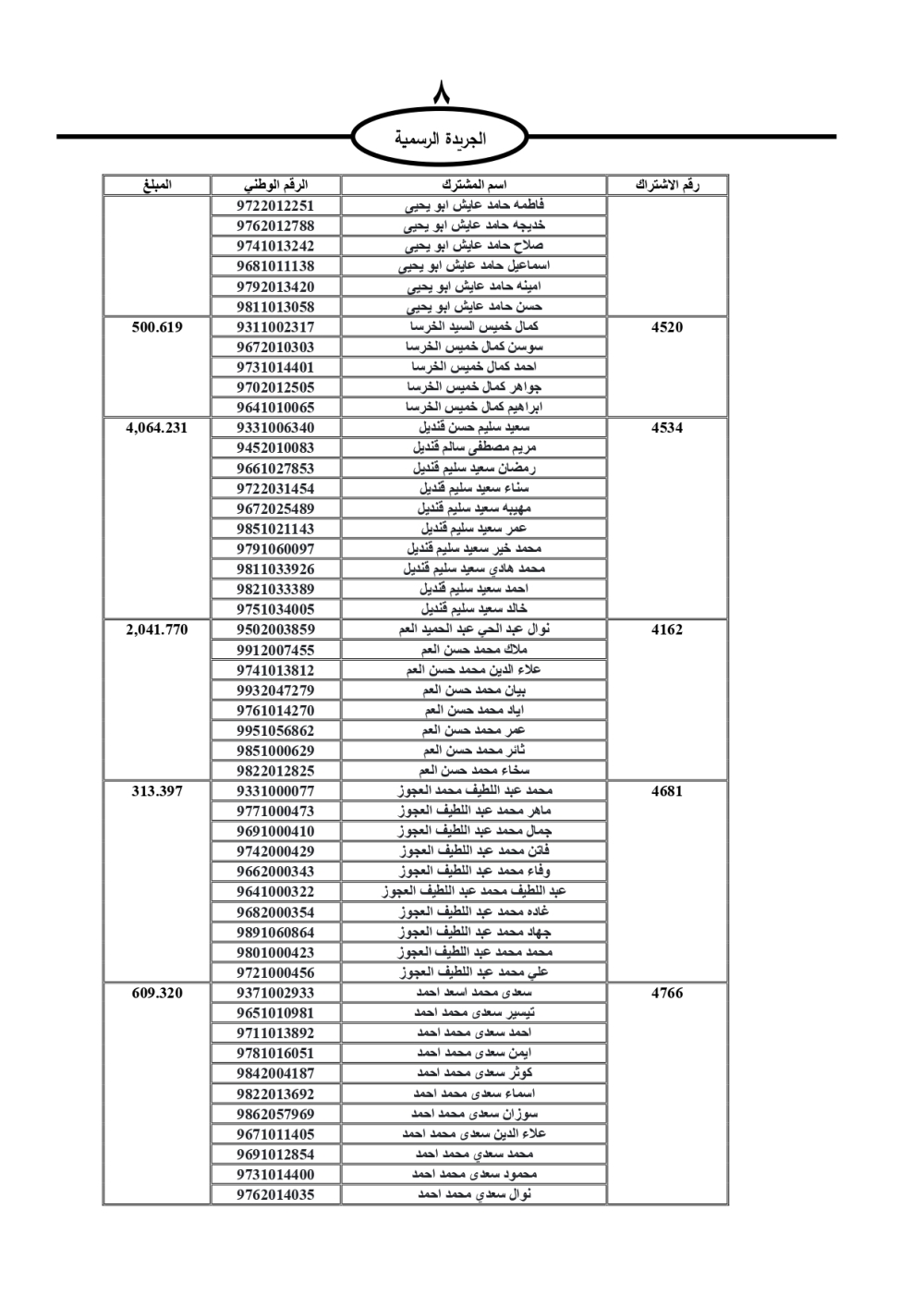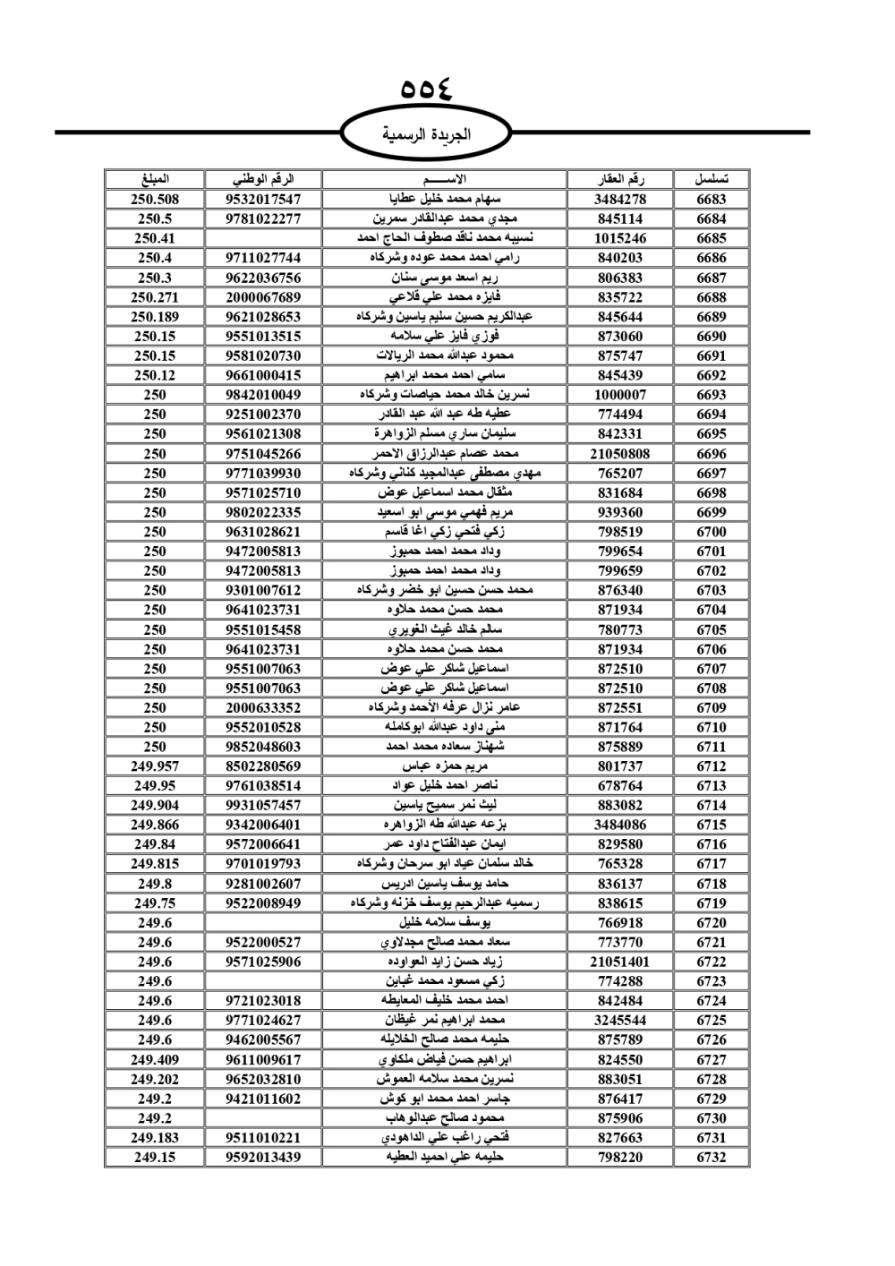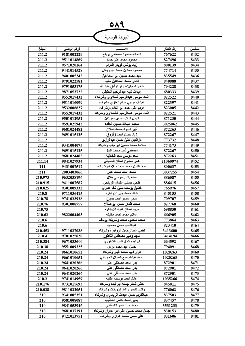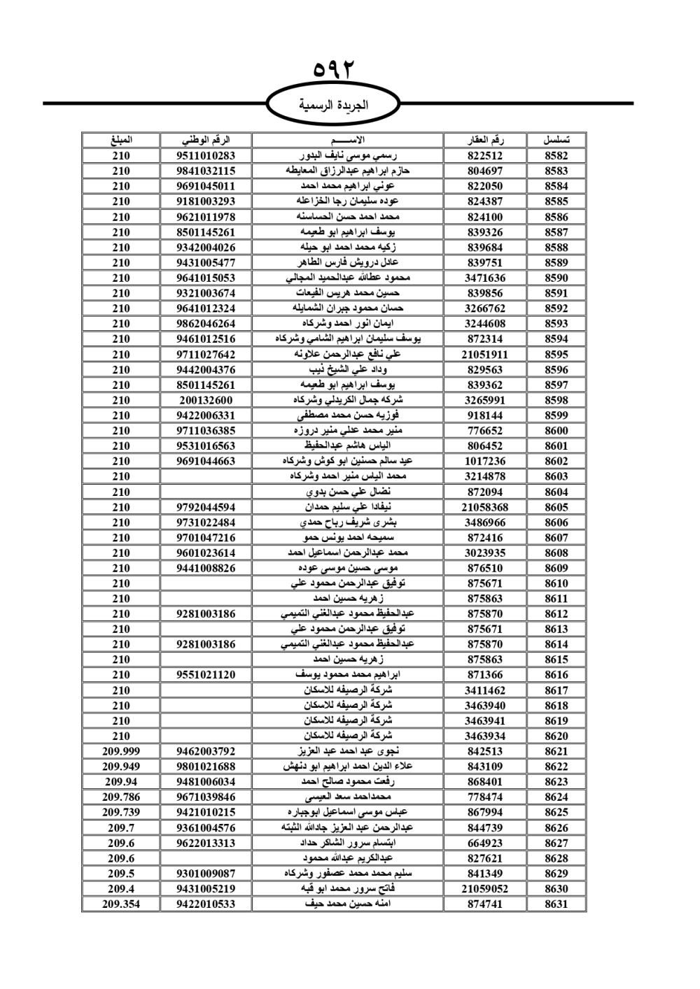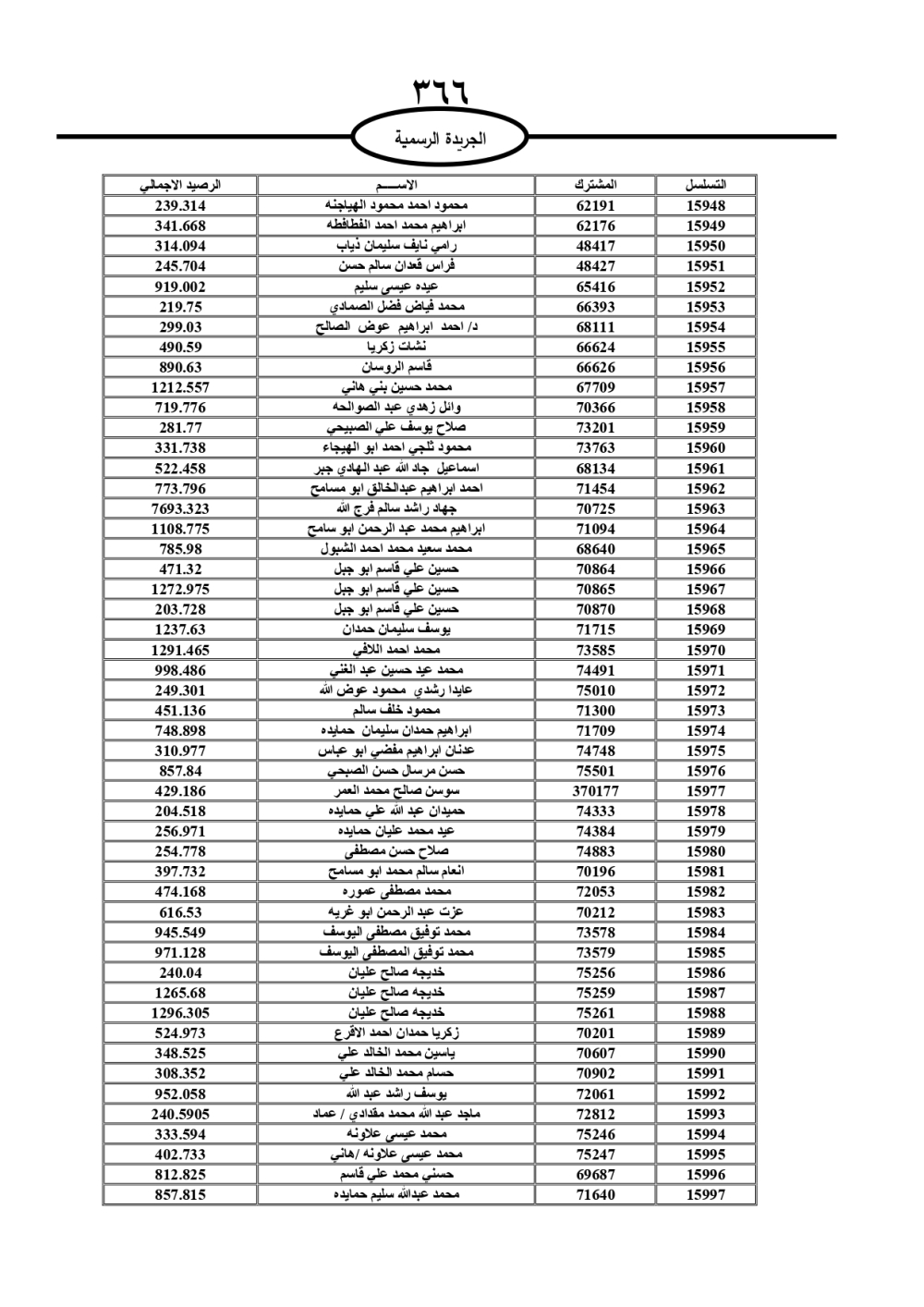دعت سلطة المياه وبلدية الزرقاء، عشرات آلاف الأردنيين الواردة أسماؤهم بالكشوفات المرفقة، إلى ضرورة مراجعتها لتسوية أوضاعهم المالية كونه ترتب عليهم ذمم مالية، وذلك لتجنب الحجز على الأموال المنقولة وغير المنقولة بعد انقضاء 60 يوما من تاريخ النشر، علما أنه تم نشر هذه الأسماء في الجريدة الرسمية بتاريخ 16/2/2025.