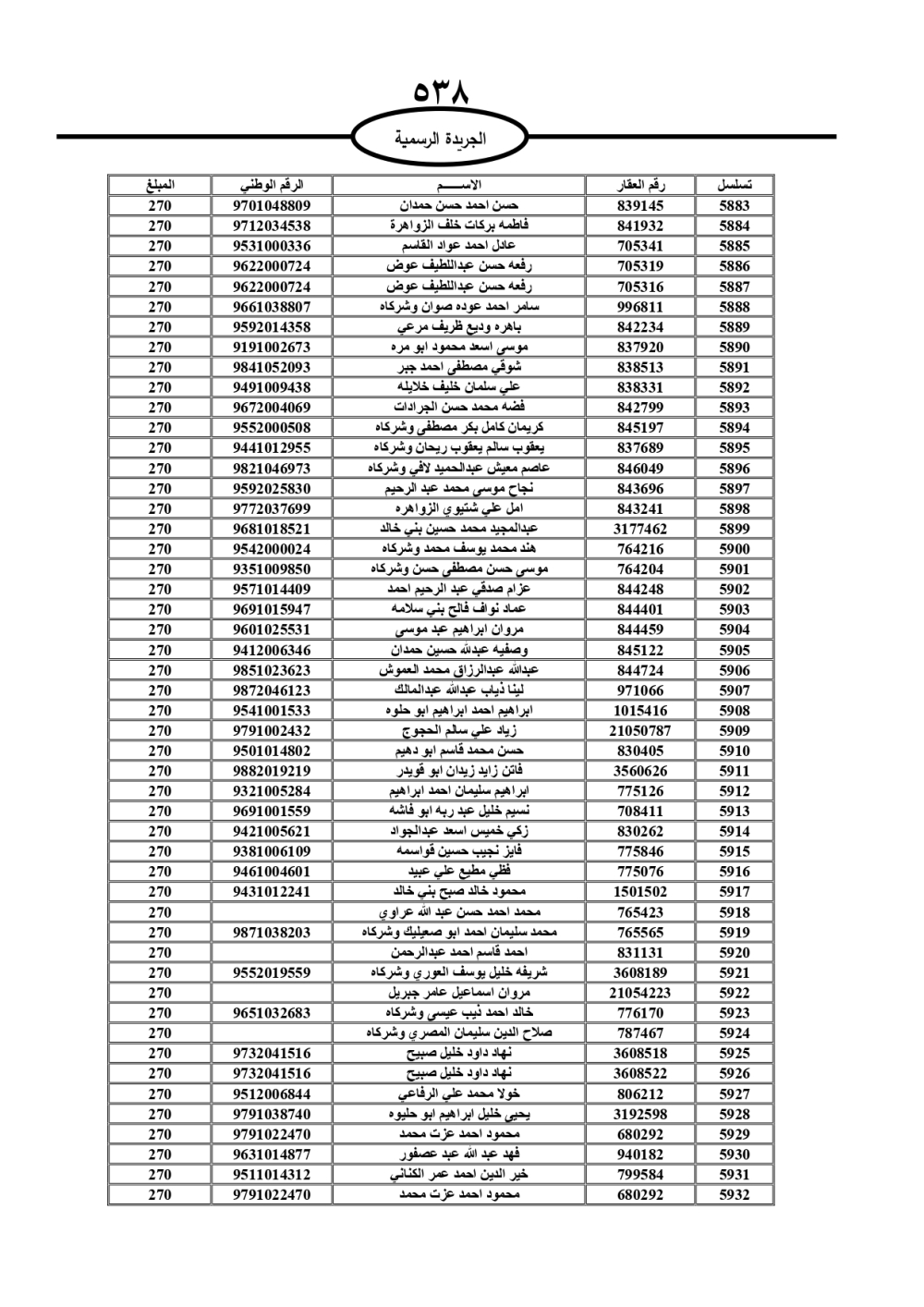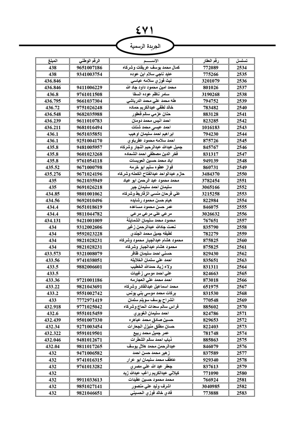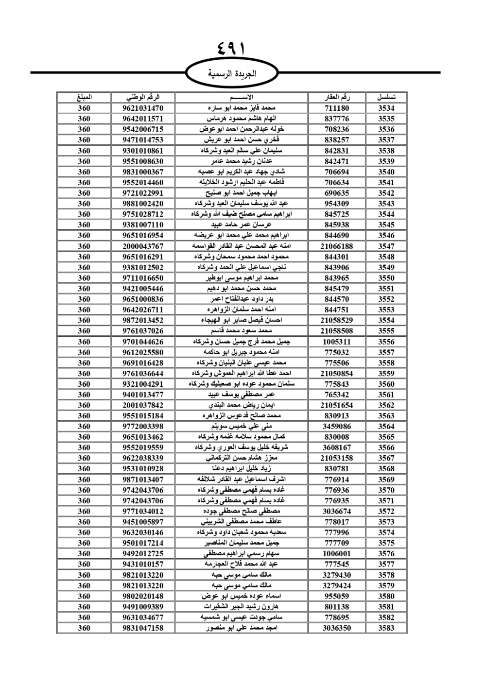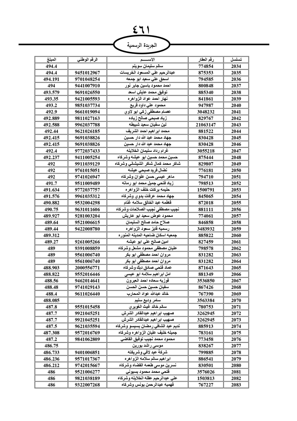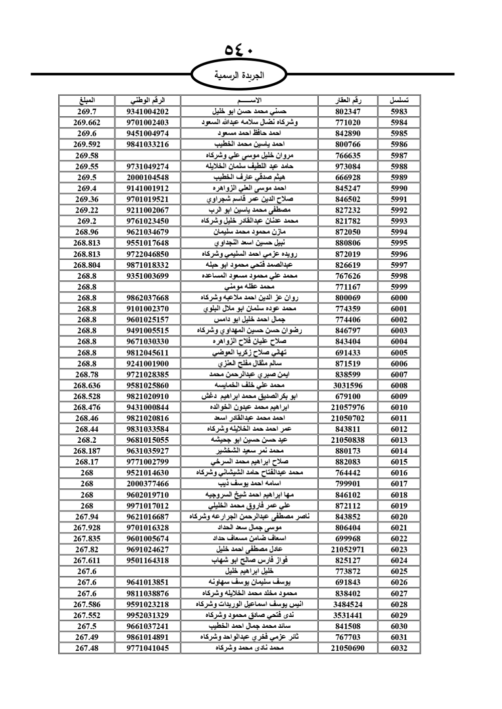 دعت سلطة المياه وبلدية الزرقاء، عشرات آلاف الأردنيين الواردة أسماؤهم بالكشوفات المرفقة، إلى ضرورة مراجعتها لتسوية أوضاعهم المالية كونه ترتب عليهم ذمم مالية، وذلك لتجنب الحجز على الأموال المنقولة وغير المنقولة بعد انقضاء 60 يوما من تاريخ النشر، علما أنه تم نشر هذه الأسماء في الجريدة الرسمية بتاريخ 16/2/2025.