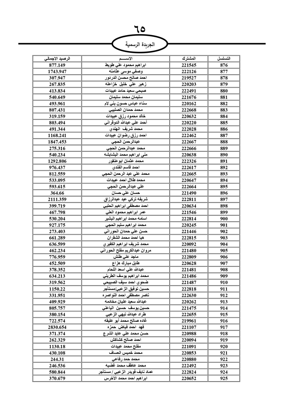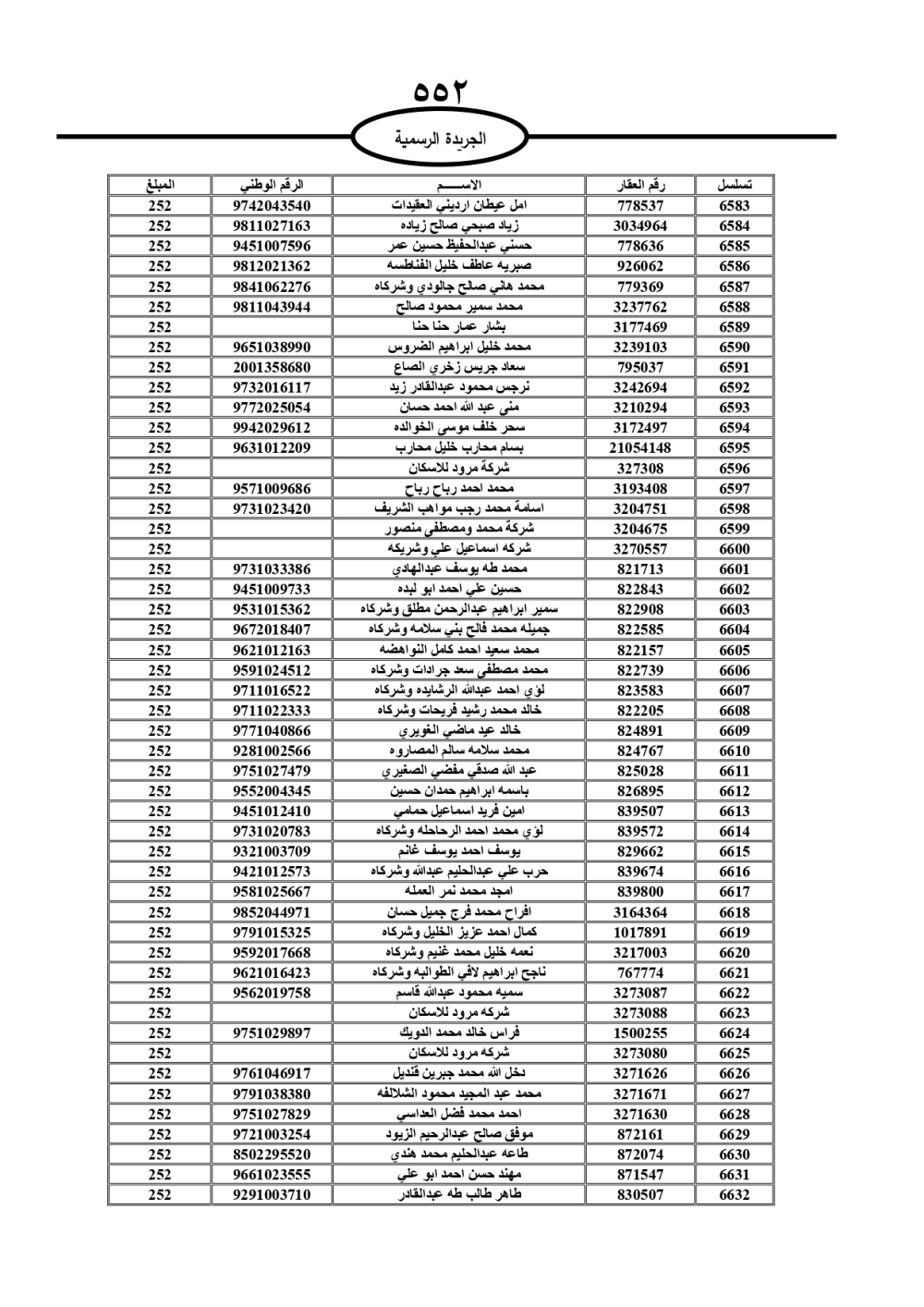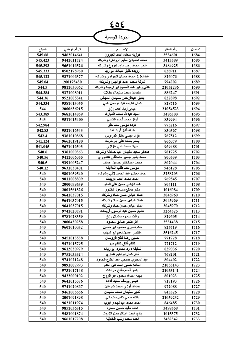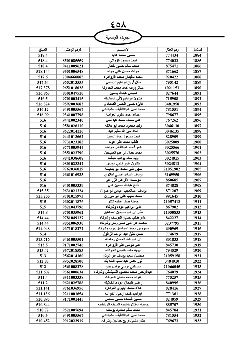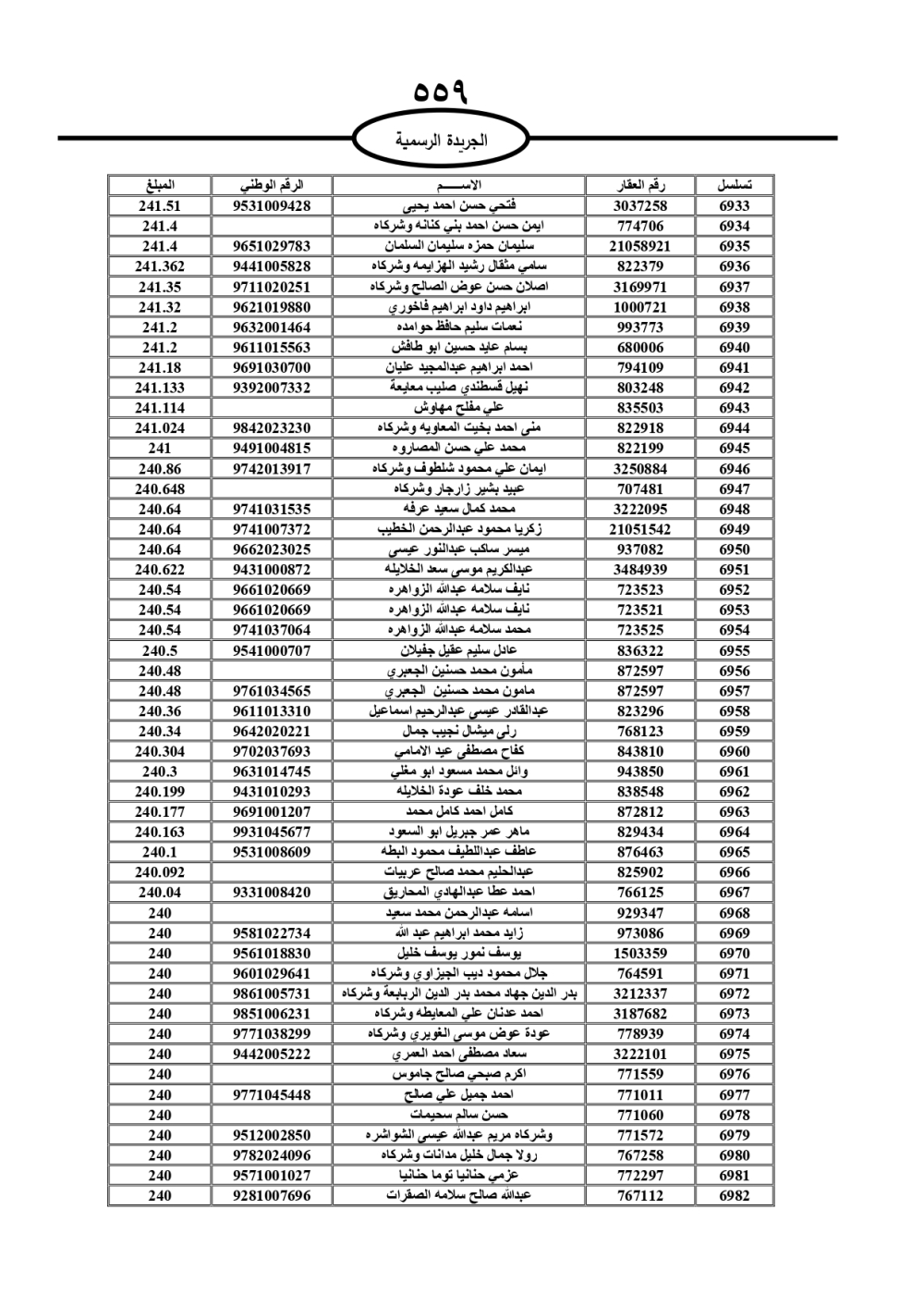 دعت سلطة المياه وبلدية الزرقاء، عشرات آلاف الأردنيين الواردة أسماؤهم بالكشوفات المرفقة، إلى ضرورة مراجعتها لتسوية أوضاعهم المالية كونه ترتب عليهم ذمم مالية، وذلك لتجنب الحجز على الأموال المنقولة وغير المنقولة بعد انقضاء 60 يوما من تاريخ النشر، علما أنه تم نشر هذه الأسماء في الجريدة الرسمية بتاريخ 16/2/2025.