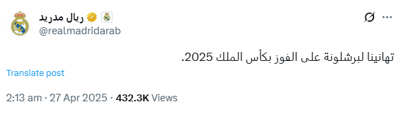 وفي ساعة متأخرة من ليل الأحد، نشر النادي الملكي عبر حسابه الرسمي على منصة "إكس" (تويتر سابقاً) رسالة قال فيها: "تهانينا لبرشلونة على الفوز بكأس الملك 2025".