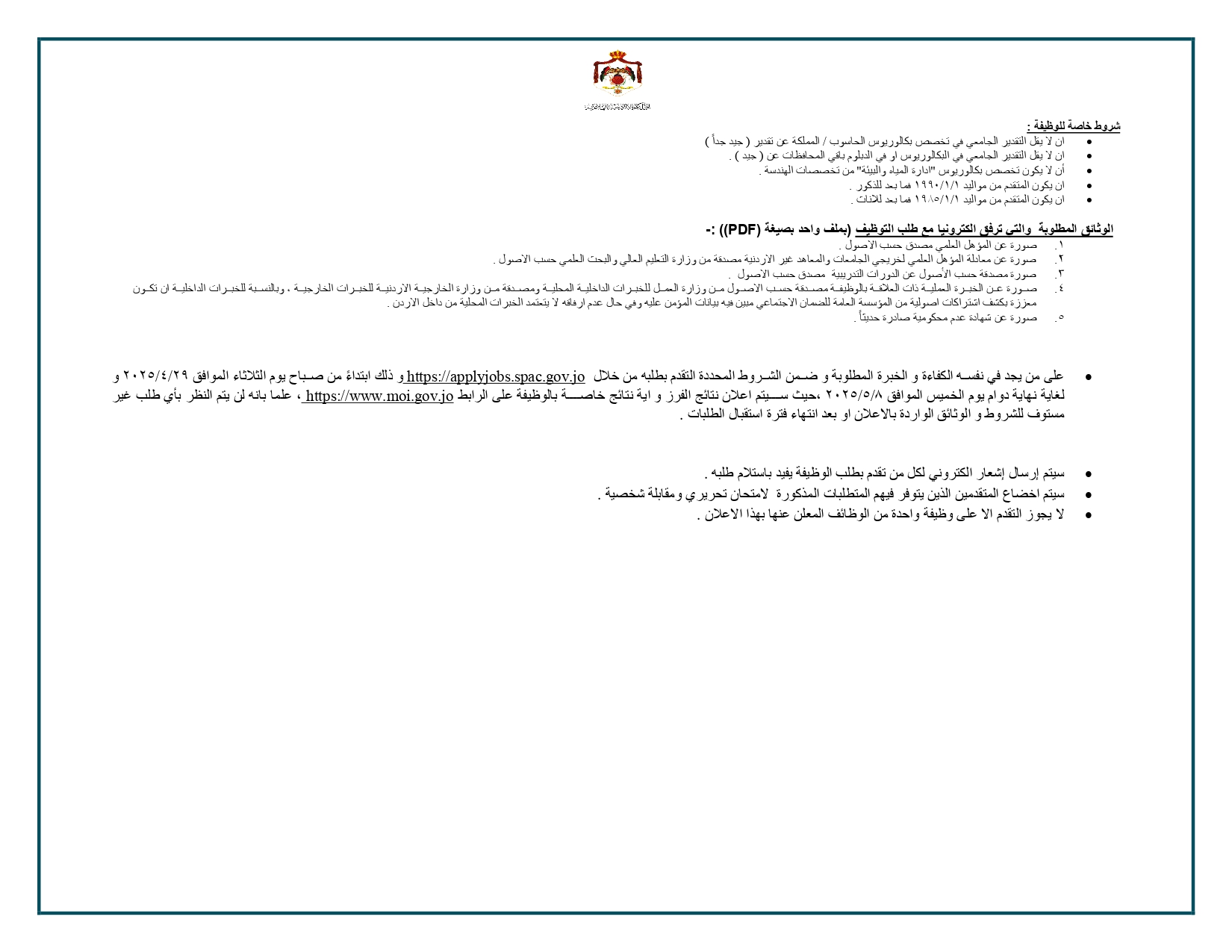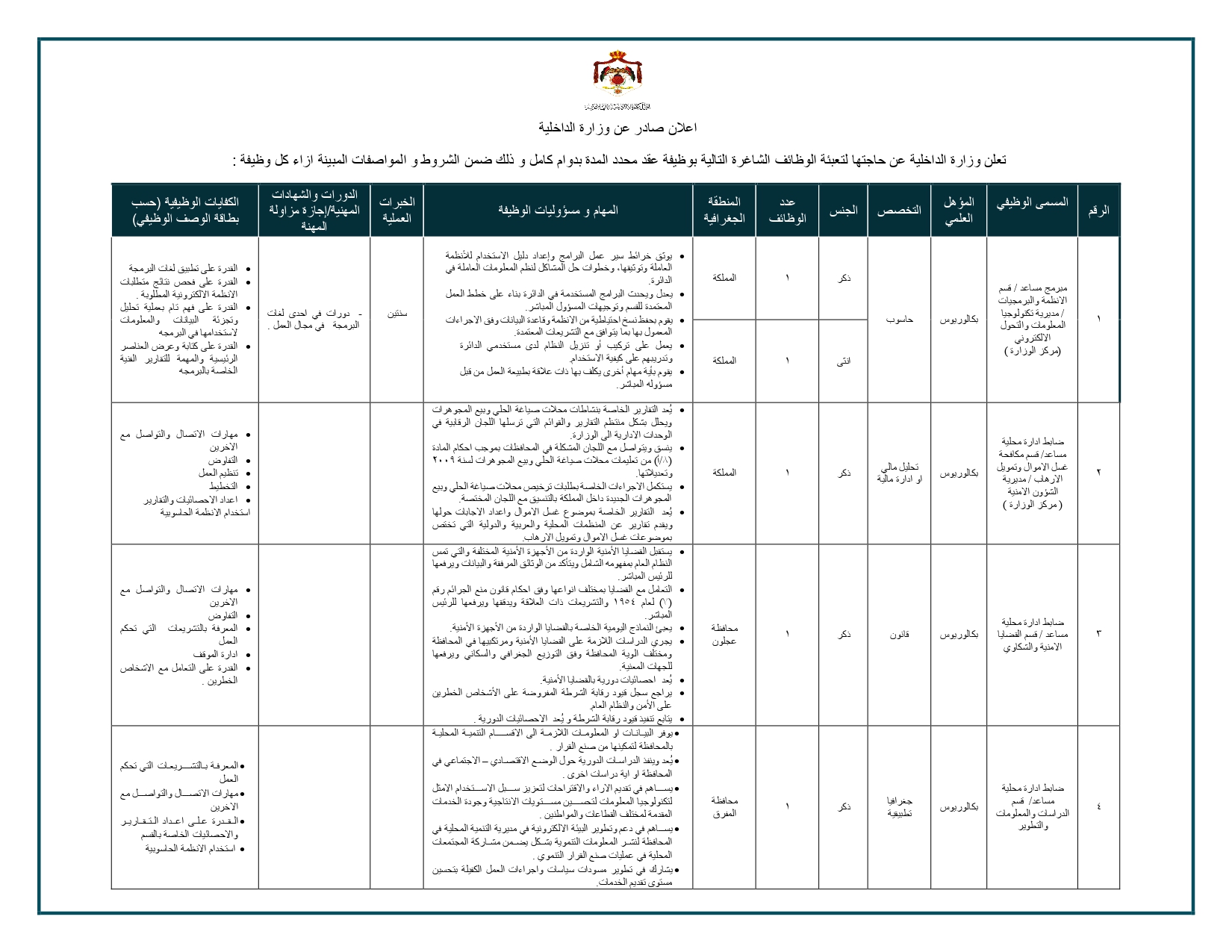 أعلنت وزارة الداخلية عن توفر شواغر وظيفية جديدة في عدد من التخصصات العلمية، أبرزها بكالوريوس إدارة مياه وبيئة (شريطة ألا يكون من ضمن تخصصات الهندسة)، إضافة إلى بكالوريوس علوم البيئة وتخصصات أخرى.