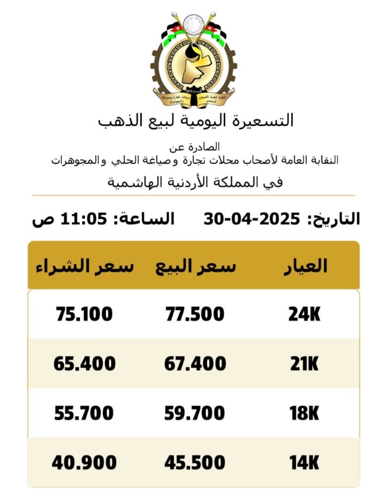 أسعار الذهب في الأردن تنخفض 30 قرشا