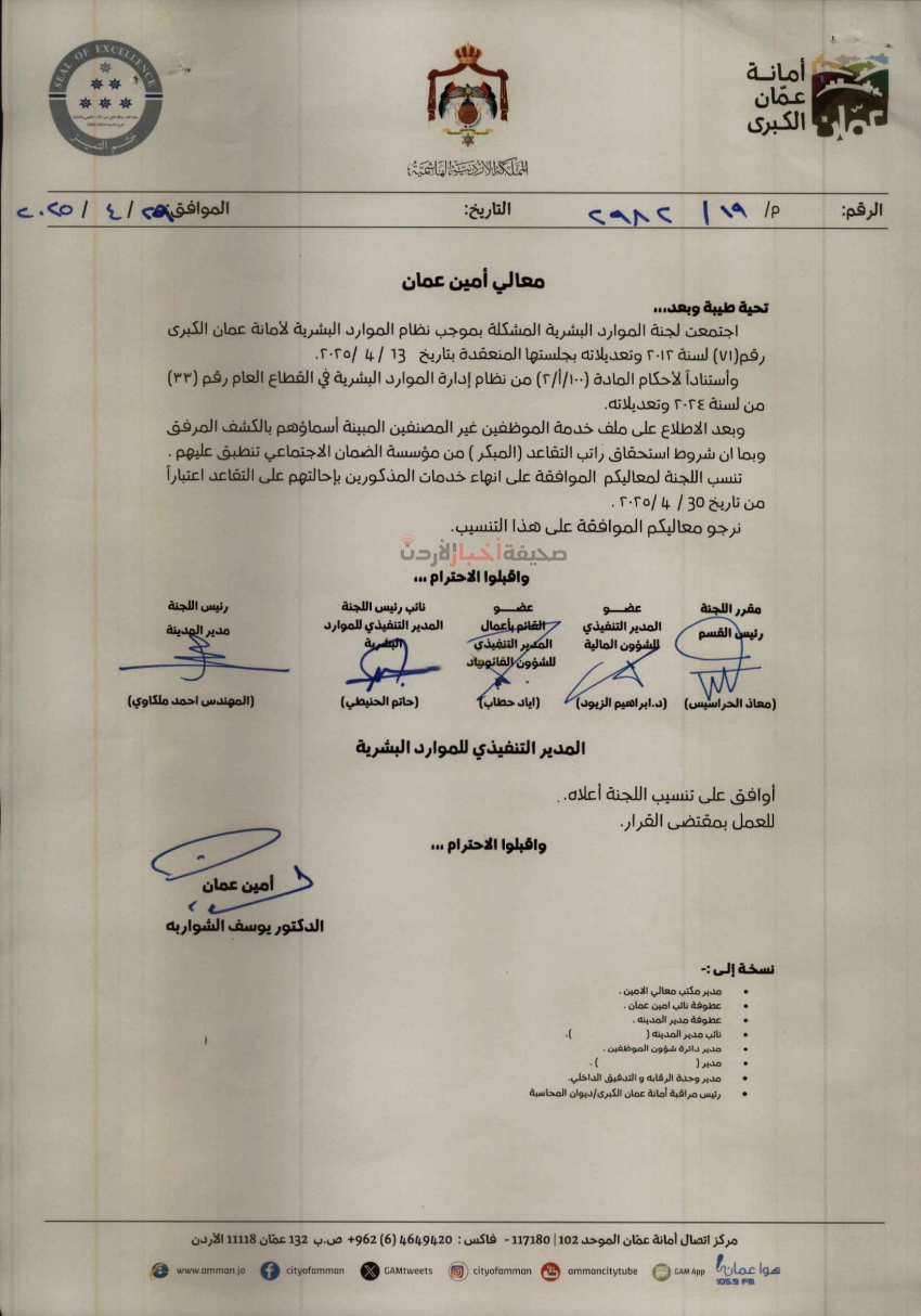 صادق أمين عمّان الكبرى، الدكتور يوسف الشواربة، على قرار يقضي بإنهاء خدمات عدد من موظفي الأمانة وإحالتهم إلى التقاعد المبكر، وذلك ضمن الإجراءات الإدارية الدورية التي تتخذها الأمانة في إطار تنظيم الموارد البشرية.
