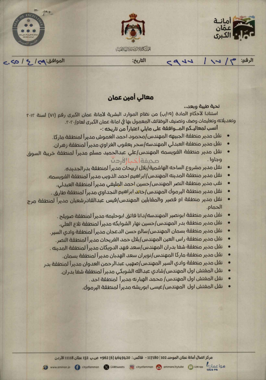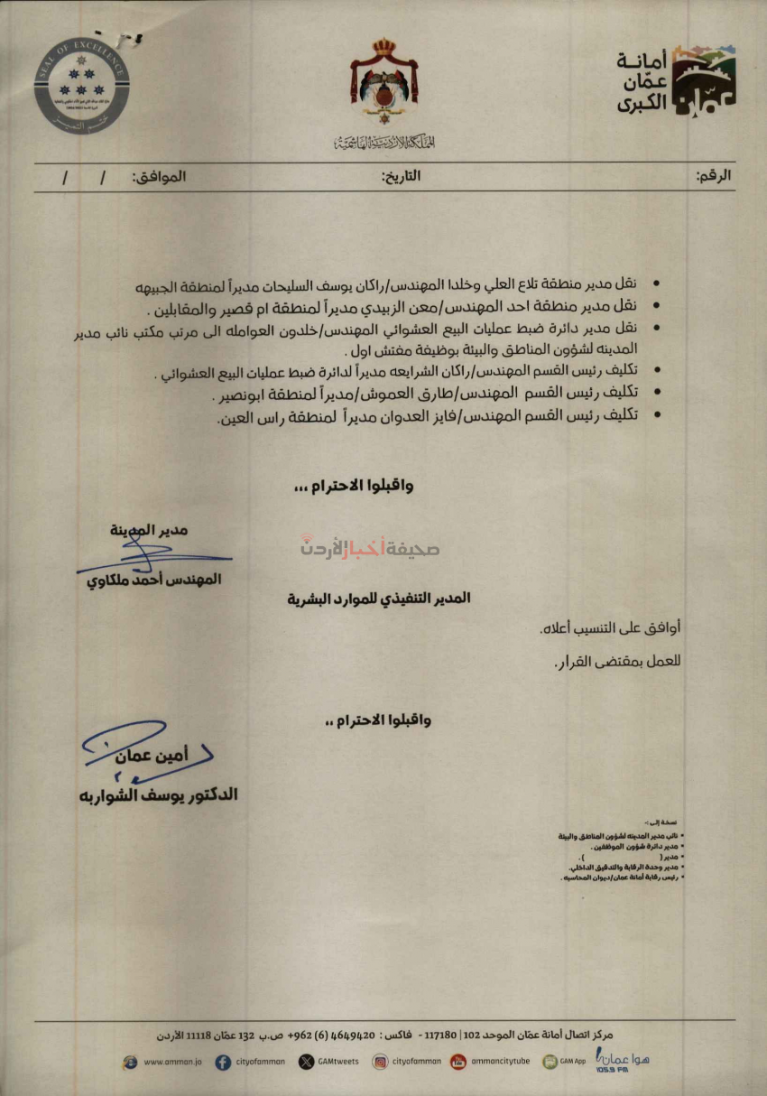 إنهاء خدمات وتنقلات واسعة في أمانة عمان (أسماء)