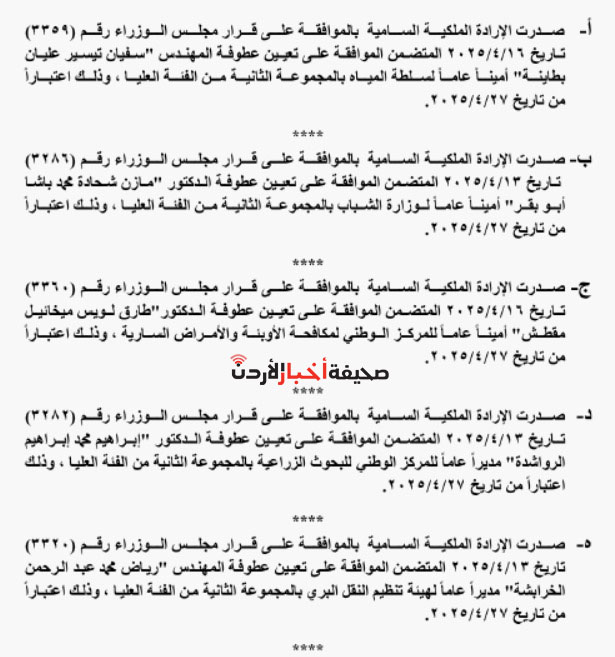 كما صدرت الإرادة الملكية السامية بالموافقة على قرار مجلس الوزراء المتضمن الموافقة على تعيين الدكتور "إبراهيم محمد إبراهيم الرواشدة" مديراً عاماً للمركز الوطني للبحوث الزراعية بالمجموعة الثانية من الفئة العليا ، وذلك اعتباراً من تاريخ ٢٠٢٥/٤/٢٧.