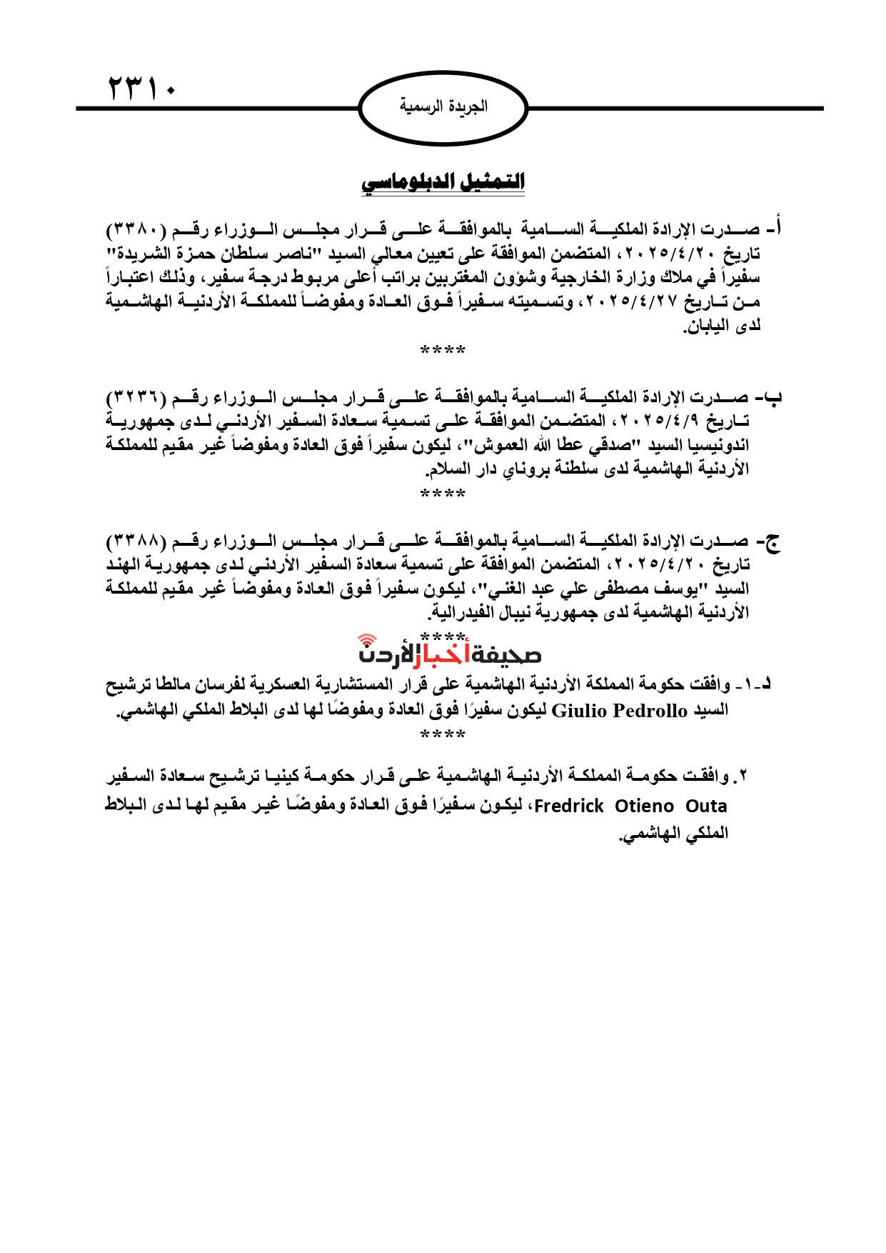 كما صدرت الإرادة الملكية السامية بالموافقة على قرار مجلس الوزراء المتضمن الموافقة على تسمية السفير الأردني لدى جمهورية اندونيسيا السيد صدقي عطا الله العموش"، ليكون سفيراً فوق العادة ومفوضاً غير مقيم للمملكة الأردنية الهاشمية لدى سلطنة بروناي دار السلام.