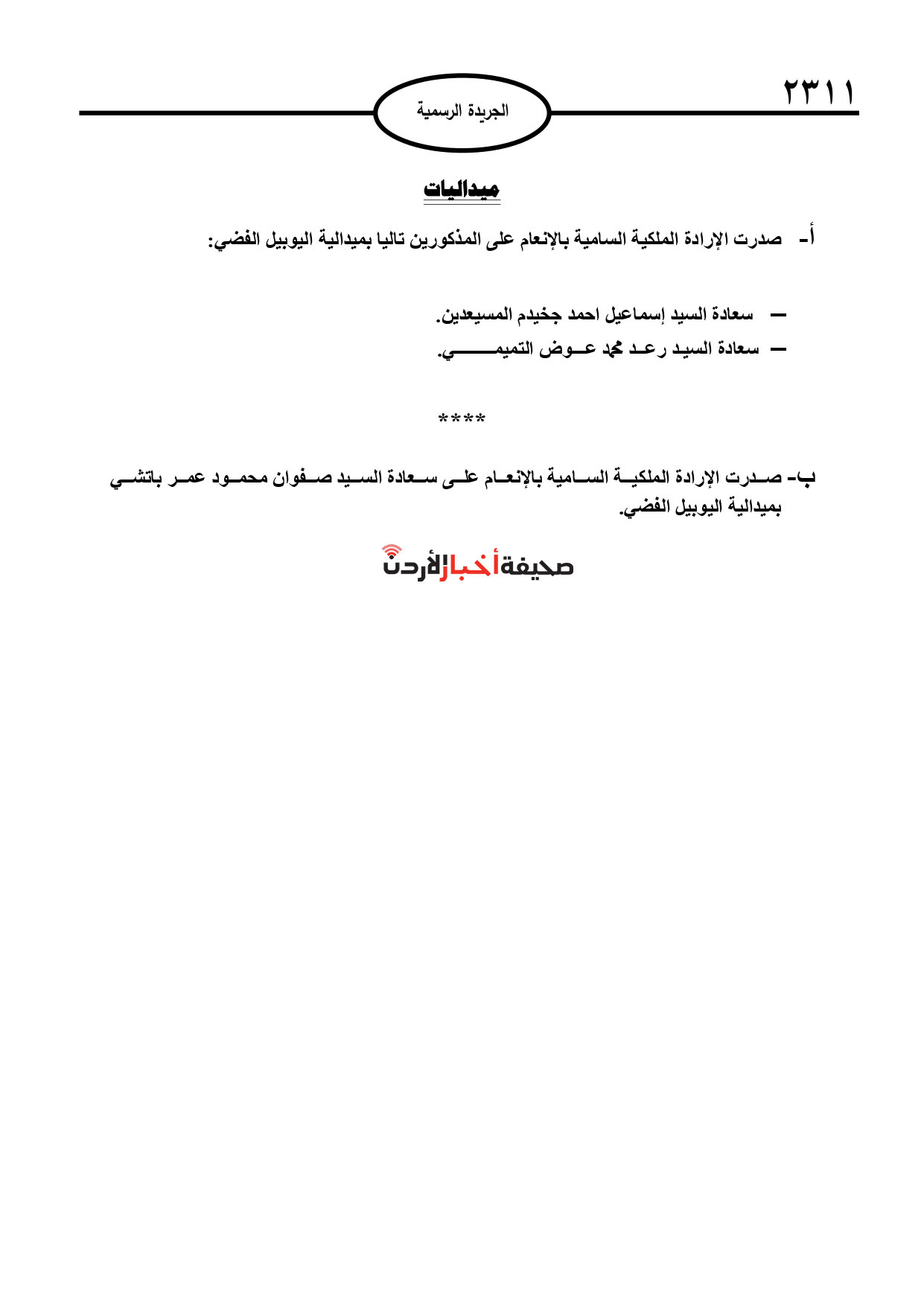 وصدرت الإرادة الملكية السامية بالإنعام على المذكورين تاليا بميدالية اليوبيل الفضي: