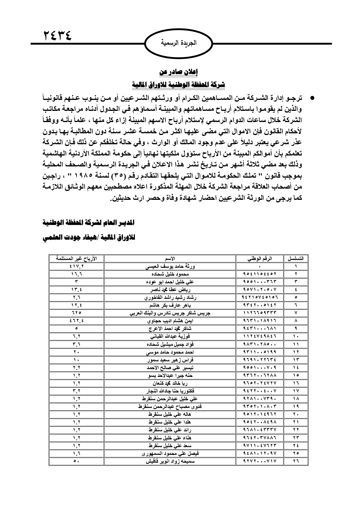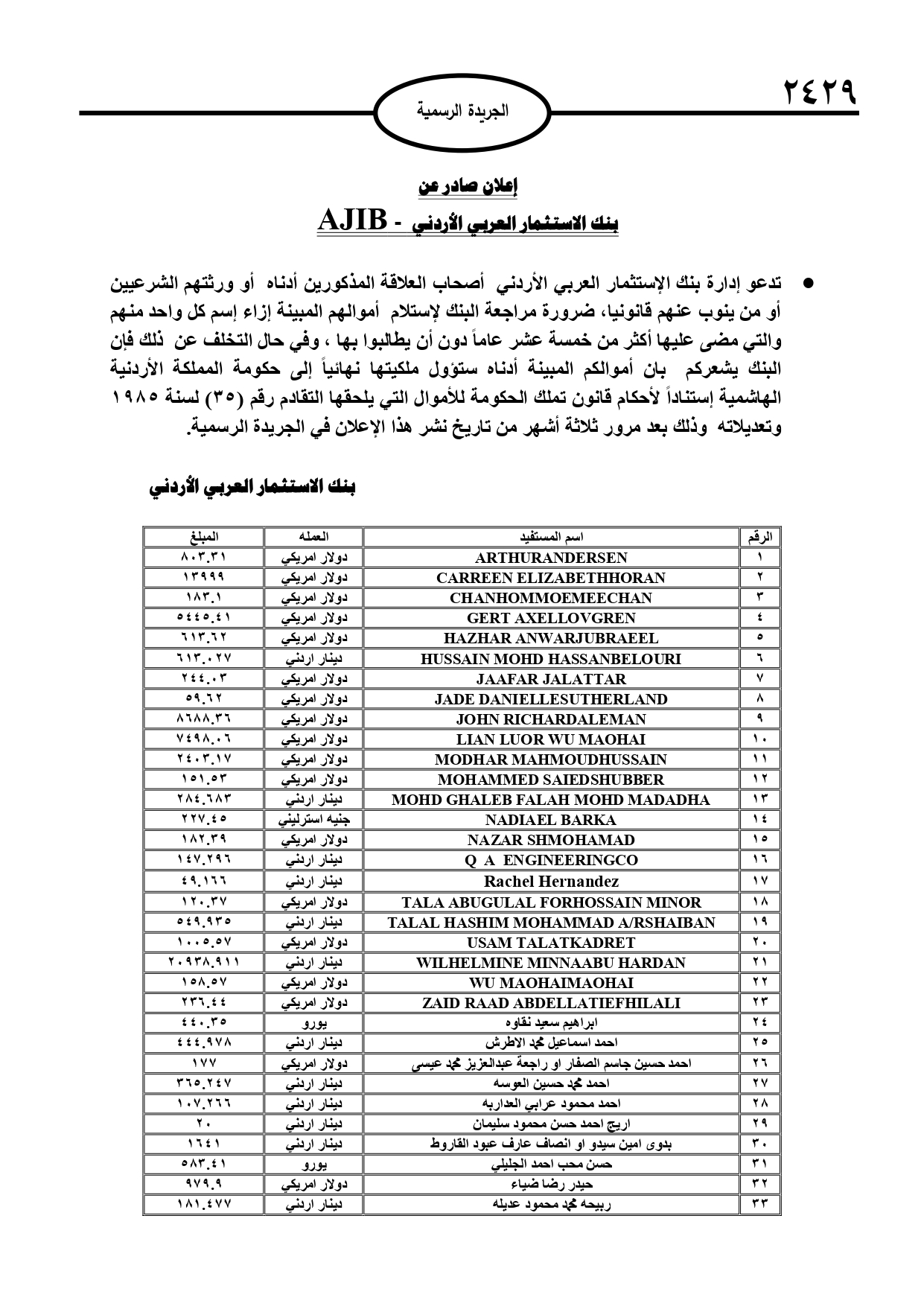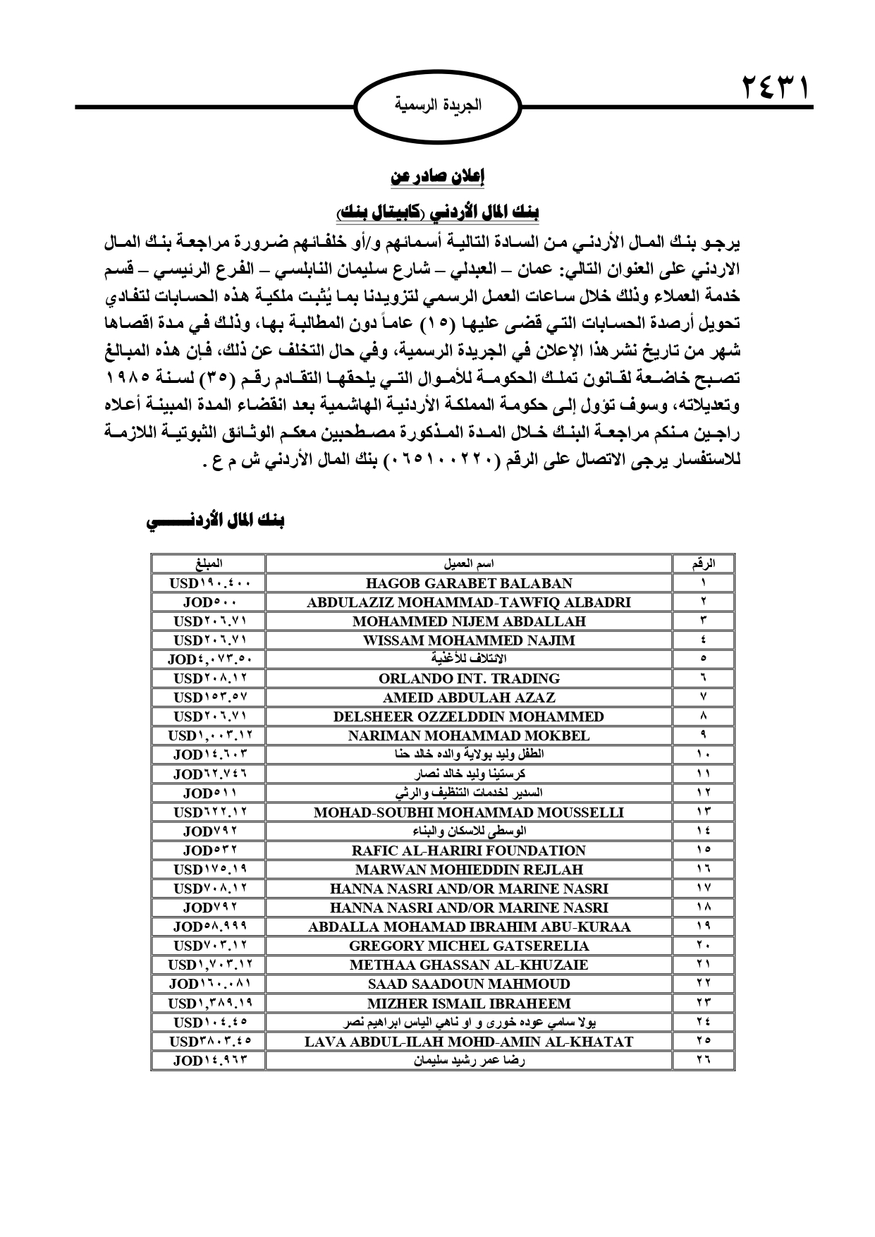 نشرت الجريدة الرسمية الصادرة، الأربعاء، أسماء أردنيين لديهم أموال في بنوك وجهات مالية أخرى، وفي حال عدم مراجعة تلك الجهات ستؤول أموالهم إلى خزينة الدولة.