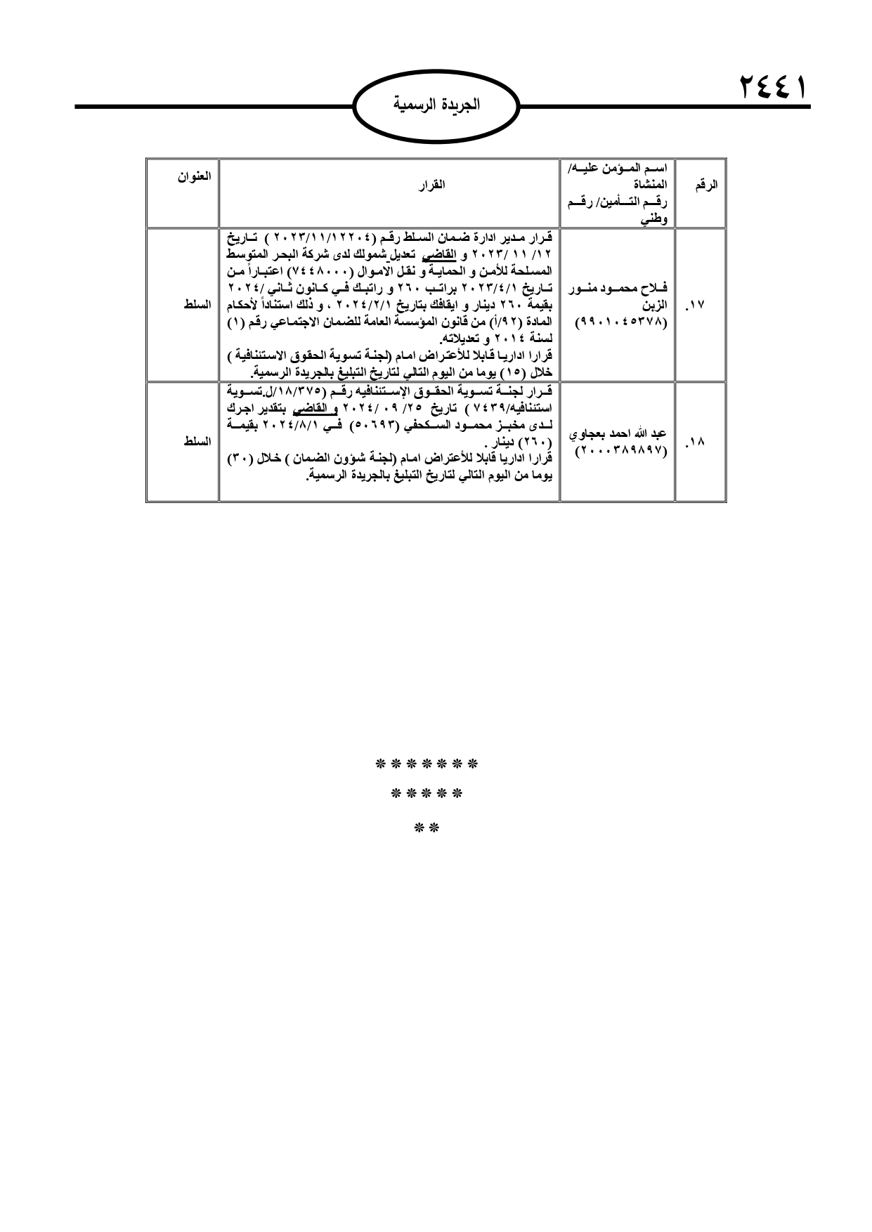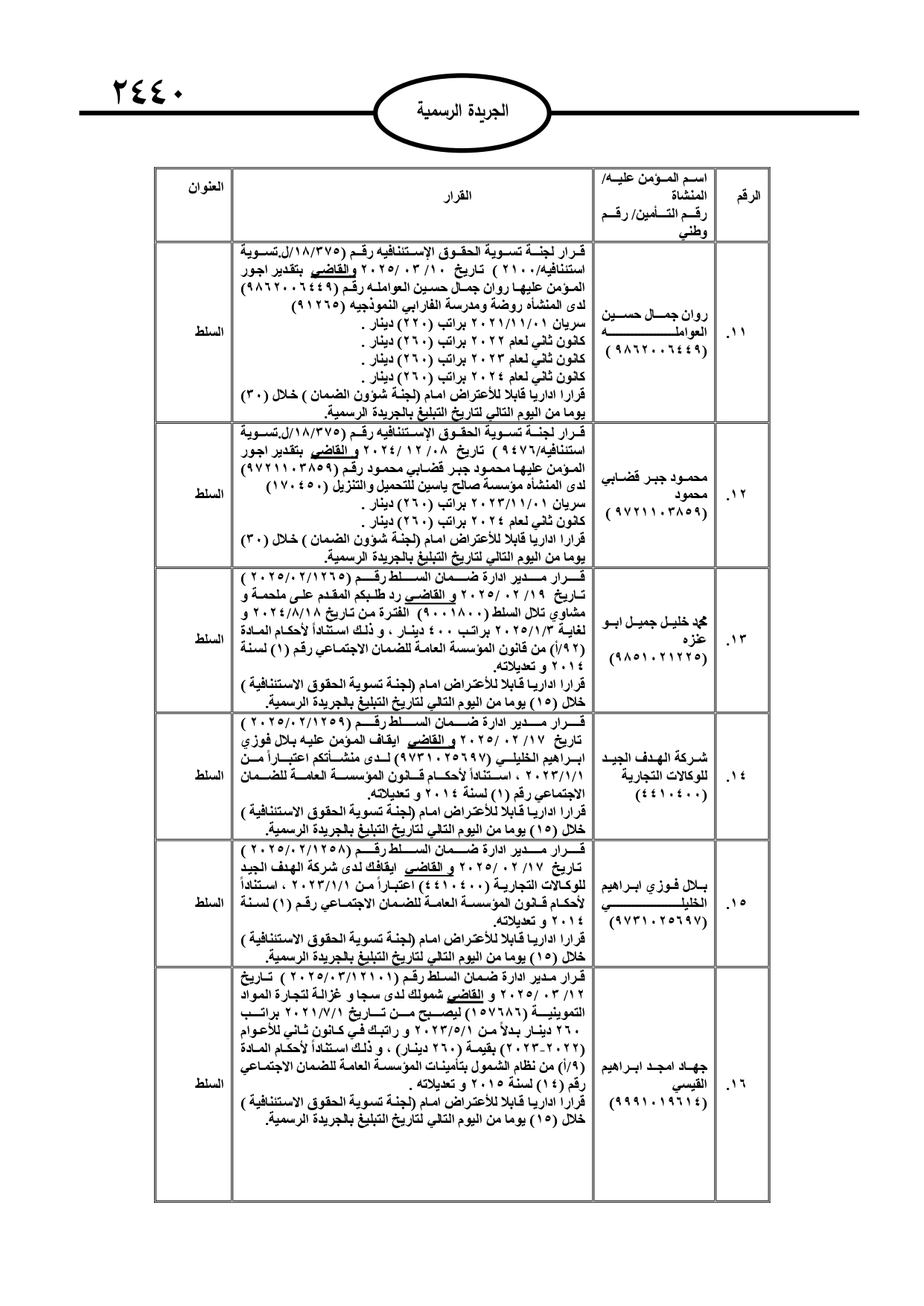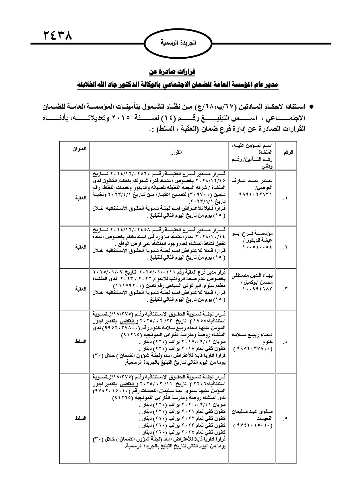 أصدر مدير عام المؤسسة العامة للضمان الاجتماعي بالوكالة، الدكتور جاد الله الخلايلة، عدة قرارات بشأن مؤسسات وشركات وأشخاص.