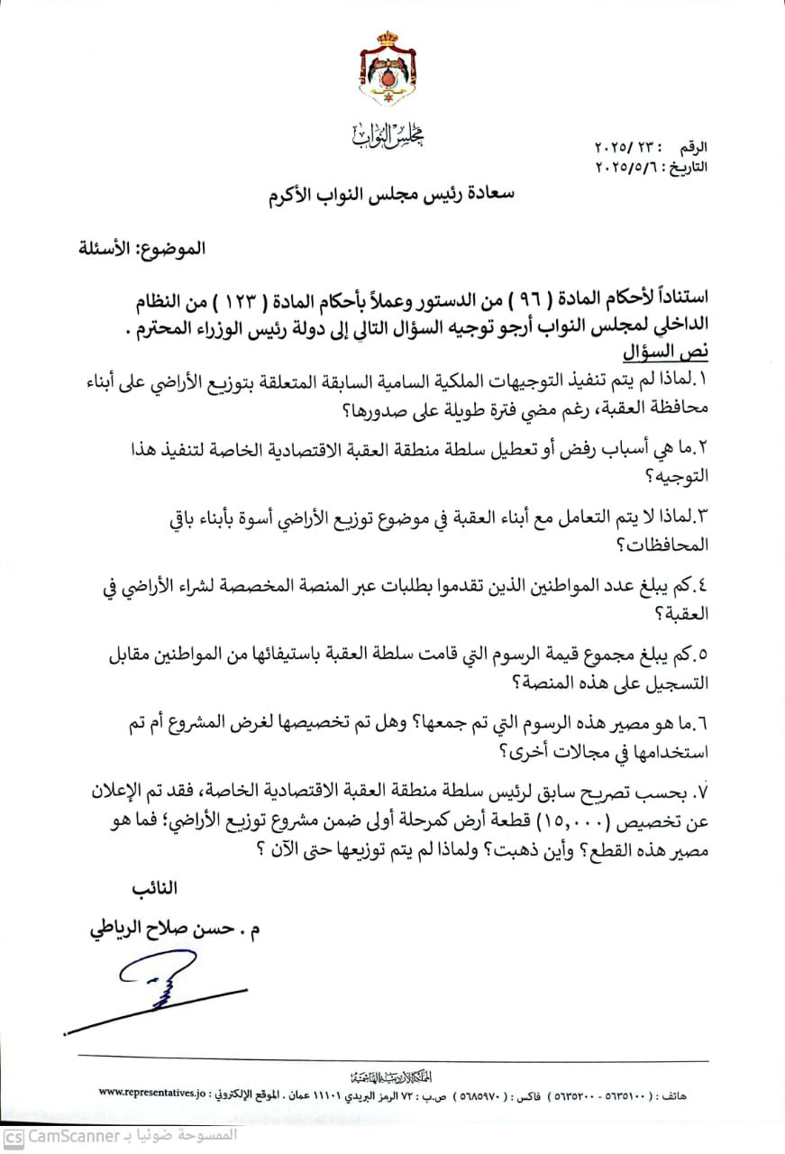 وجّه النائب حسن الرياطي سؤالًا نيابيًا إلى رئيس الوزراء الدكتور بشر الخصاونة، طالب فيه بتوضيح أسباب عدم تنفيذ التوجيهات الملكية السامية المتعلقة بتوزيع الأراضي على أبناء محافظة العقبة، رغم مرور فترة طويلة على صدورها.