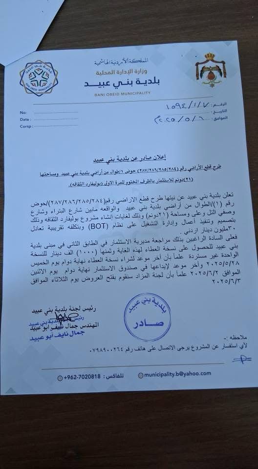 ودعت البلدية المستثمرين المهتمين إلى مراجعة وحدة التنمية في مبنى البلدية للحصول على نسخة من وثائق العطاء مقابل رسم غير مسترد قدره (50) ديناراً أردنياً، اعتباراً من يوم الأربعاء الموافق 8/5/2025، ولغاية نهاية الدوام الرسمي ليوم الأربعاء الموافق 21/5/2025.