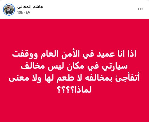 وقال المجالي، في منشور له عبر منصات التواصل الاجتماعي، إنه فوجئ بتسجيل مخالفة على مركبته، رغم أنها كانت متوقفة في مكان غير مخالف، مشيرًا إلى أن هذه المخالفة "لا طعم لها ولا معنى".
