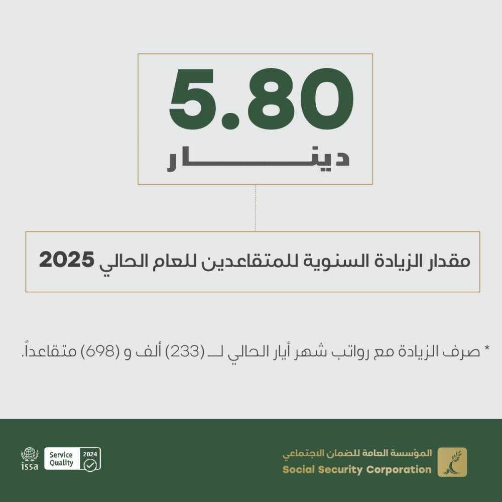 أعلنت المؤسسة العامة للضمان الاجتماعي أن قيمة الزيادة السنوية المقررة على رواتب المتقاعدين للعام الحالي 2025 بلغت خمسة دنانير وثمانين قرشاً، وذلك استناداً إلى أحكام قانون الضمان الاجتماعي رقم (1) لسنة 2014 وتعديلاته.