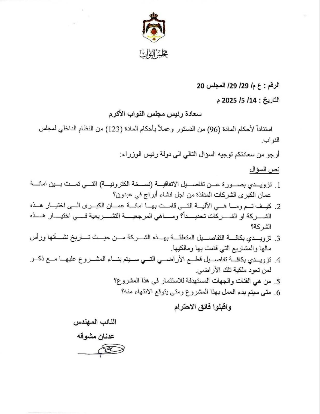 وجّه النائب المهندس عدنان مشوقة سؤالاً نيابياً إلى دولة رئيس الوزراء، استناداً لأحكام المادة (96) من الدستور وعملاً بأحكام المادة (123) من النظام الداخلي لمجلس النواب، طالب فيه بكشف تفاصيل الاتفاقية المبرمة بين أمانة عمان الكبرى والشركات المنفذة لمشروع إنشاء أبراج في منطقة عبدون.