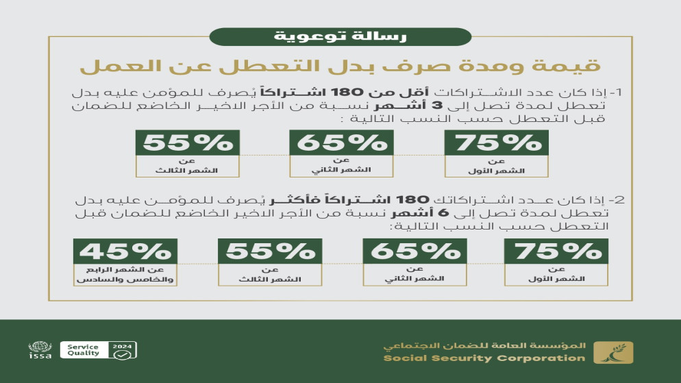 وأكدت المؤسسة، في بيان صحفي صادر عن مركزها الإعلامي، أن صرف بدل التعطل عن العمل يبدأ من بداية الشهر الذي يلي تقديم الطلب، ولا يتم صرف البدل عن الشهر الذي انتهت فيه خدمة المؤمن عليه، موضحةً أن المؤمن عليه يُصرف له بدل تعطل مؤقت لمدة تصل إلى (3) أشهر إذا كان عدد اشتراكاته في الضمان أقل من (180) اشتراكاً، حيث يحصل على (75%) من أجره الأخير المشمول بالضمان عن الشهر الأول، و(65%) عن الشهر الثاني، و(55%) عن الشهر الثالث. أما إذا كان لديه (180) اشتراكاً فأكثر، فيُصرف له بدل تعطل لمدة تصل إلى (6) أشهر، بحيث يحصل على (75%) عن الشهر الأول، و(65%) عن الشهر الثاني، و(55%) عن الشهر الثالث، و(45%) عن كل من الأشهر الرابع والخامس والسادس.