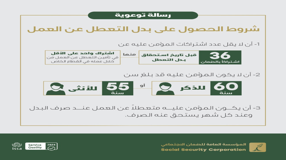 وأوضحت المؤسسة أن المؤمن عليه يحق له الاستفادة من بدل التعطل عن العمل لثلاث مرات فقط طوال فترة شموله بأحكام قانون الضمان الاجتماعي، وذلك بشرط أن لا يقل عدد اشتراكاته الفعلية عن (36) اشتراكاً في كل مرة قبل تاريخ استحقاقه للبدل، مؤكدةً أن المؤمن عليه يكون مشمولاً بالضمان خلال الفترة المصروف عنها بدل تعطل عن العمل وهي فترات خدمة فعلية.