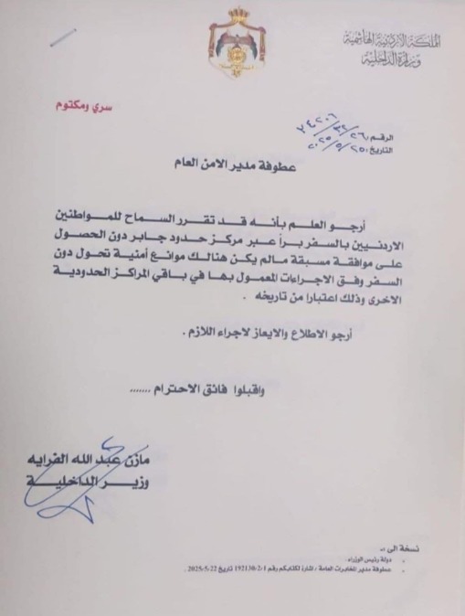 قرر وزير الداخلية، مازن الفراية، السماح للمواطنين الأردنيين بالسفر برّا عبر مركز حدود جابر دون الحصول على موافقة مسبقة.