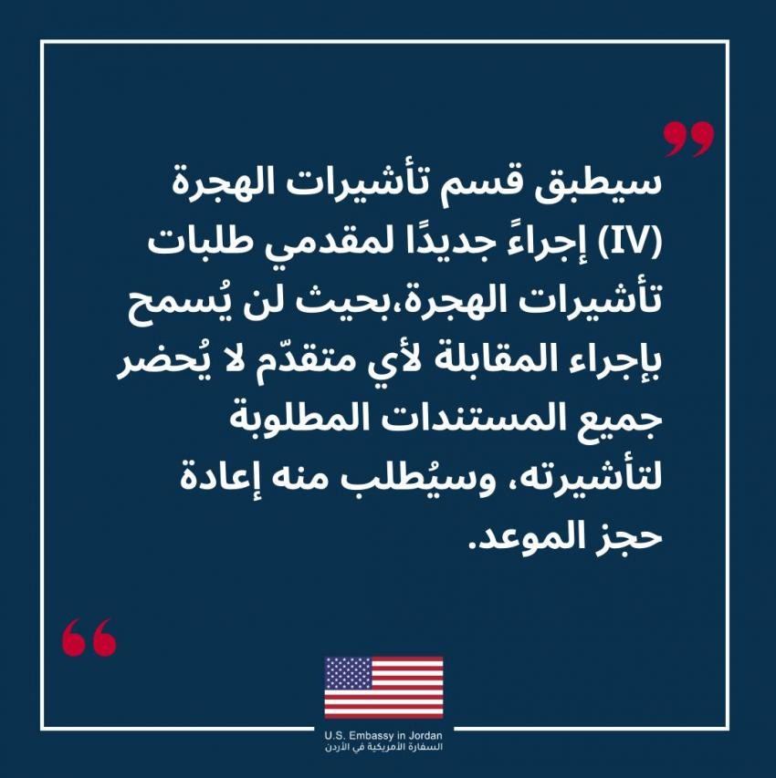 أعلنت السفارة الأمريكية في الأردن، أن قسم تأشيرات الهجرة (IV) سيطبق إجراءً جديدًا لمقدمي طلبات تأشيرات الهجرة، ابتداءً من ١ حزيران ٢٠٢٥، بحيث لن يُسمح بإجراء المقابلة لأي متقدّم لا يُحضر جميع المستندات المطلوبة لتأشيرته.