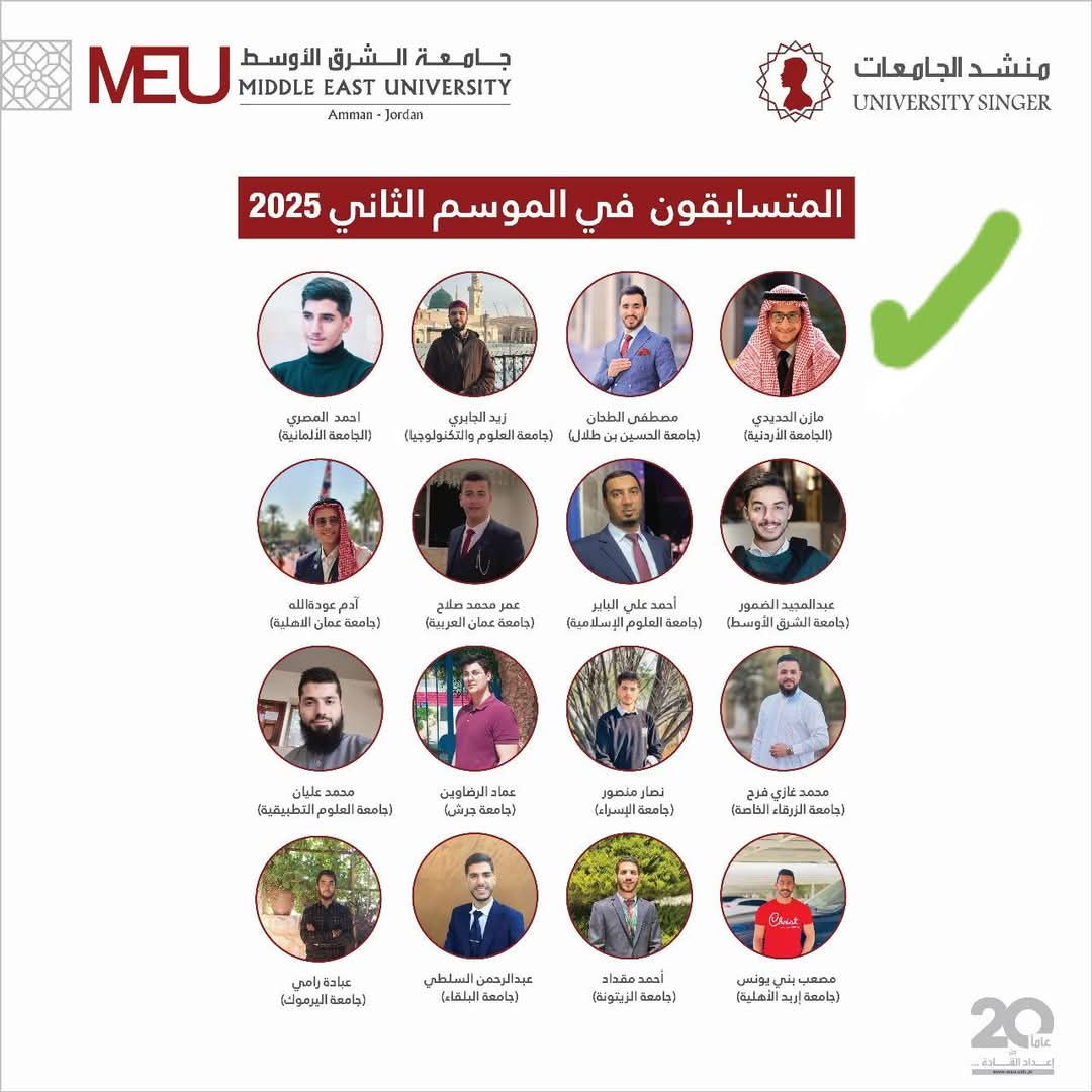 في إنجاز جديد يُضاف إلى رصيده الفني، فاز الشاب مازن عودةالله الحديدي بالمركز الأول في الموسم الثاني من مسابقة "منشد الجامعات"، والتي تنظمها جامعة الشرق الأوسط (MEU) بالتعاون مع عدد من الجامعات الأردنية.