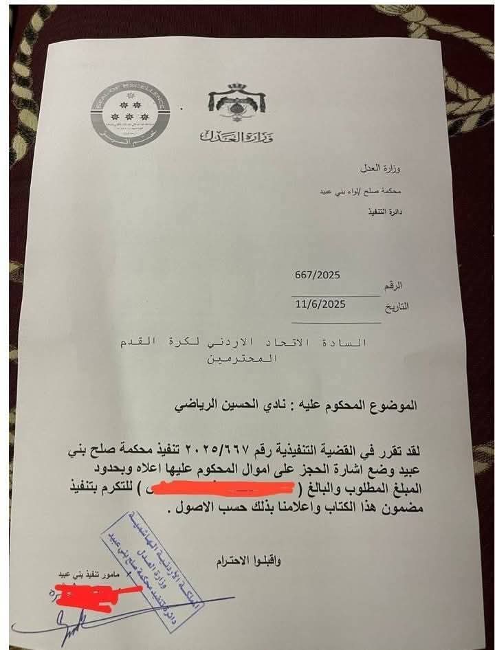 تلقى نادي الحسين إربد، اليوم الأربعاء، قراراً رسمياً من دائرة التنفيذ في محكمة صلح لواء بني عبيد – التابعة لوزارة العدل – يقضي بالحجز على أموال النادي المودعة لدى البنوك المعتمدة.