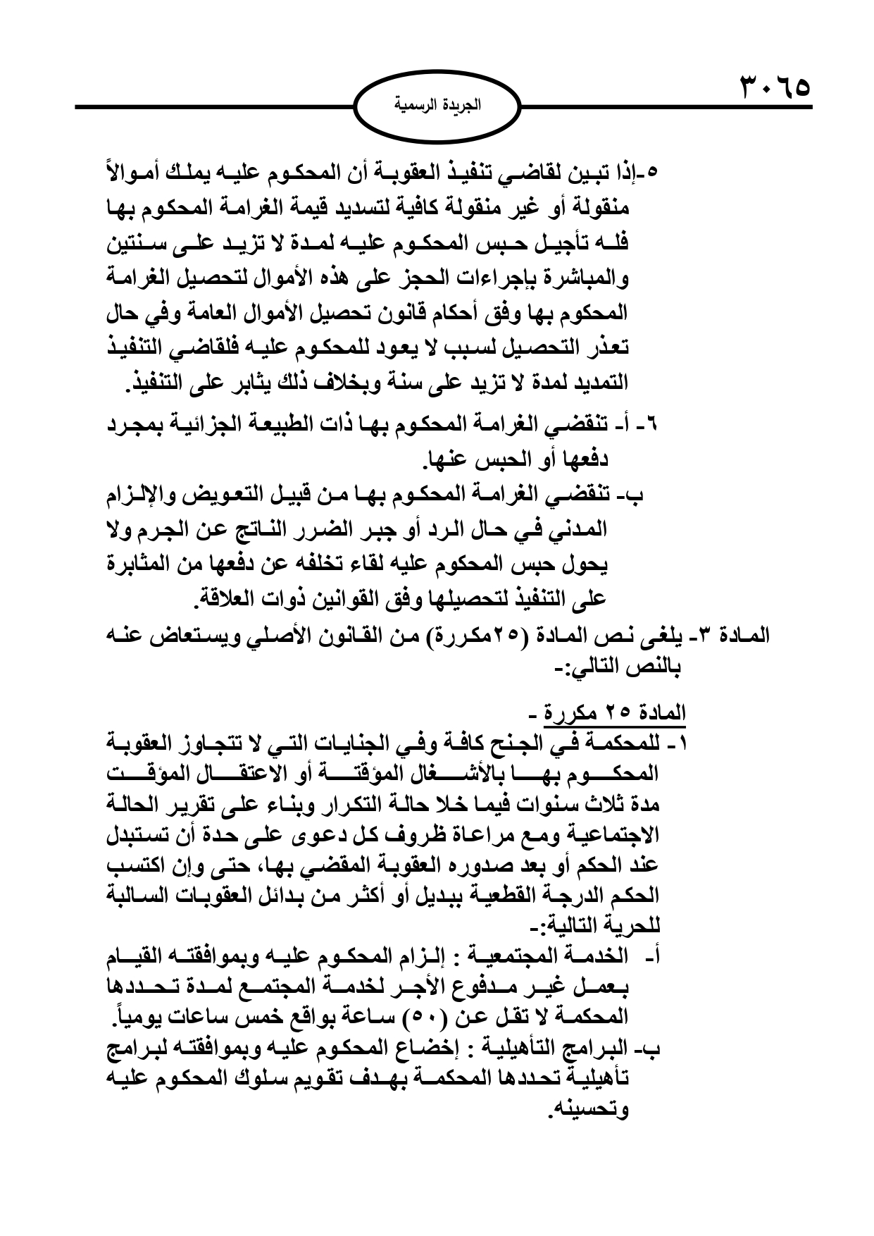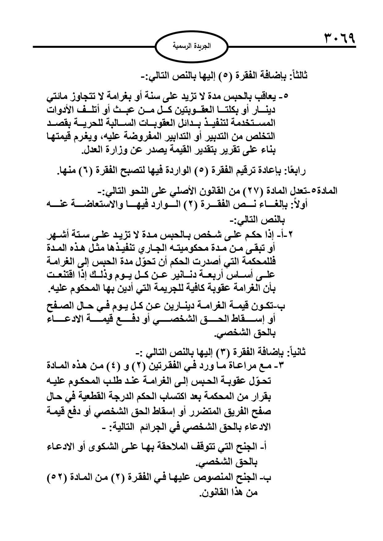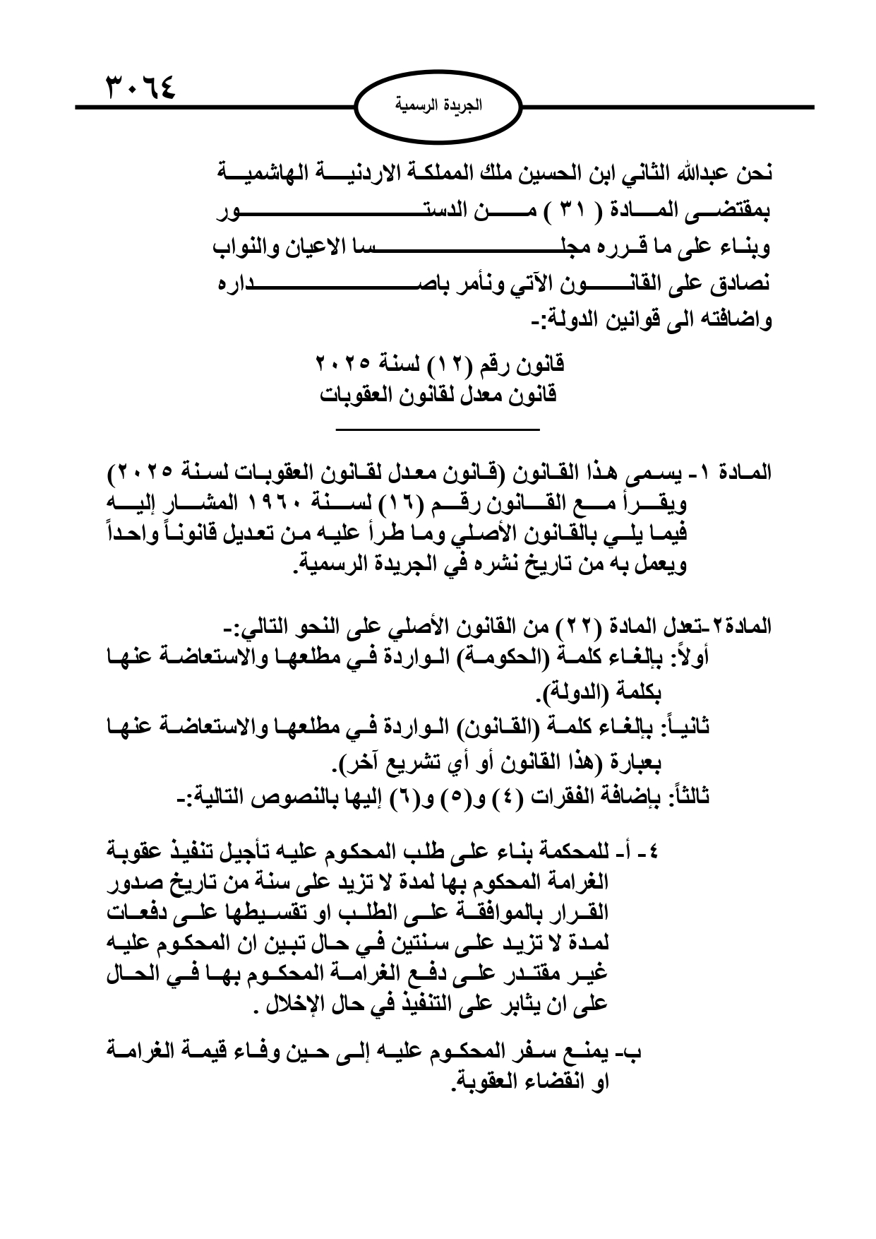 صدر في عدد الجريدة الرسمية الصادر اليوم الاثنين، قانون معدل لقانون العقوبات لسنة 2025.