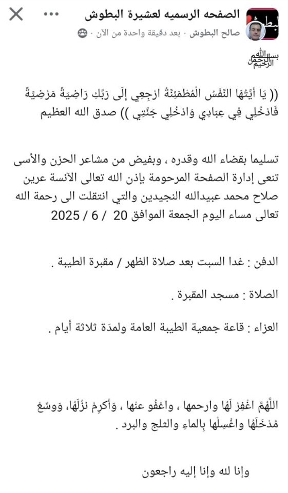 وتقدم الجميع من أسرة الفقيدة بأصدق مشاعر التعزية والمواساة، سائلين الله أن يتغمدها بواسع رحمته، ويلهم أهلها الصبر والرضا.