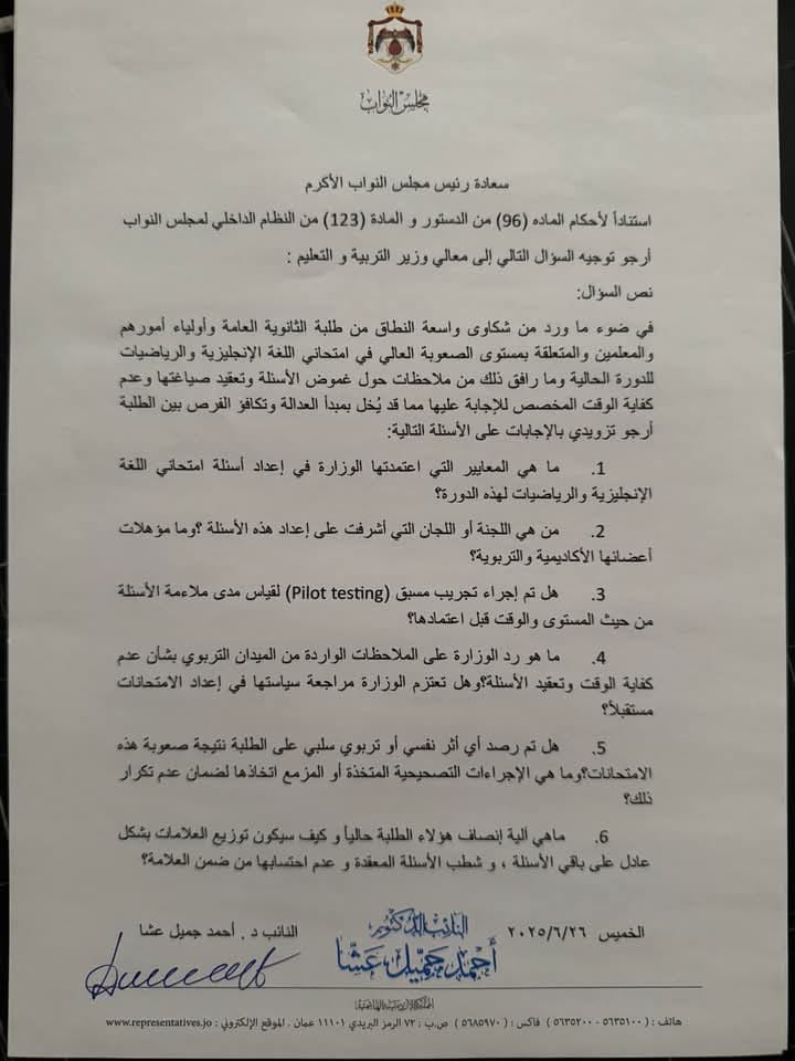 وتساءل عشا في سؤاله النيابي عن المعايير التي اعتمدت في إعداد الامتحانات، واللجان التي أشرفت عليها، متطرقًا إلى مؤهلات أعضائها الأكاديمية والتربوية، كما طالب بالكشف عما إذا كانت الوزارة قد أجرت اختبارات تجريبية (Pilot Testing) للأسئلة قبل اعتمادها.
