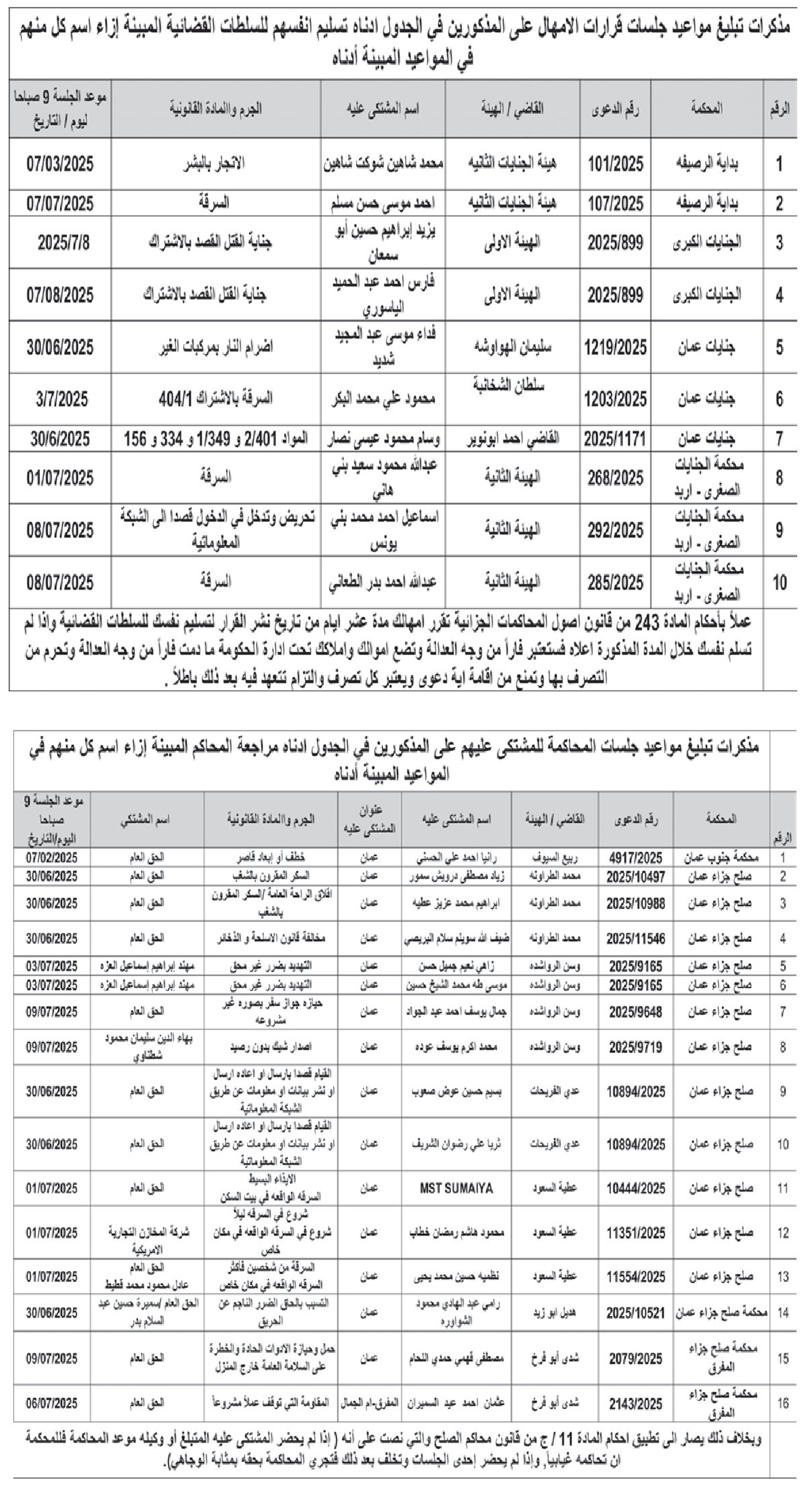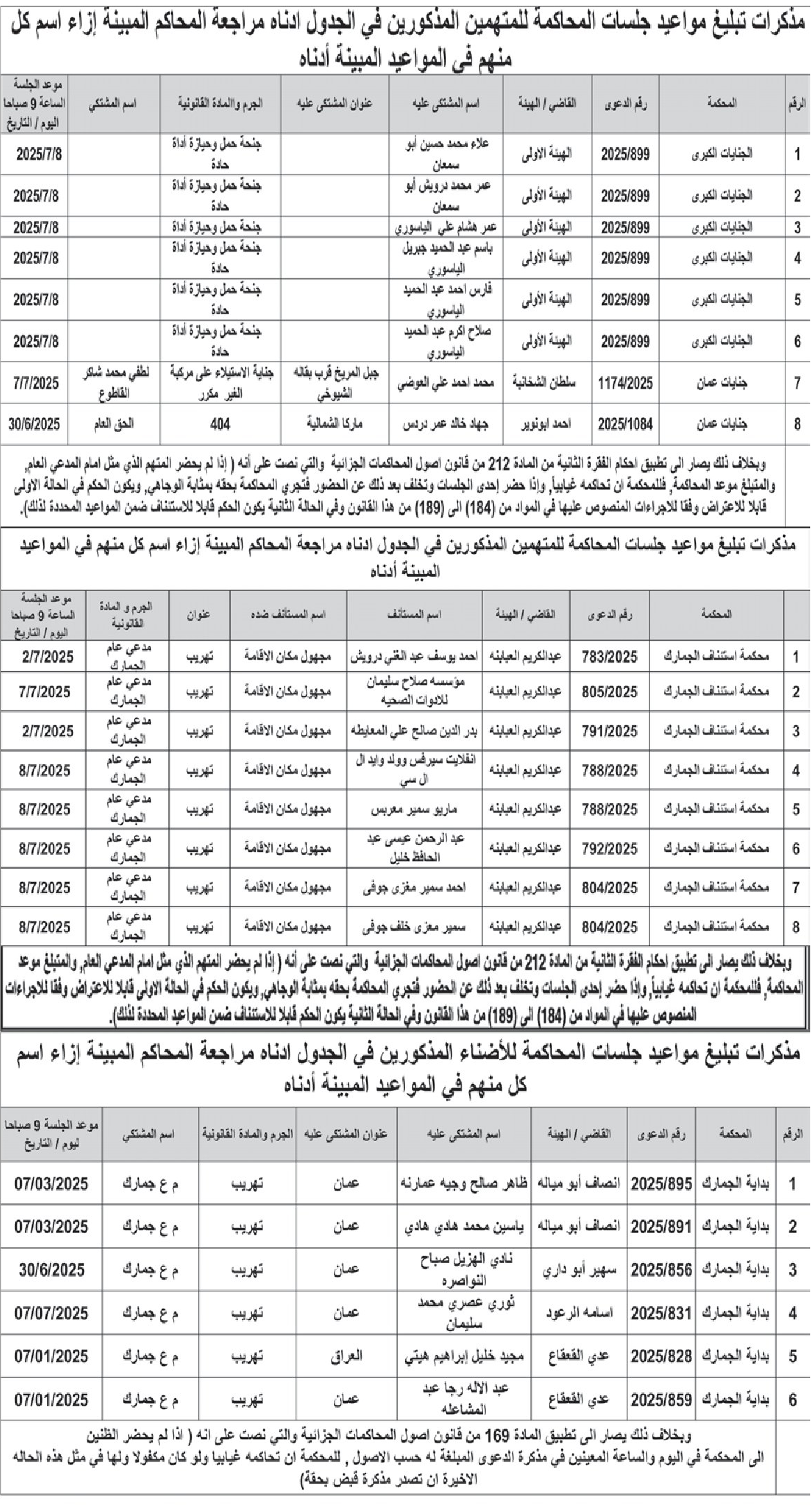أصدرت جهات قضائية مختصة، صباح اليوم الإثنين، مذكرات تبليغ رسمية وقرارات إمهال بحق عدد من المواطنين الأردنيين، شملت مشتكى عليهم، متّهمين، وأظناء في قضايا متعددة، وذلك في سياق الاستدعاءات القانونية المتعلقة بسير المحاكمات.