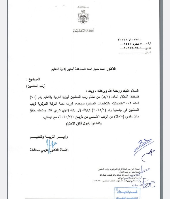 صدر قرار وزير التربية والتعليم بترقية الدكتور أحمد المساعفة إلى رتبة "إداري تربوي قائد"، وتعتبر هذه الرتبة أعلى رتبة في نظام رتب المعلمين في التربية، حيث سبق أن حصل على الرتبة السابقة لها "إداري تربوي خبير" عام 2018.