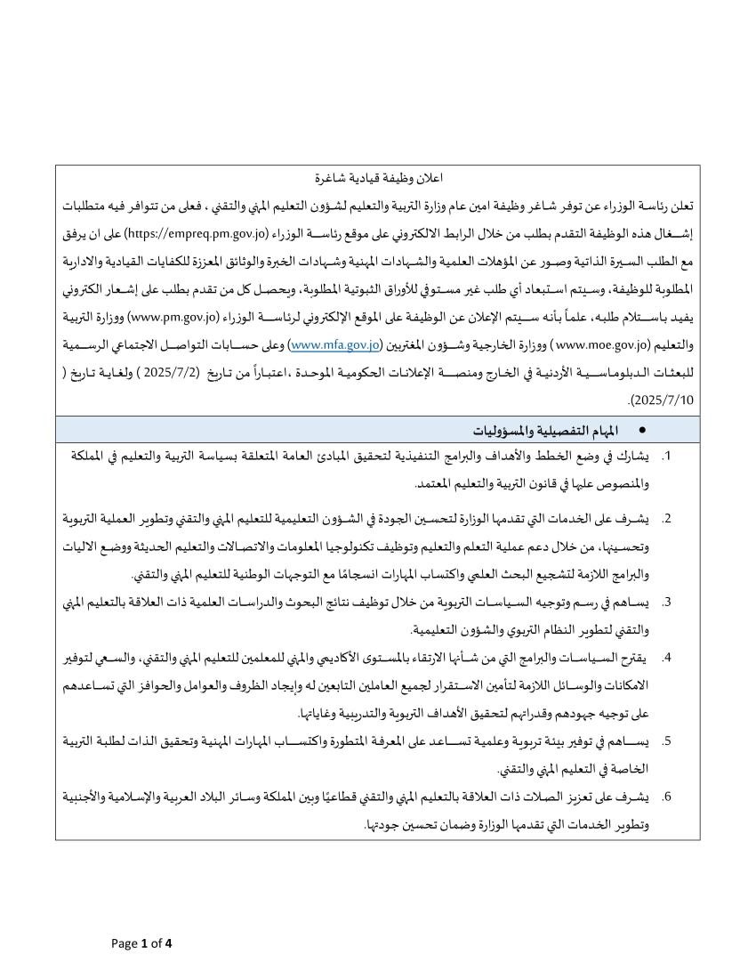أعلنت رئاسة الوزراء، اليوم الأربعاء، عن شاغر وظيفي لمنصب أمين عام وزارة التربية والتعليم لشؤون التعليم المهني والتقني، داعية الراغبين ممّن تنطبق عليهم الشروط إلى التقدّم خلال الفترة المحددة.