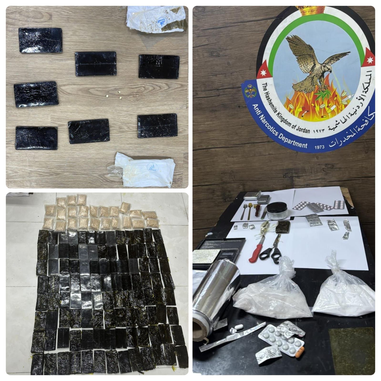 وفي لواء عين الباشا تمت مداهمة تاجر للمخدرات وأُلقي القبض عليه وضبط بحوزته 76 كف حشيش، فيما وضُبط سبع كفوف حشيش بحوزة مروج للمخدرات في محافظة الزرقاء.