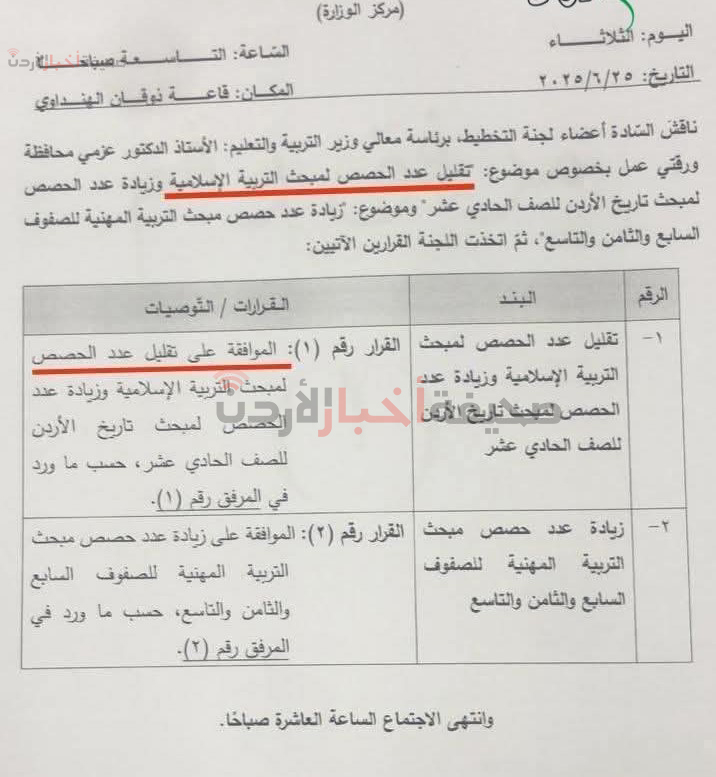 وأشار إلى أن قرار رفع عدد حصص مادة تاريخ الأردن من 3 إلى 4 حصص أسبوعيا جاء استجابة لحاجة الميدان إلى وقت إضافي لتغطية المادة بشكل كافٍ، ولضمان إيصال المفاهيم التاريخية للطلبة بشكل أفضل.