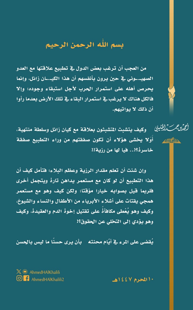 وفي بيان نشره عبر حسابه الرسمي على منصة "إكس"، قال الخليلي: "من العجب أن ترغب بعض الدول في تطبيع علاقاتها مع العدو الصهيوني، في حين يرون بأنفسهم أن هذا الكيان زائل، وإنما يحرص أهله على استمرار الحرب لأجل استبقاء وجوده، وإلا فالكل هناك لا يرغب في البقاء بعدما أيقن أن الأرض لا تواتيه".