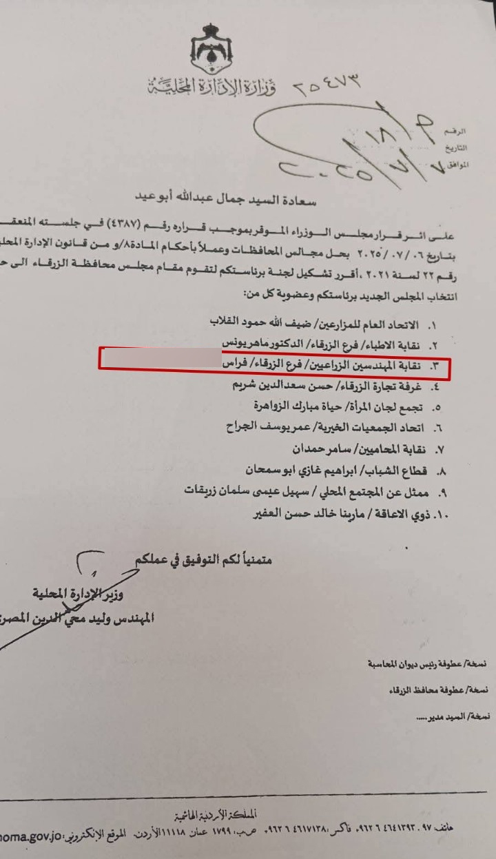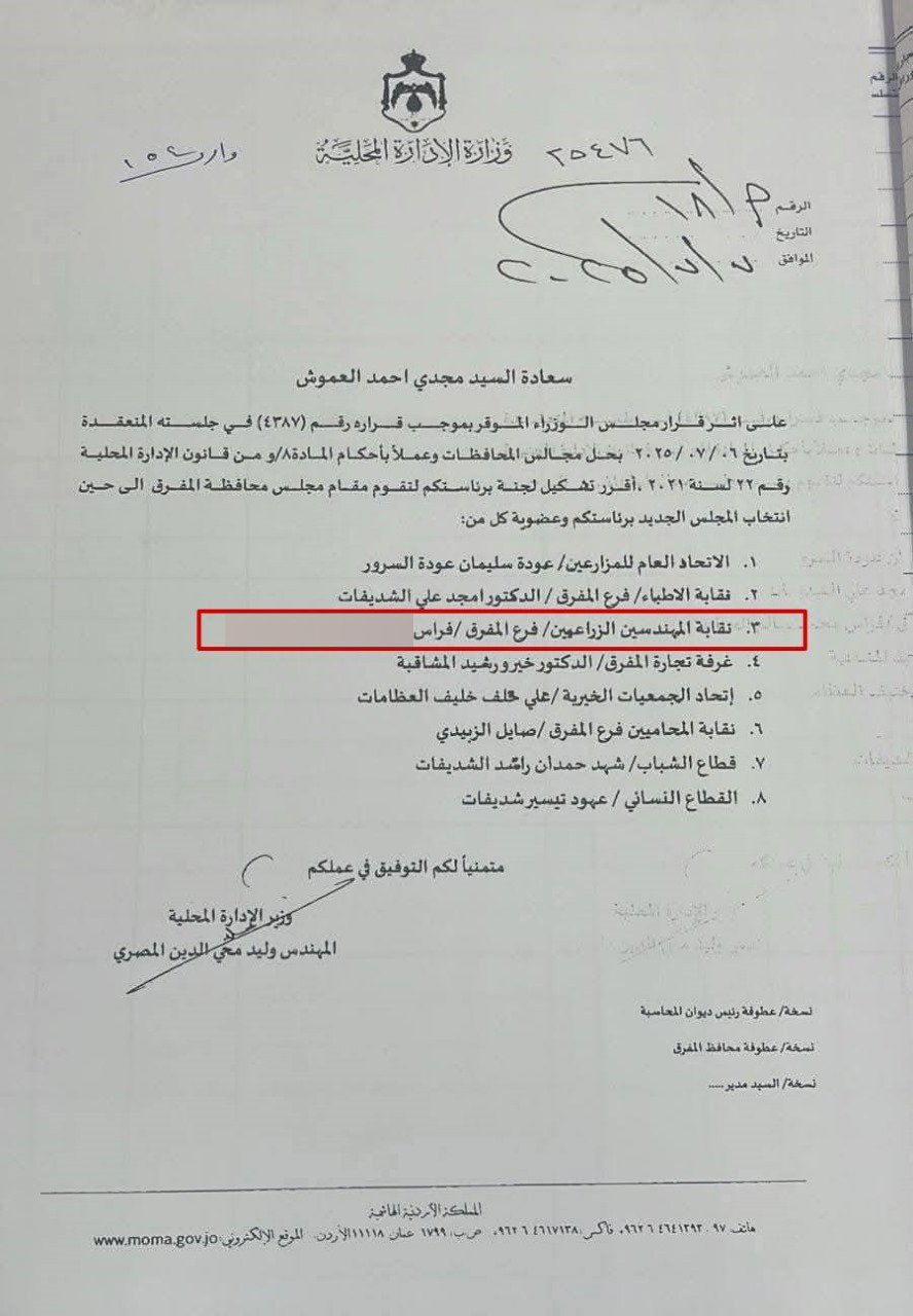 كشفت وثائق رسمية عن تعيين أحد أعضاء نقابة المهندسين الزراعيين لعضوية مجلسي محافظة الزرقاء والمفرق في الوقت ذاته، ما أثار تساؤلات قانونية ومؤسسية حول مشروعية هذا التعيين.