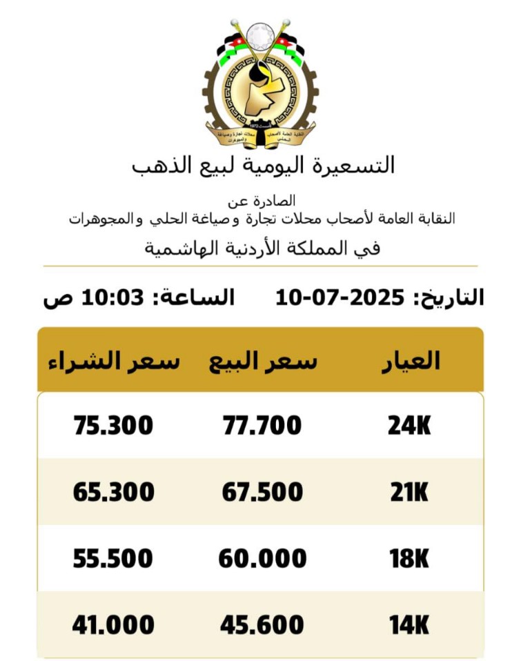 وبلغ سعر بيع غرام الذهب من عيار 21 الأكثر تداولا في السوق الأردنية 67.50 دينار لغايات البيع للمواطنين، مقابل 65 دينارا لجهة الشراء من قبل محال الصاغة.