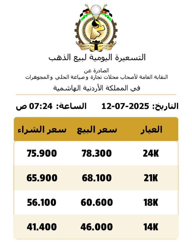 شهدت أسعار الذهب في السوق المحلية الأردنية ارتفاعًا ملحوظًا اليوم السبت، بزيادة بلغت 60 قرشًا للغرام الواحد، وفقًا للتسعيرة الصادرة عن النقابة العامة لأصحاب محلات تجارة وصياغة الحلي والمجوهرات.