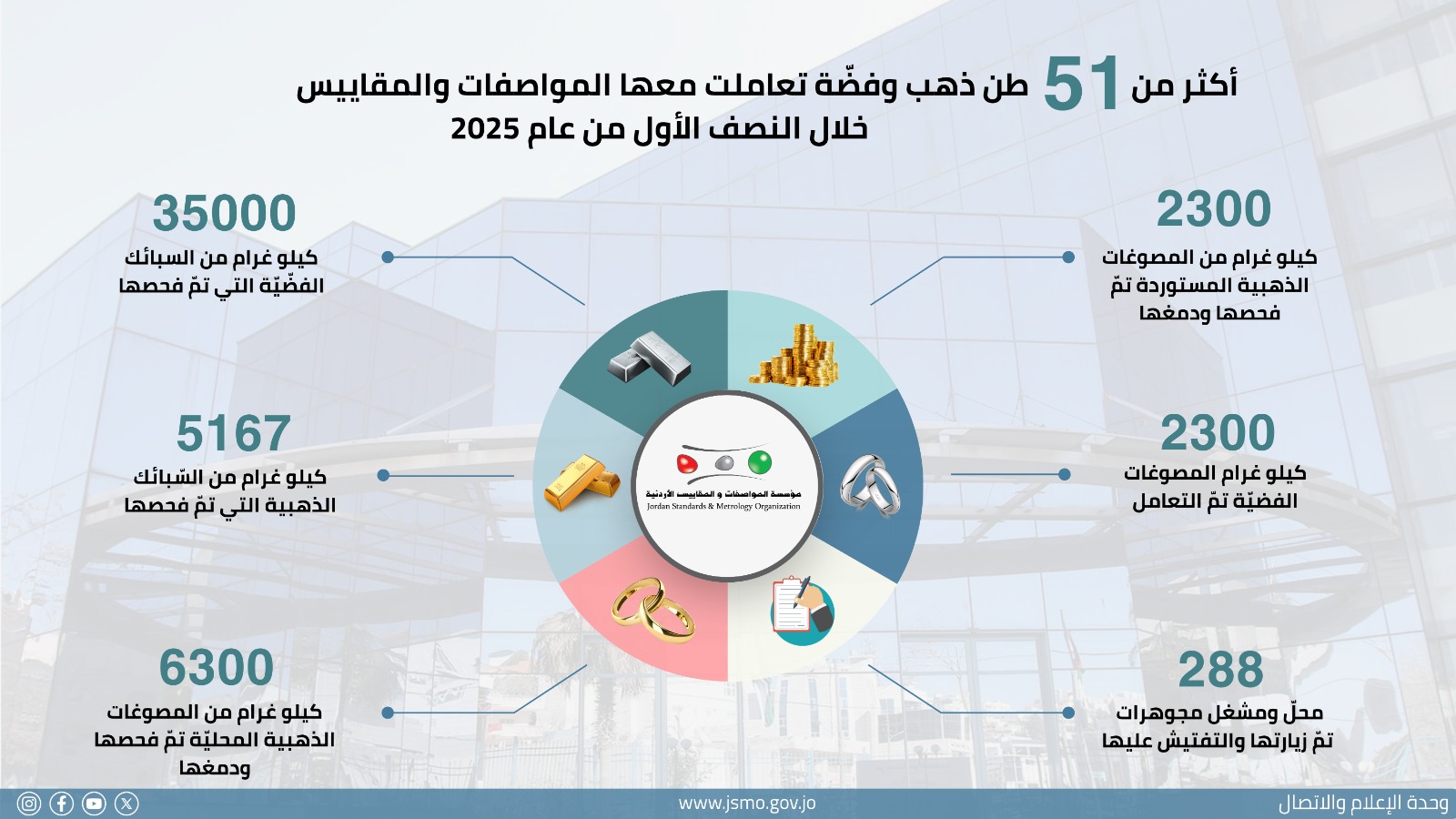 أعلنت مؤسسة المواصفات والمقاييس الأردنية أنها تعاملت خلال النصف الأول من العام الحالي مع أكثر من 51 طنًا من الذهب والفضة، شملت مصوغات، سبائك، ومسكوكات تم تصنيعها محليًا أو استيرادها من الخارج، حيث تم إخضاعها لعمليات الفحص والتدقيق والدمغ للتحقق من مطابقتها للعيارات القانونية المعتمدة.