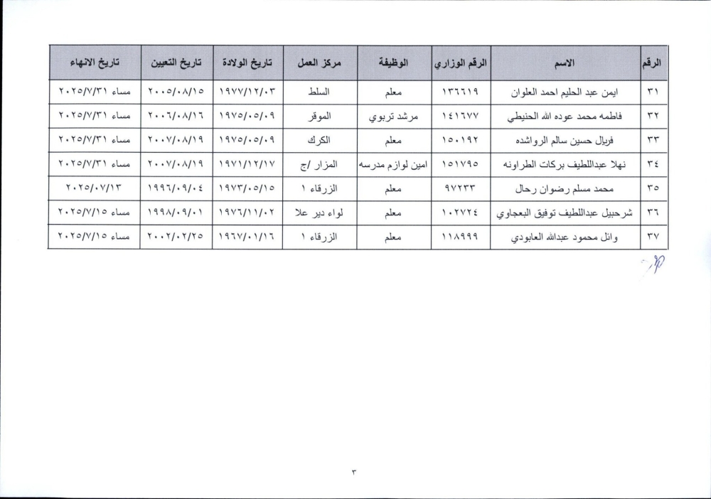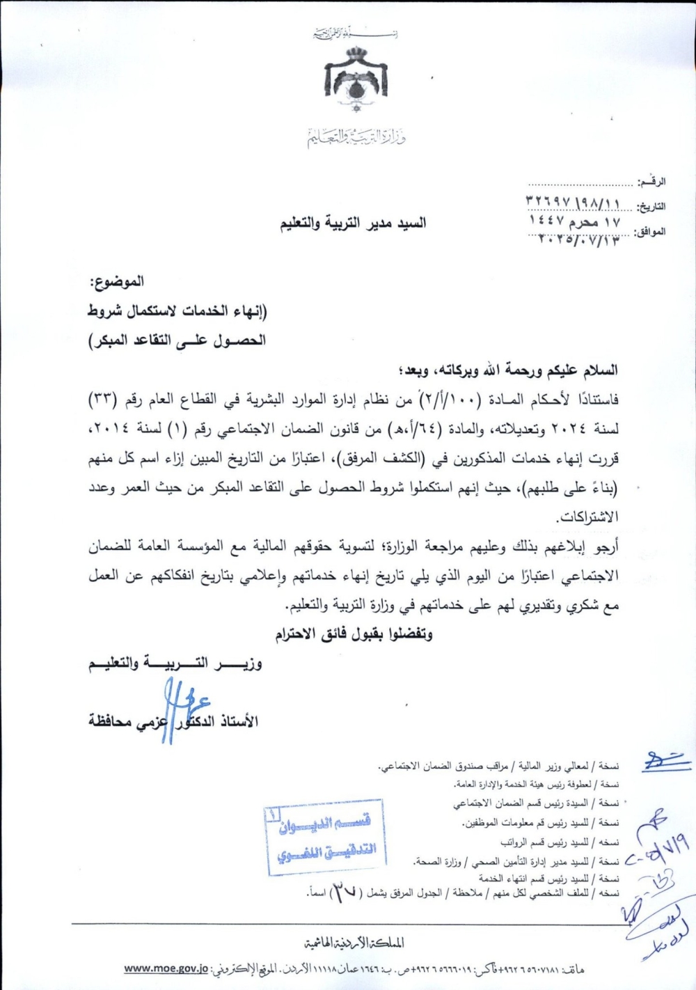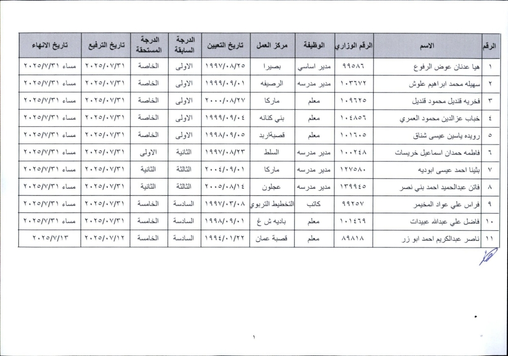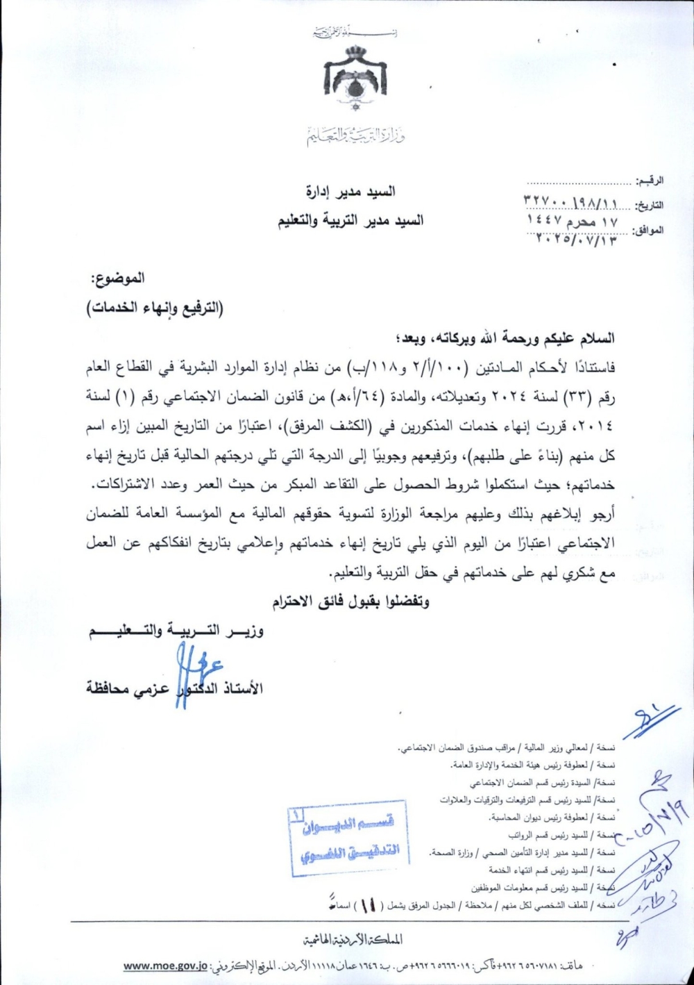 أصدرت وزارة التربية والتعليم عددا من التقاعدات والترفيعات وإنهاء الخدمة وتمديد الإجازة بدون راتب لعدد من موظفيها حسب المرفقات التالية: