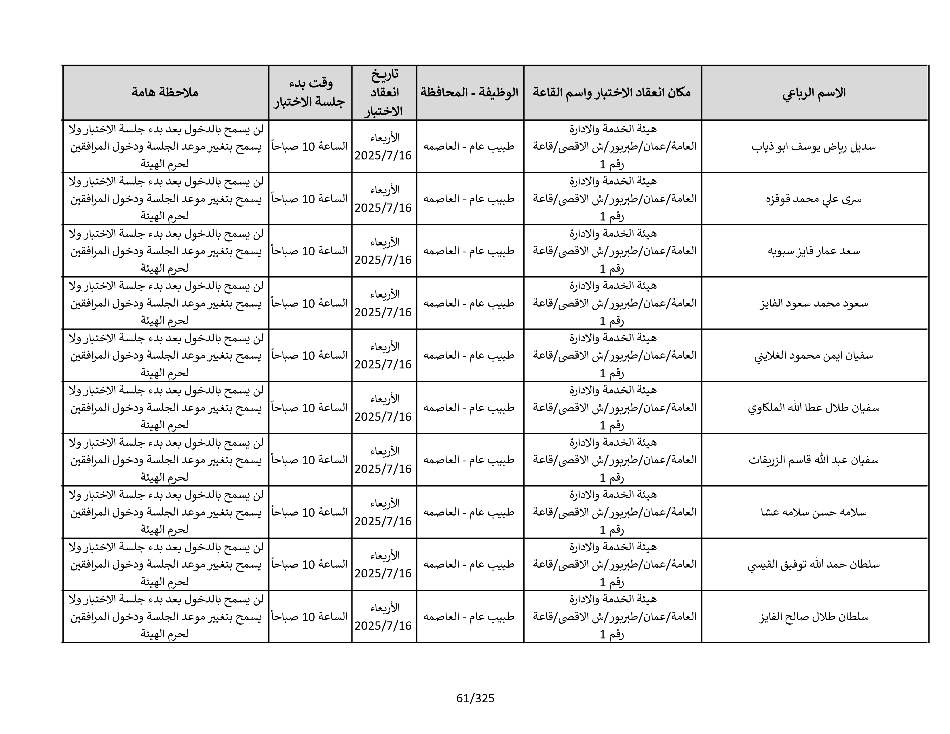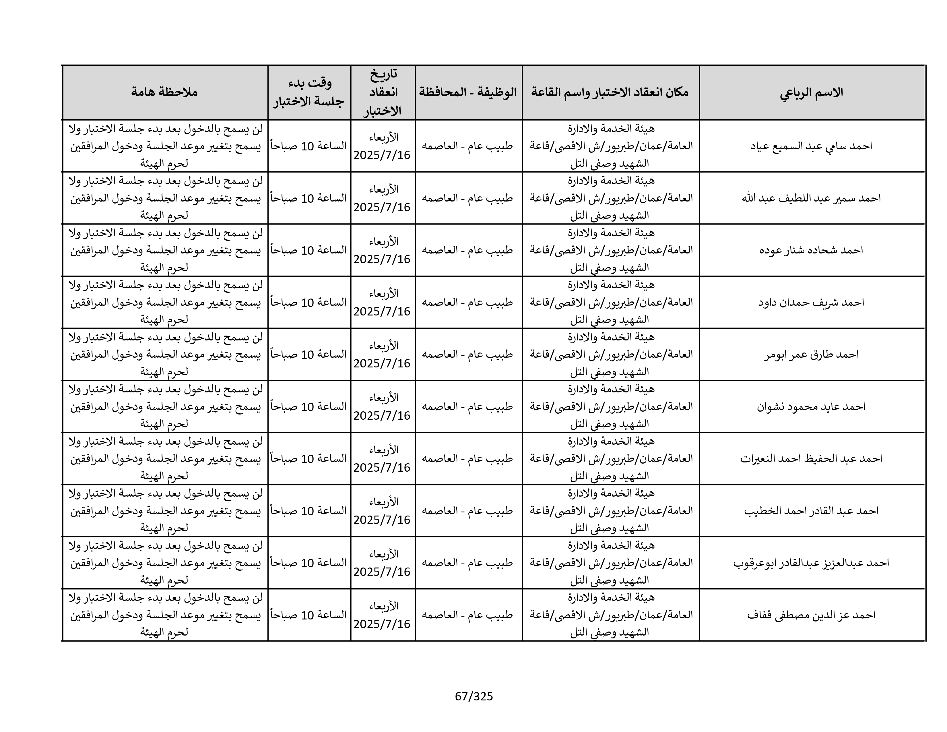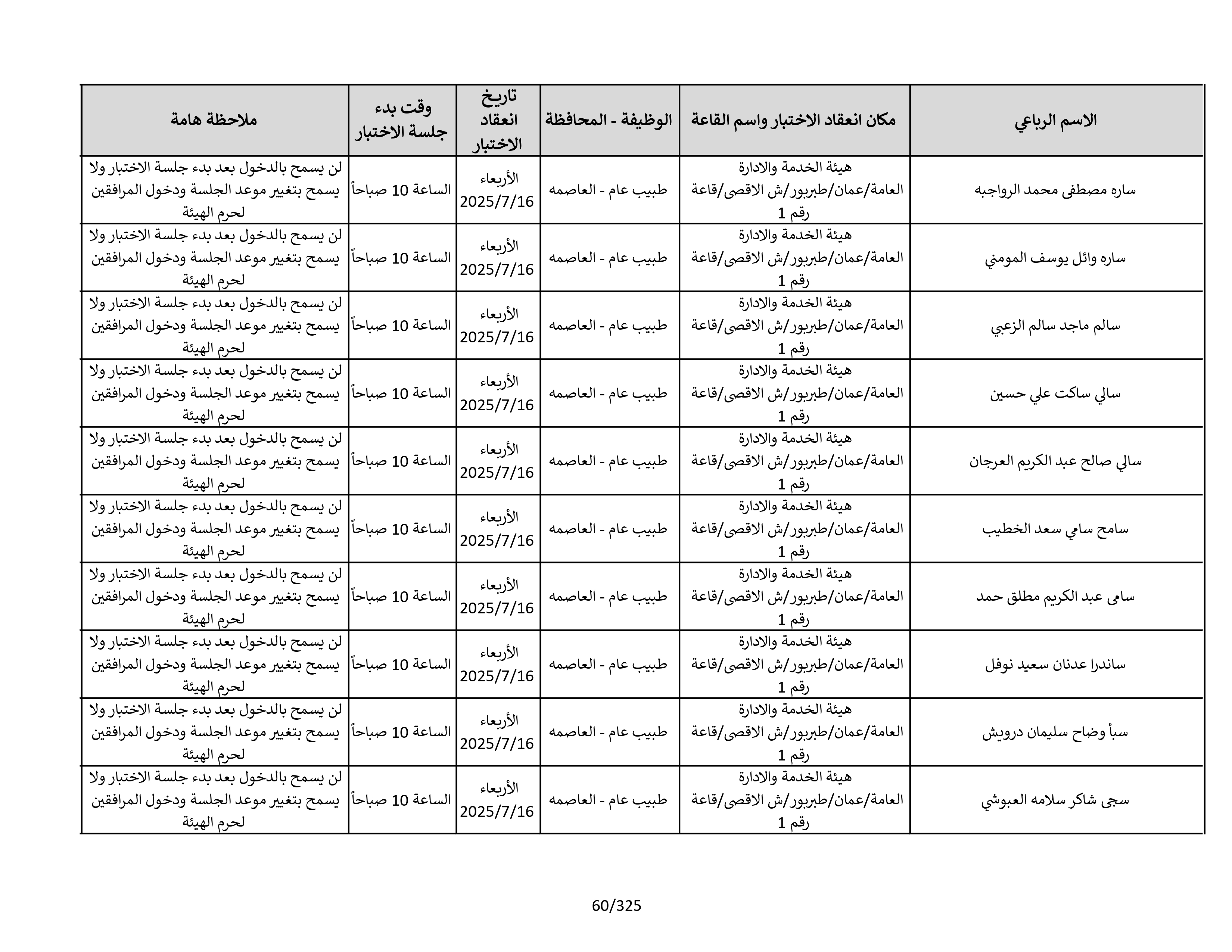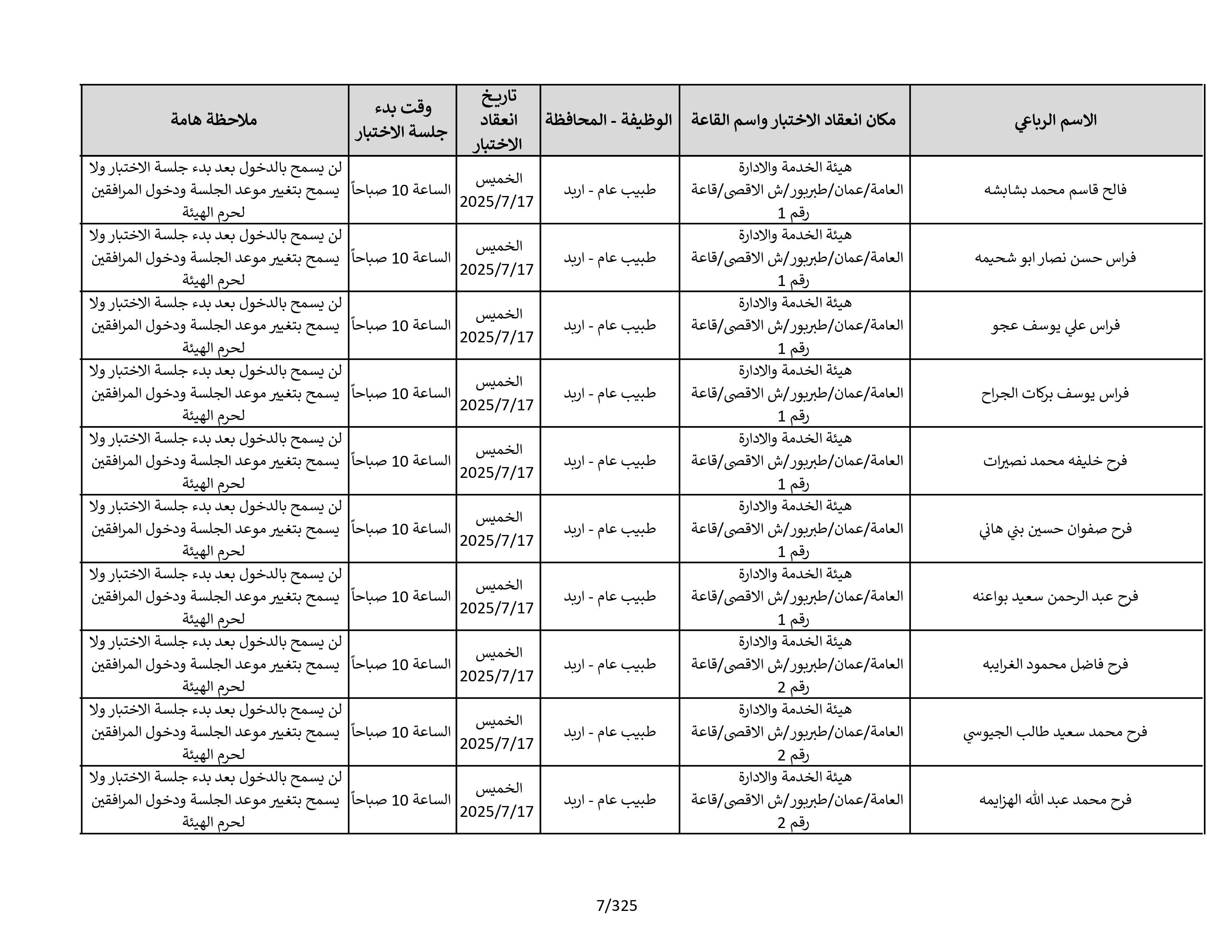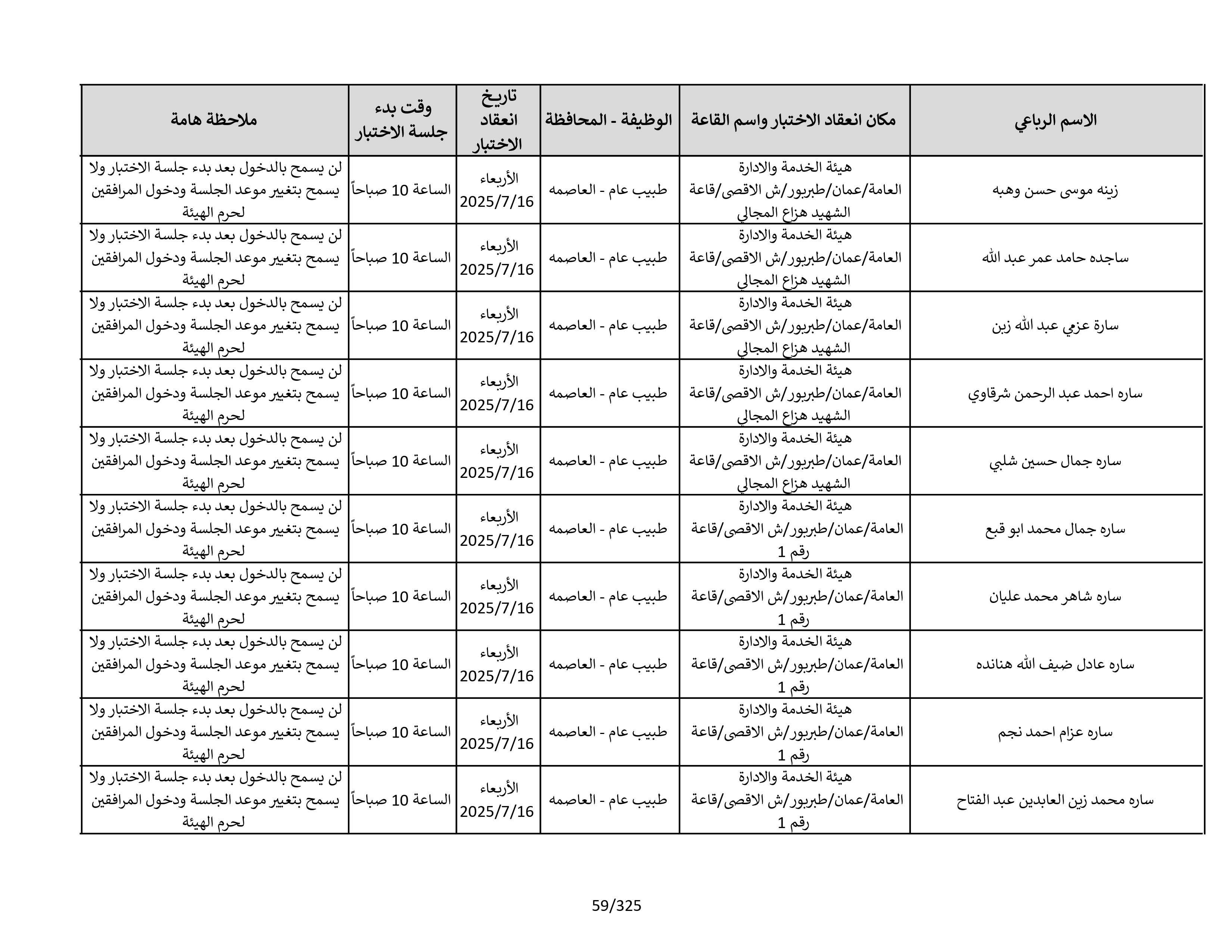 دعت وزارة الصحة المرشحين الواردة أسماؤهم ضمن قوائم المؤهلين، والذين انطبقت عليهم شروط الإعلان السابق، إلى التواجد في مبنى هيئة الخدمة والإدارة العامة / مركز تقييم الكفايات في العاصمة عمّان – منطقة طبربور – شارع الأقصى، وذلك لحضور الاختبار التنافسي الإلكتروني بحسب مجال التخصص الوظيفي لكل مرشح.