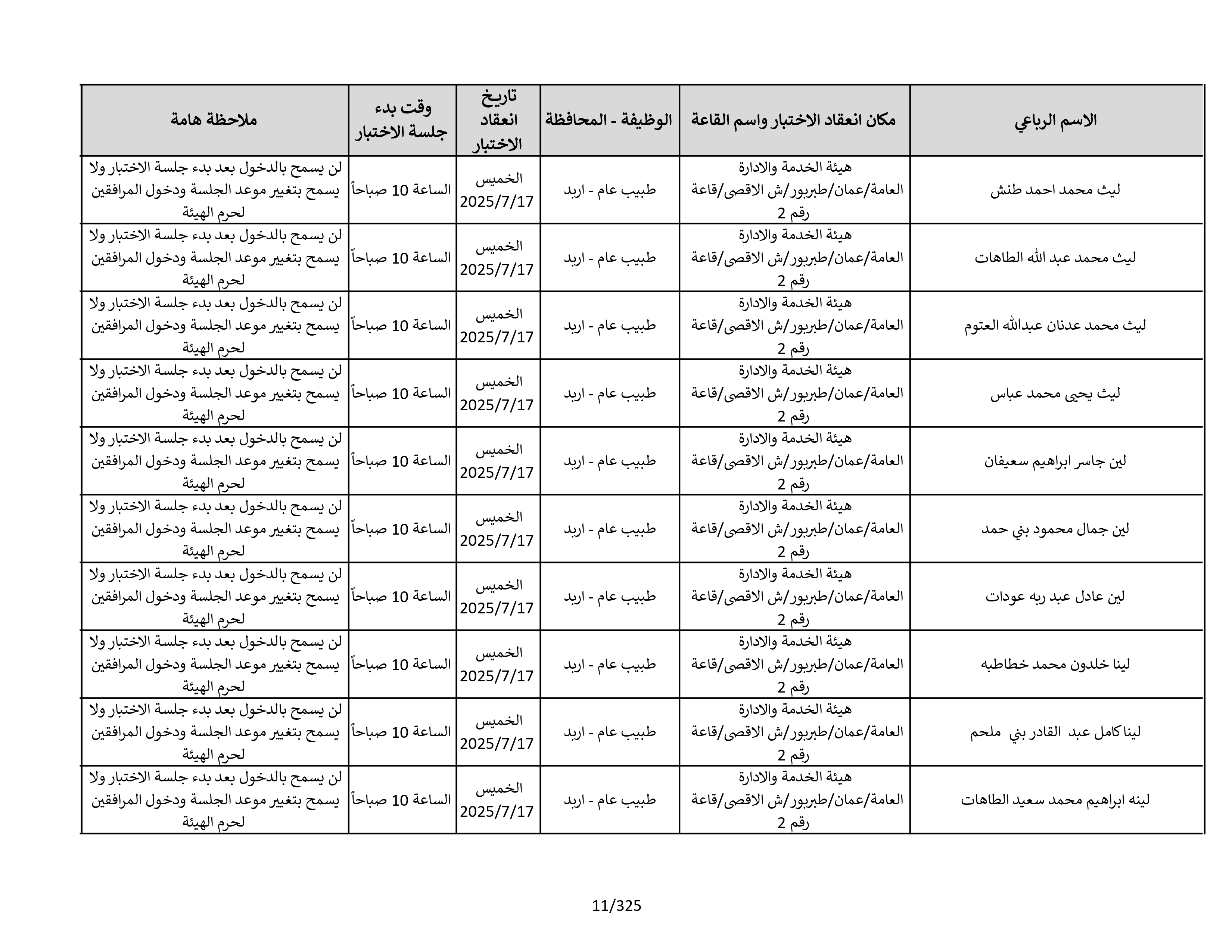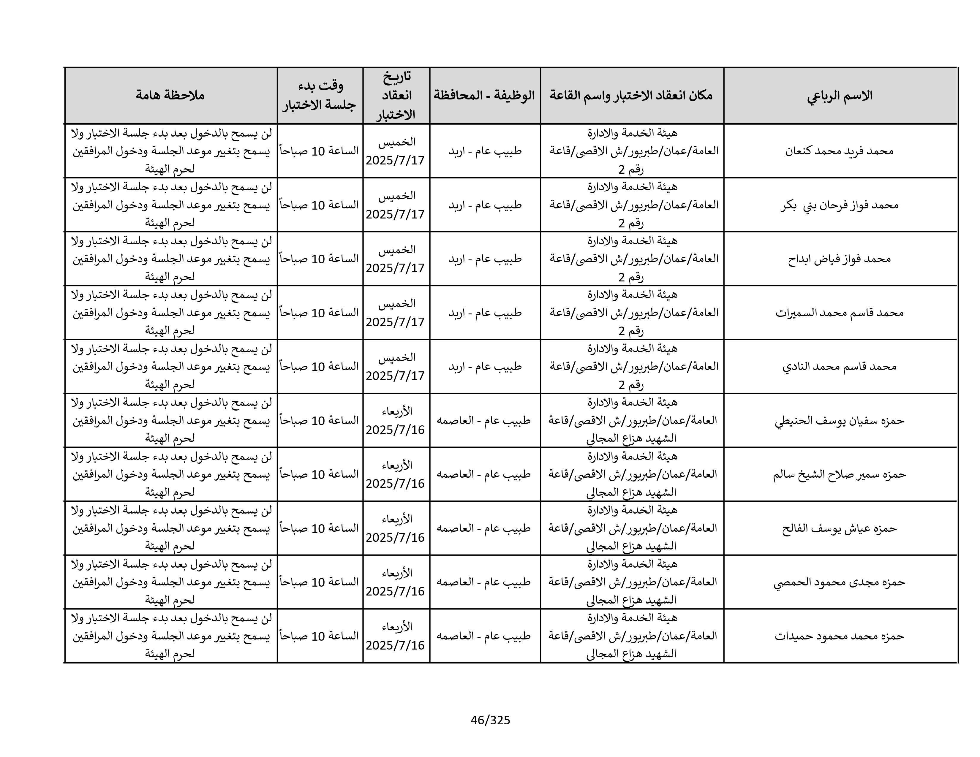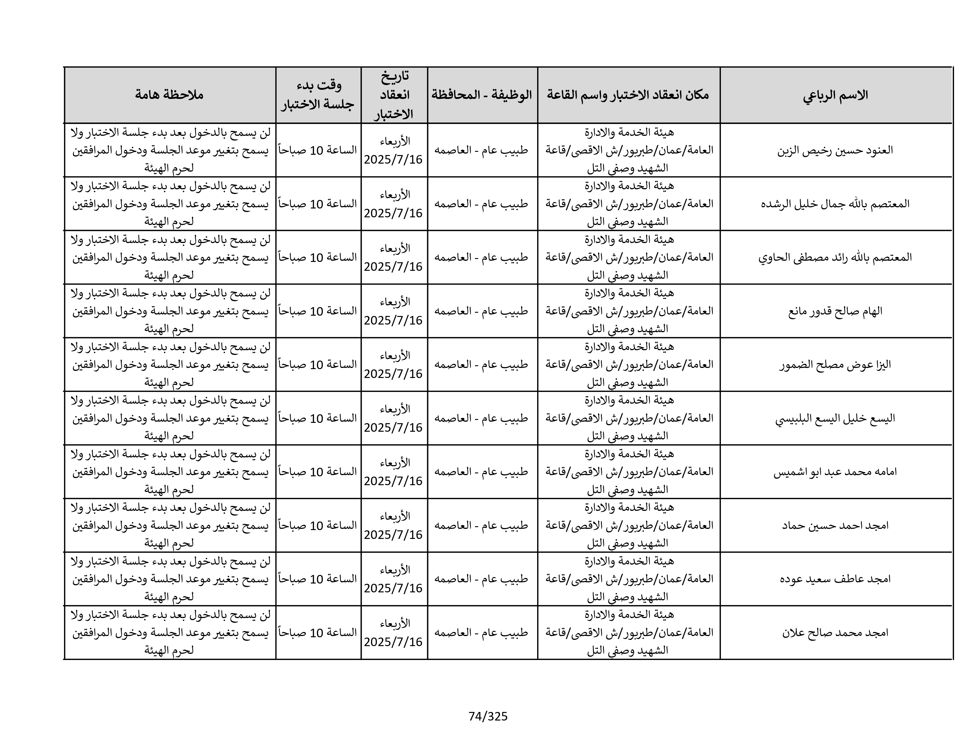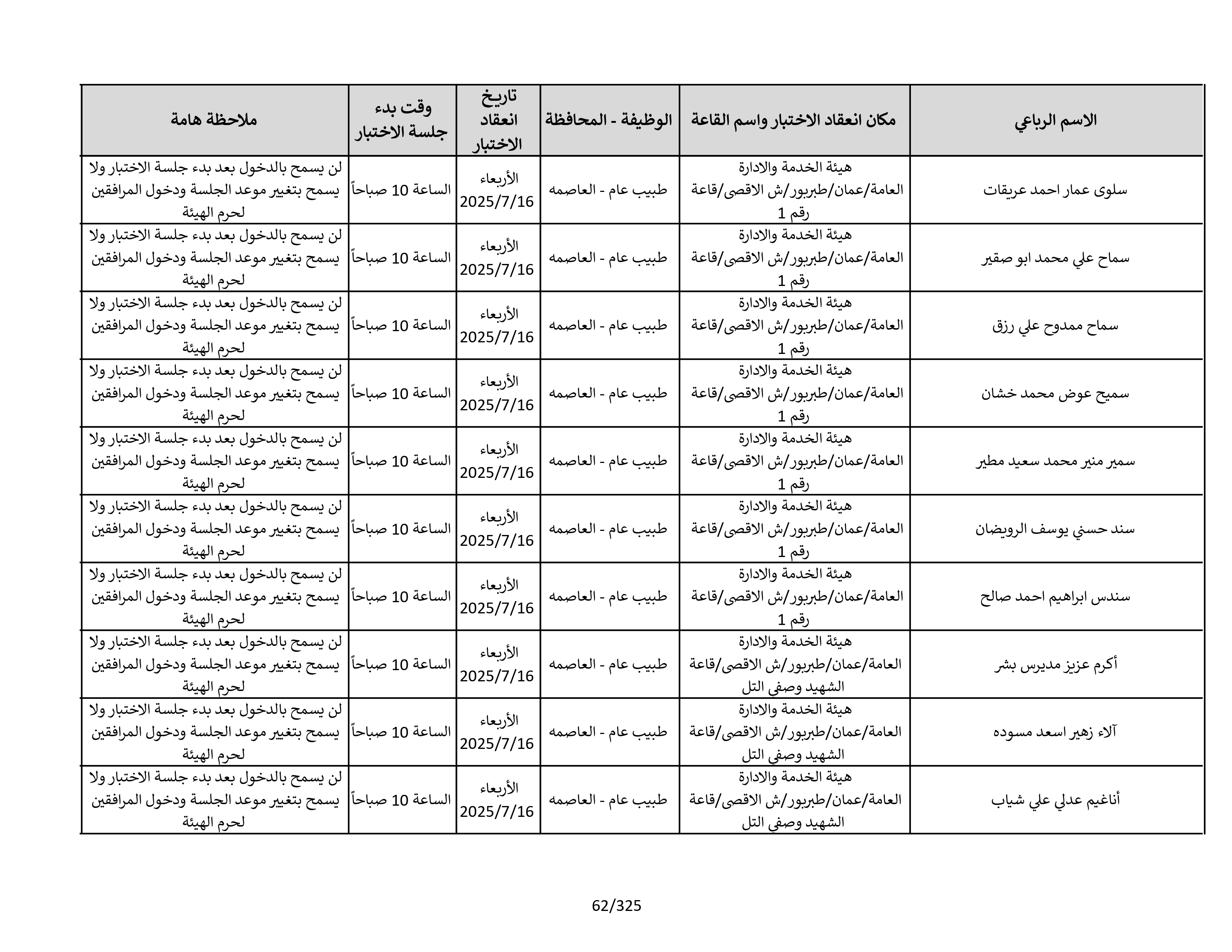 دعت وزارة الصحة المرشحين الواردة أسماؤهم ضمن قوائم المؤهلين، والذين انطبقت عليهم شروط الإعلان السابق، إلى التواجد في مبنى هيئة الخدمة والإدارة العامة / مركز تقييم الكفايات في العاصمة عمّان – منطقة طبربور – شارع الأقصى، وذلك لحضور الاختبار التنافسي الإلكتروني بحسب مجال التخصص الوظيفي لكل مرشح.